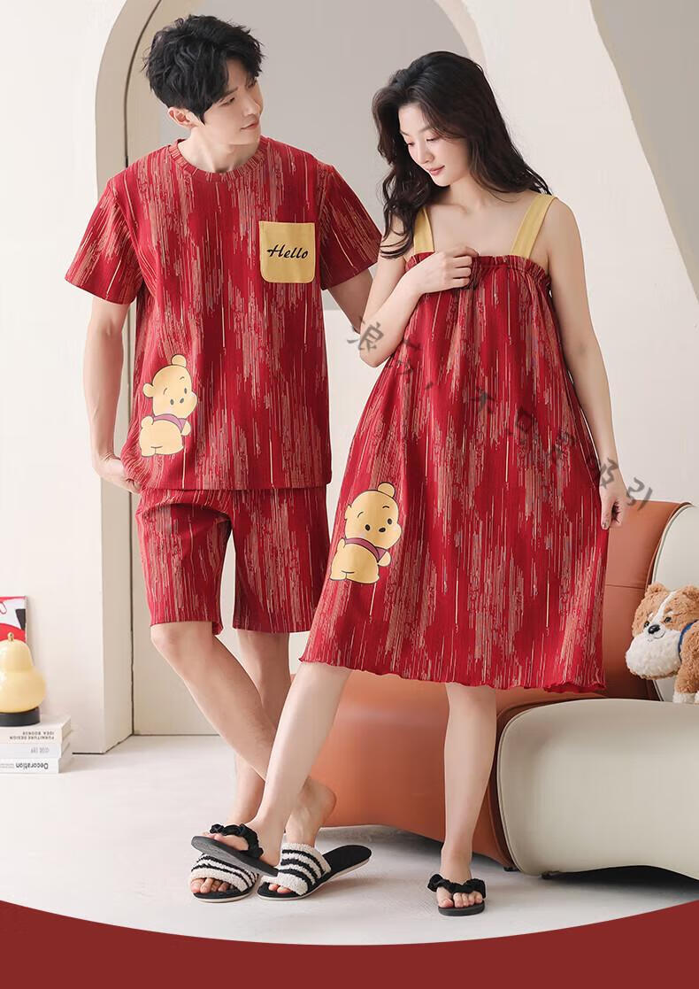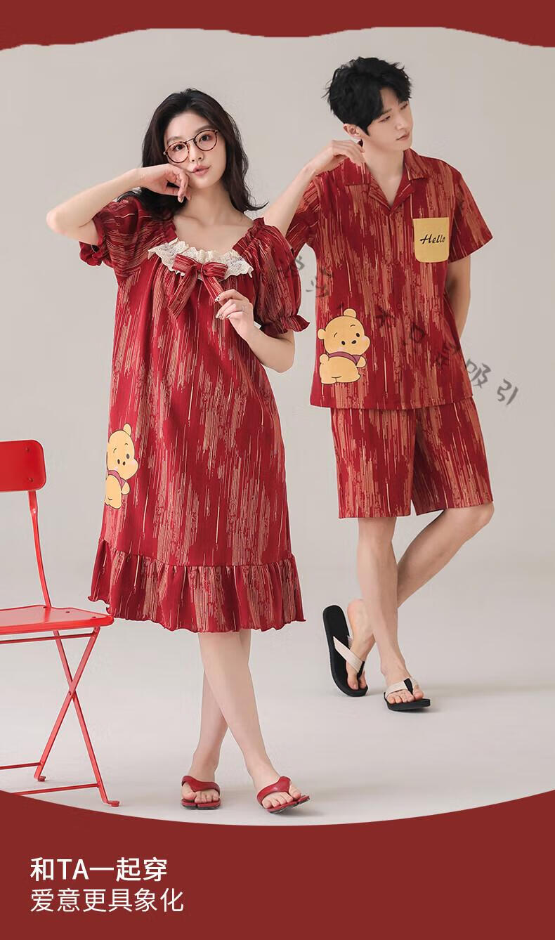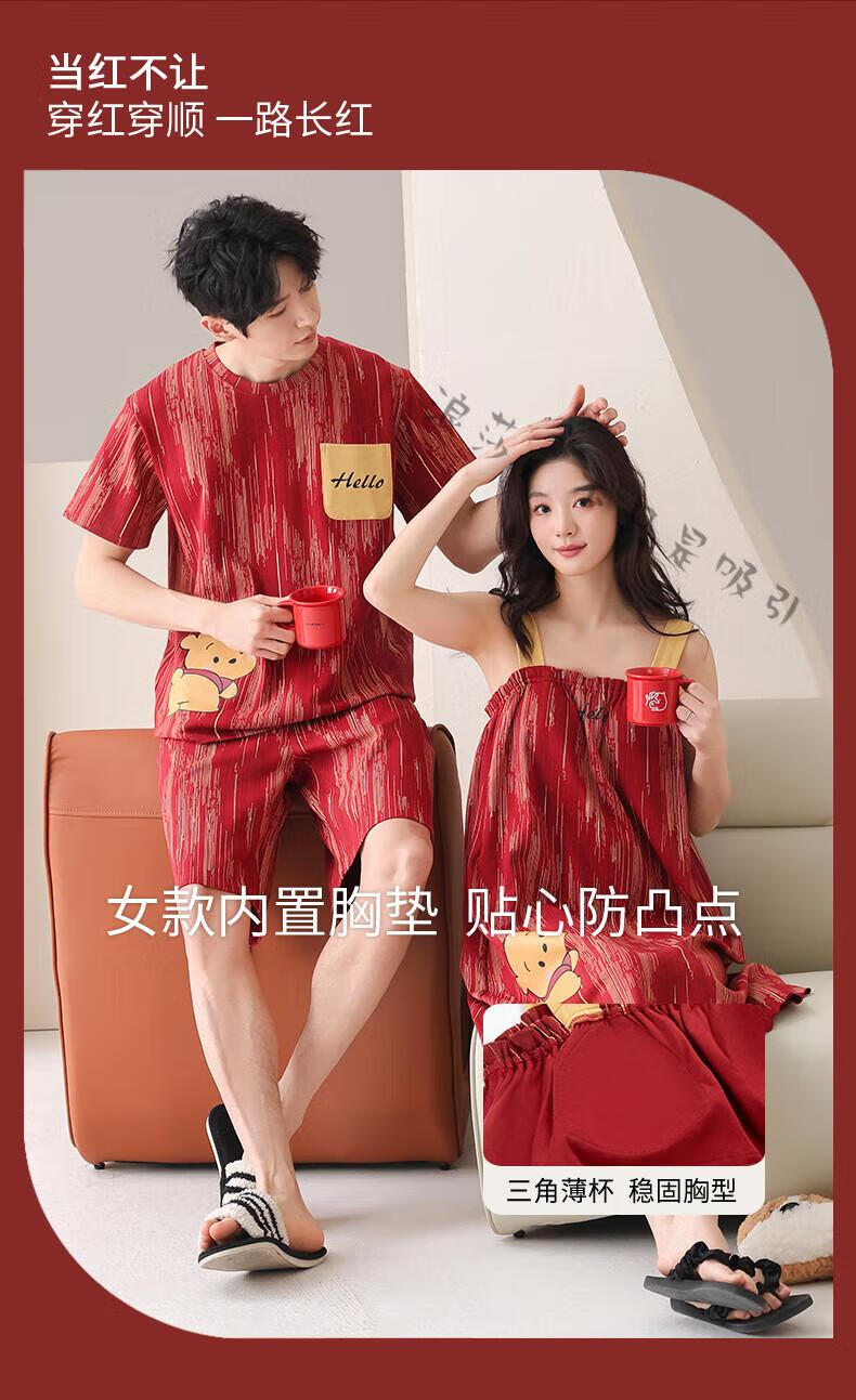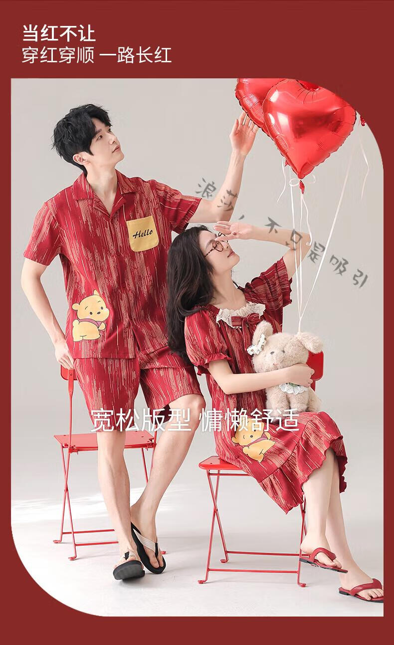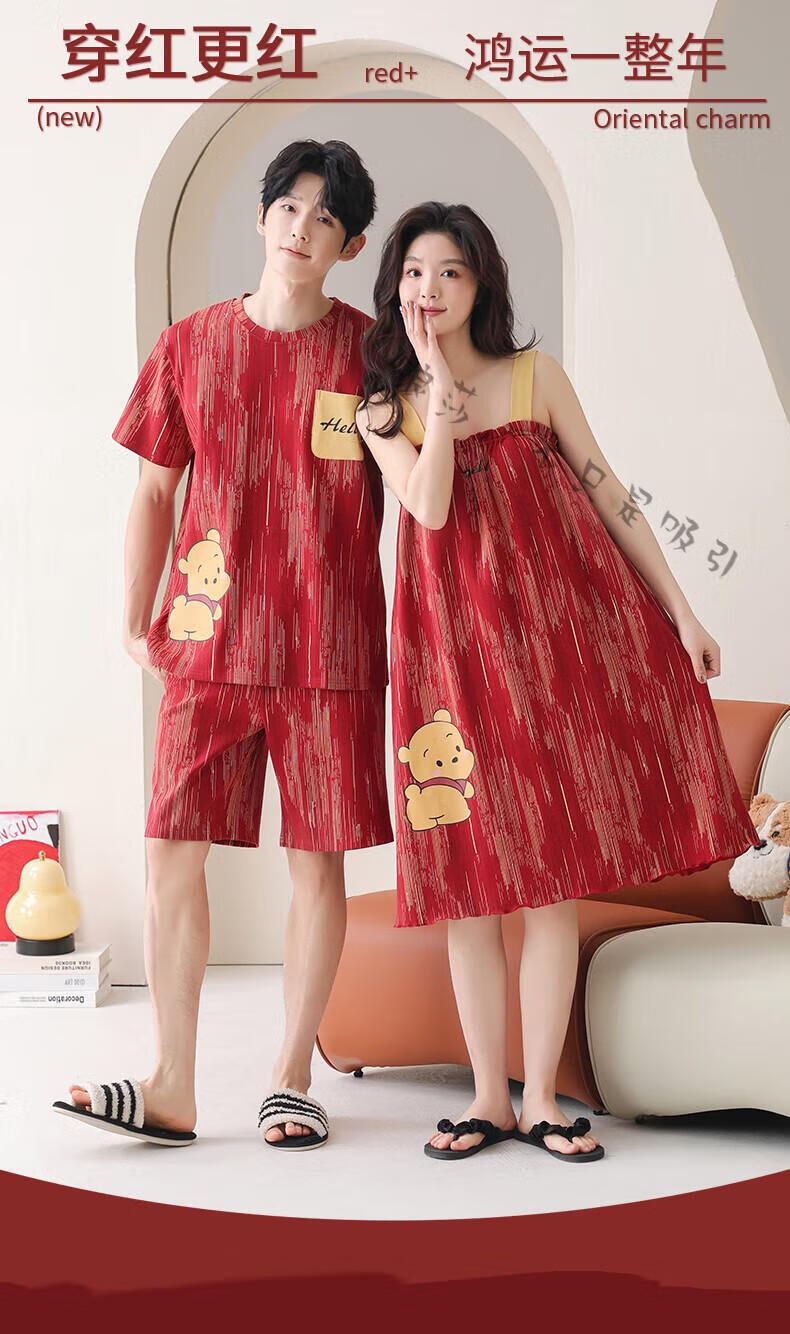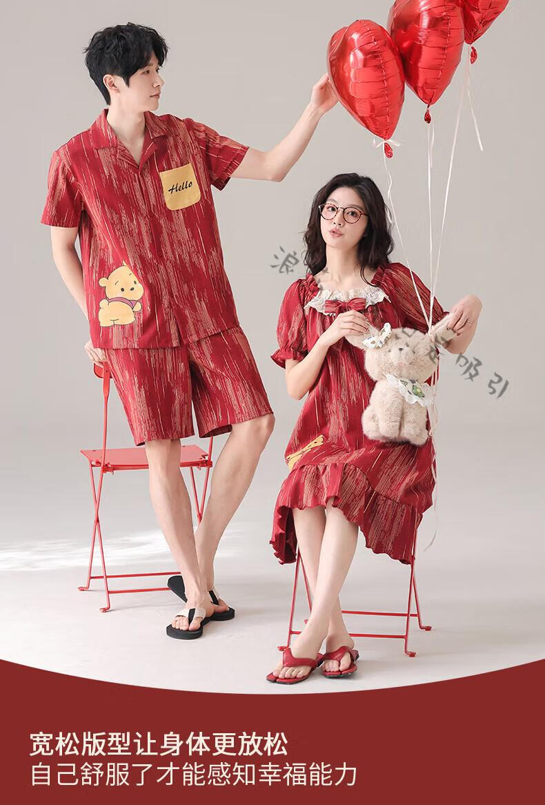 LangSha Couple Pajamas One Male One Female Summer Pure Cotton Thin Red Nightgown Wedding Festive Wedding 100% Cotton Home Clothes 7109 XL Female + 2XL Male