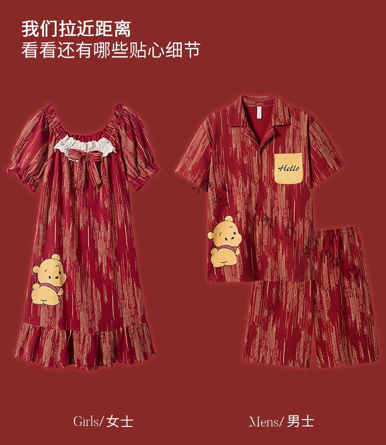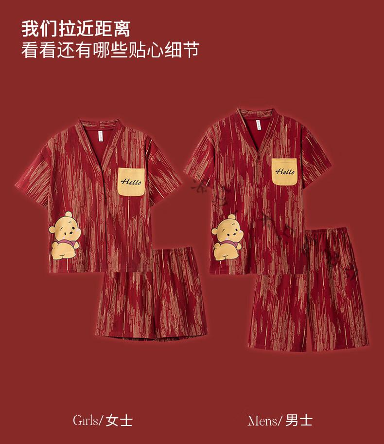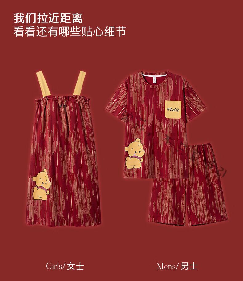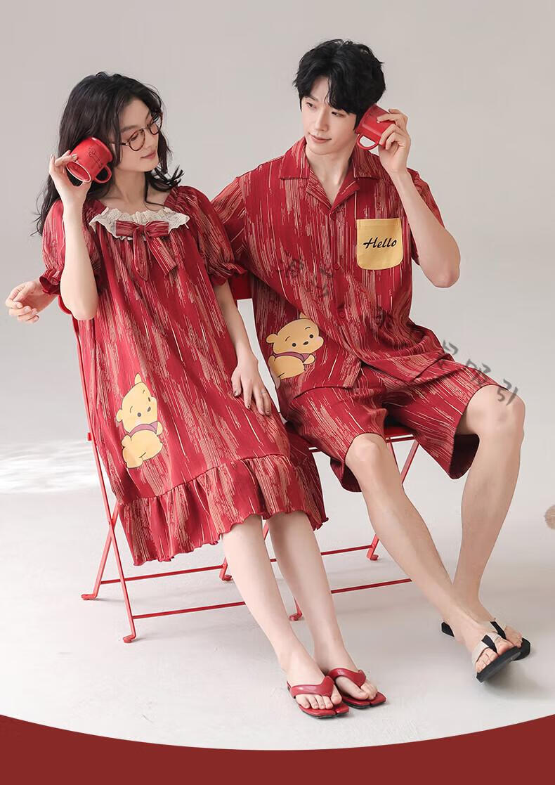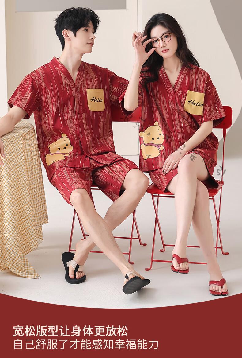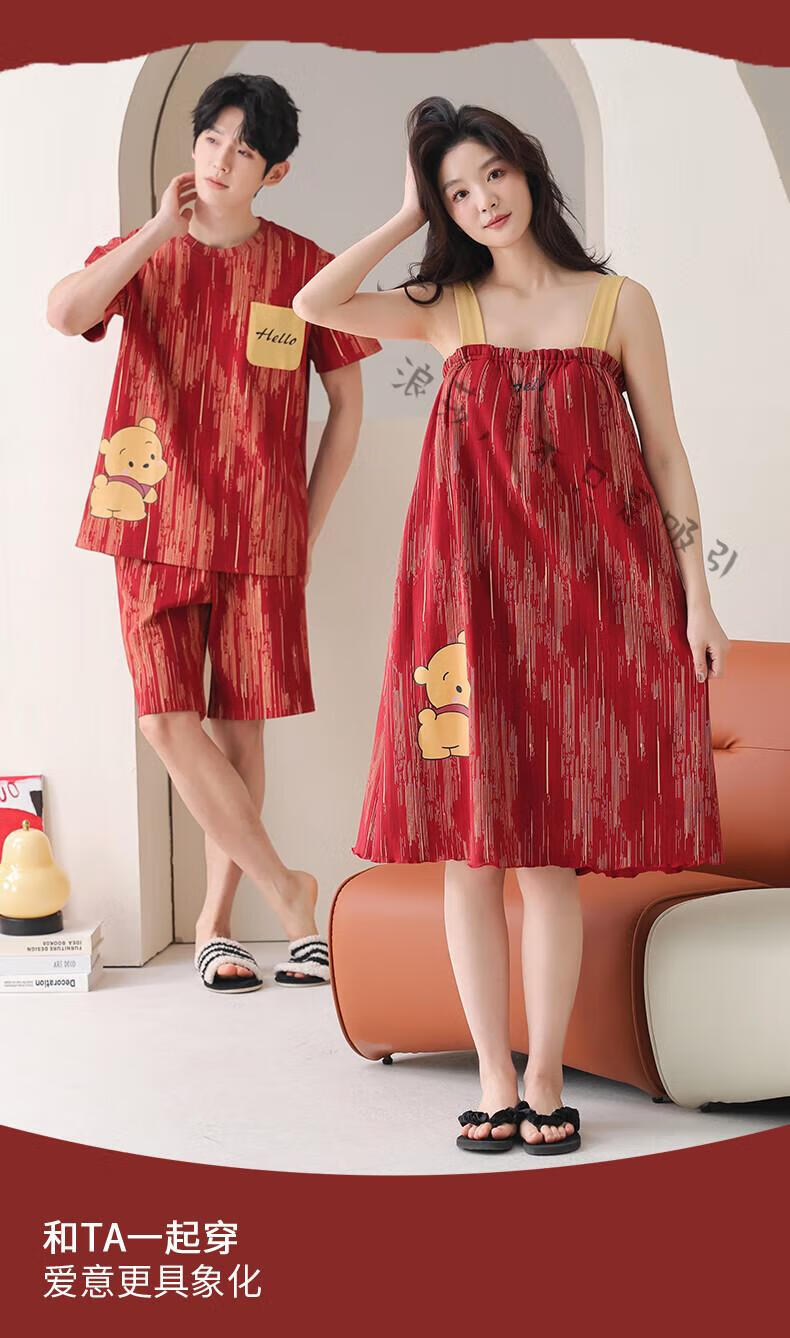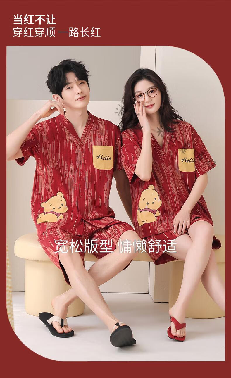 LangSha Couple Pajamas One Male One Female Summer Pure Cotton Thin Red Nightgown Wedding Festive Wedding 100% Cotton Home Clothes 7109 XL Female + 2XL Male