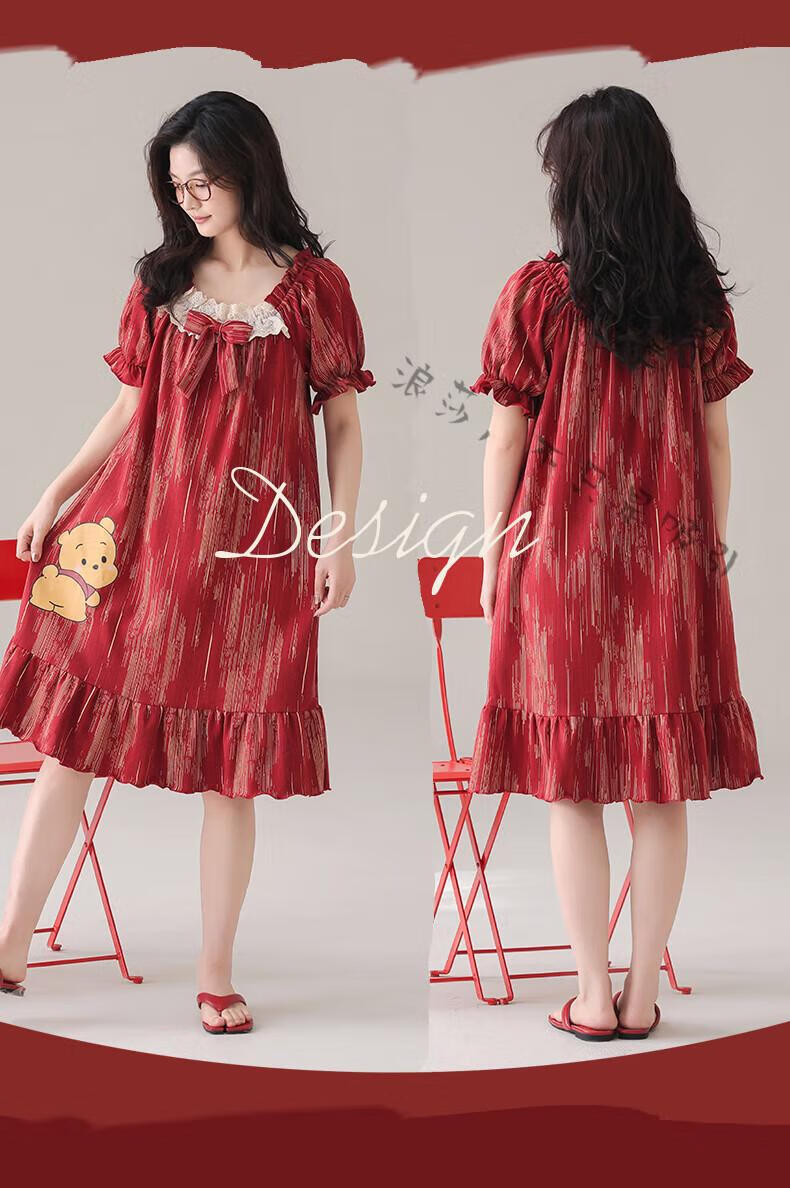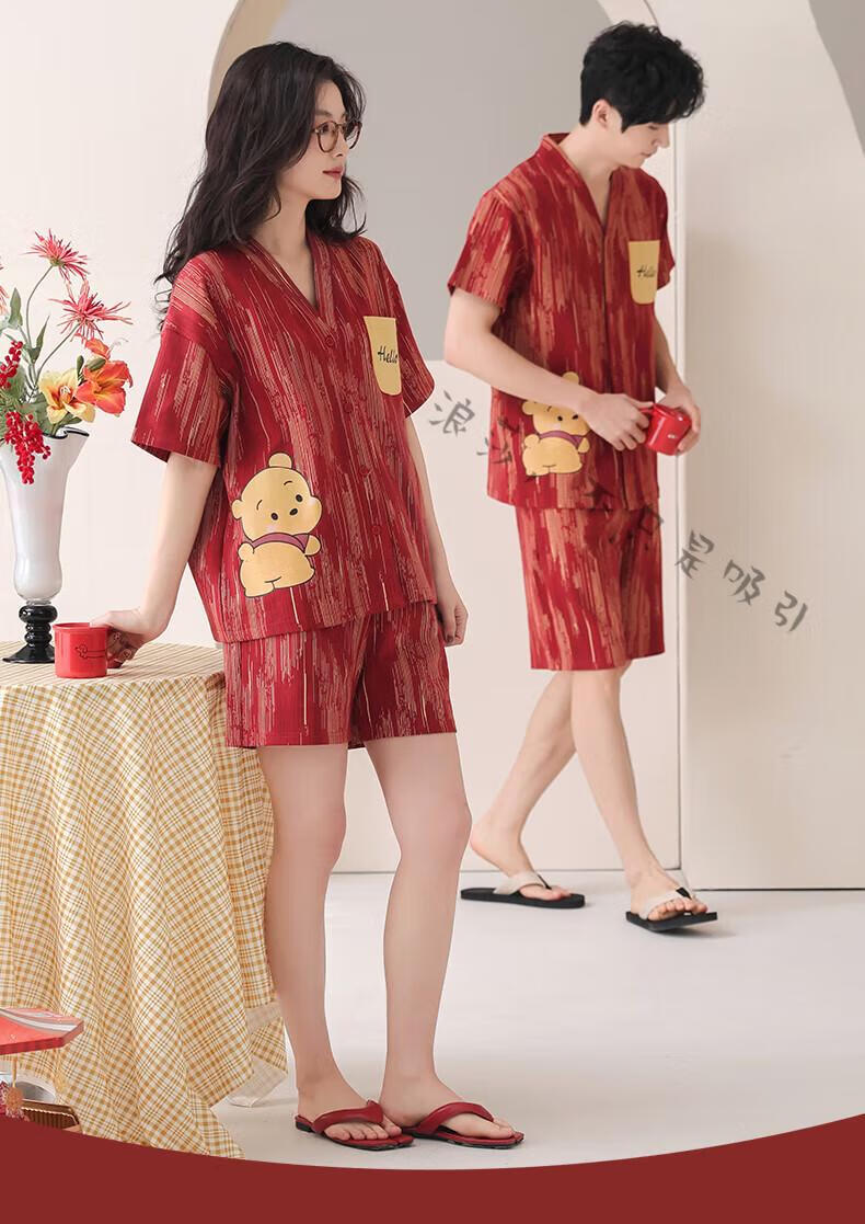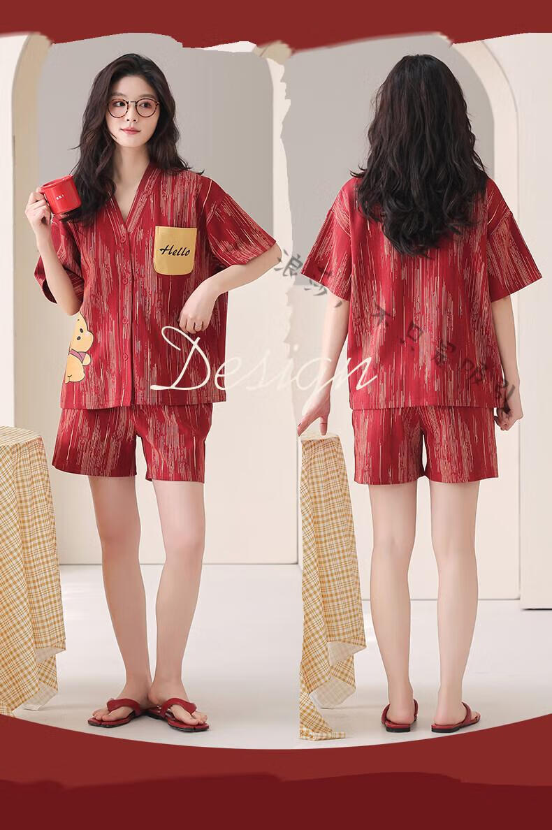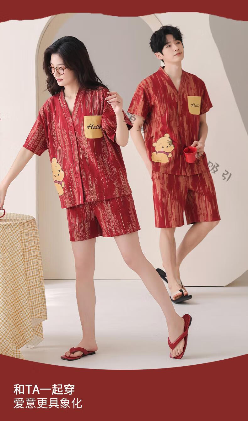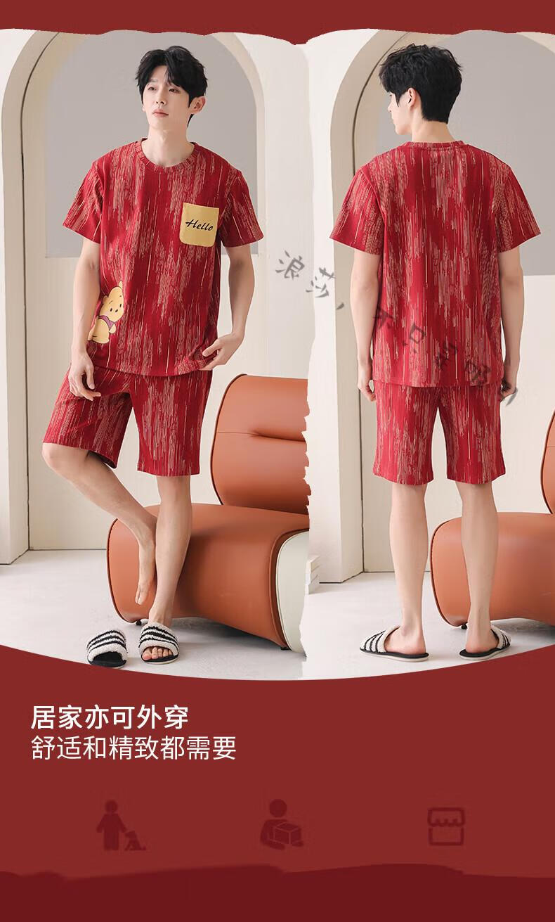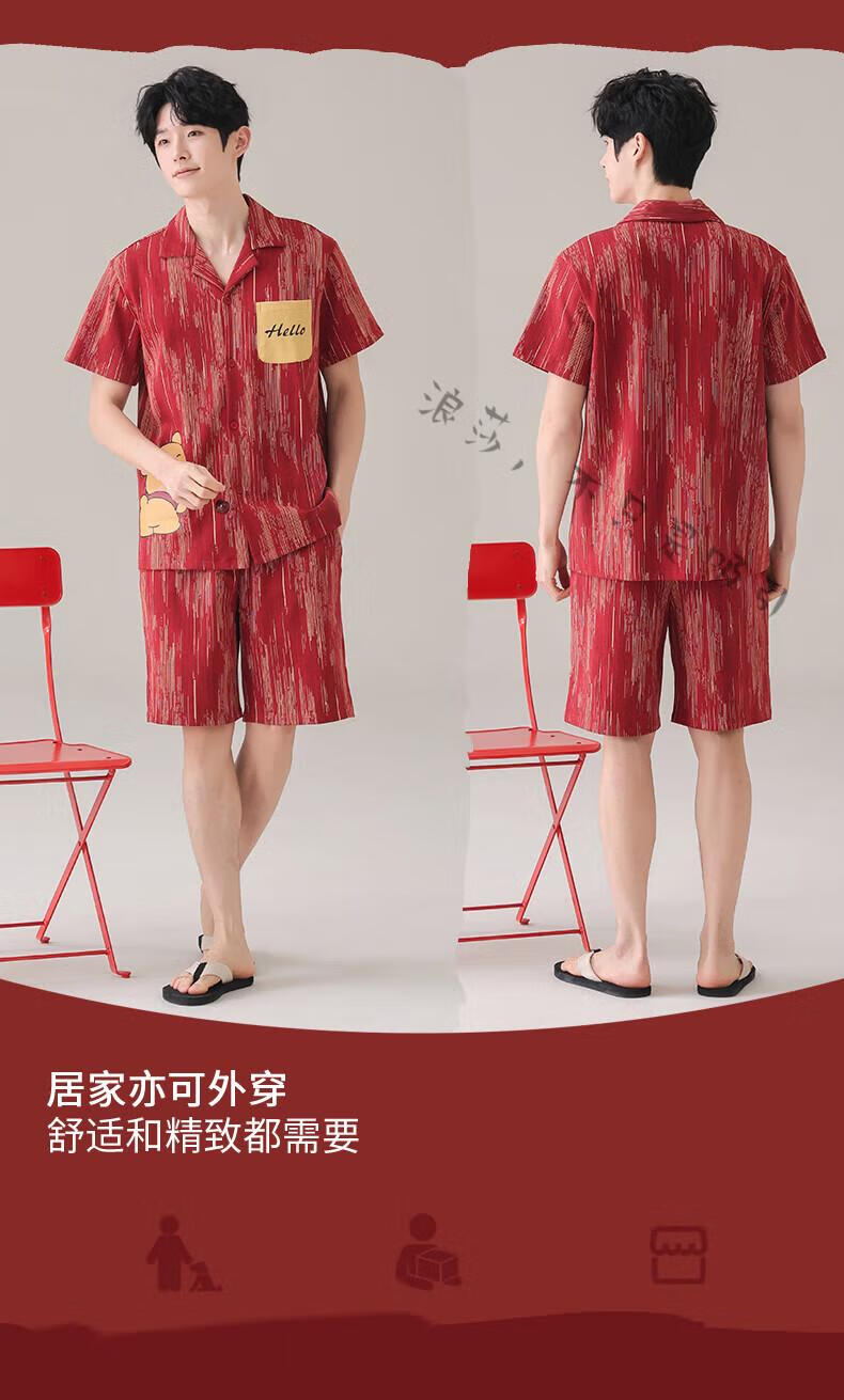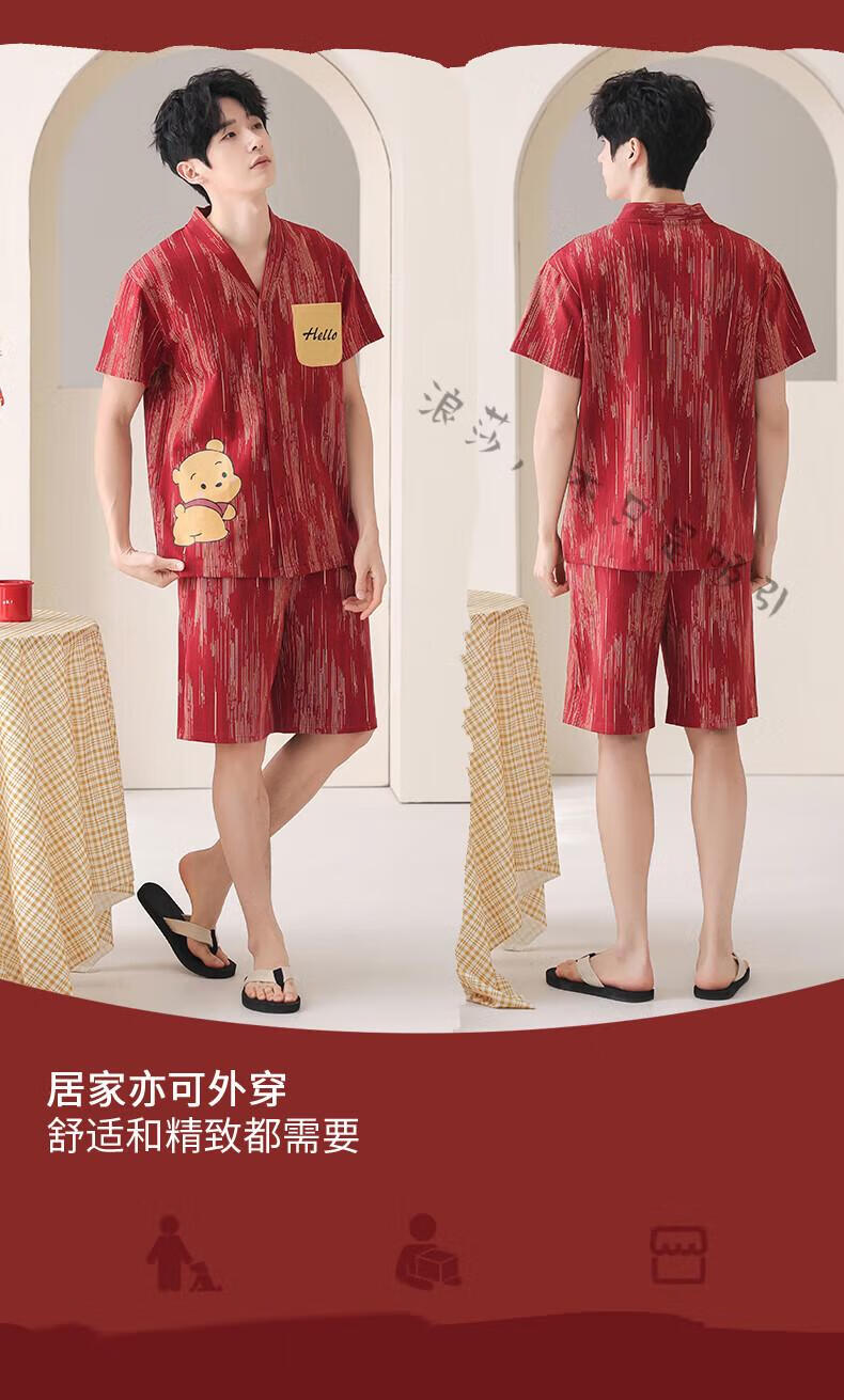 LangSha Couple Pajamas One Male One Female Summer Pure Cotton Thin Red Nightgown Wedding Festive Wedding 100% Cotton Home Clothes 7109 XL Female + 2XL Male