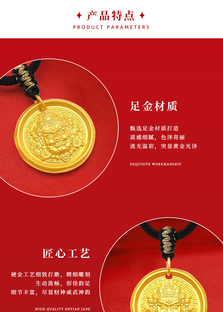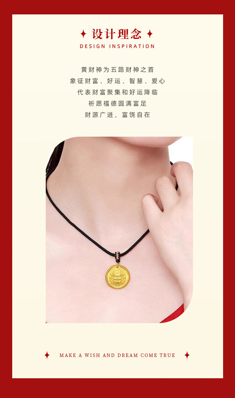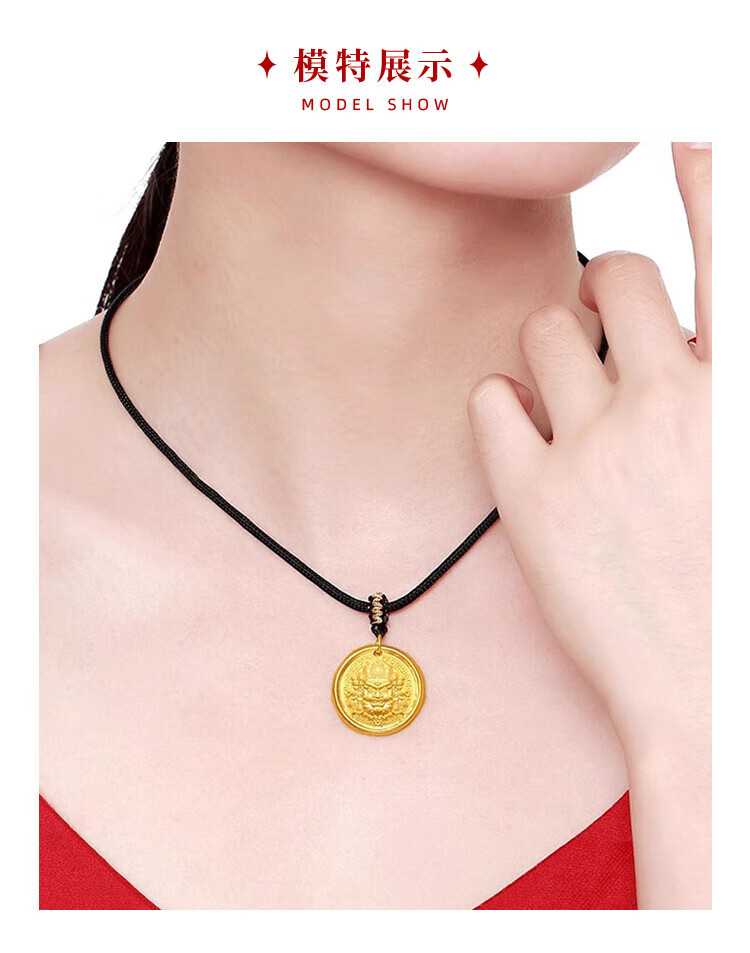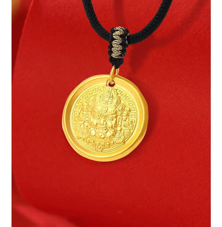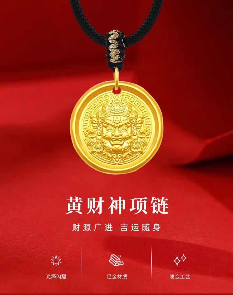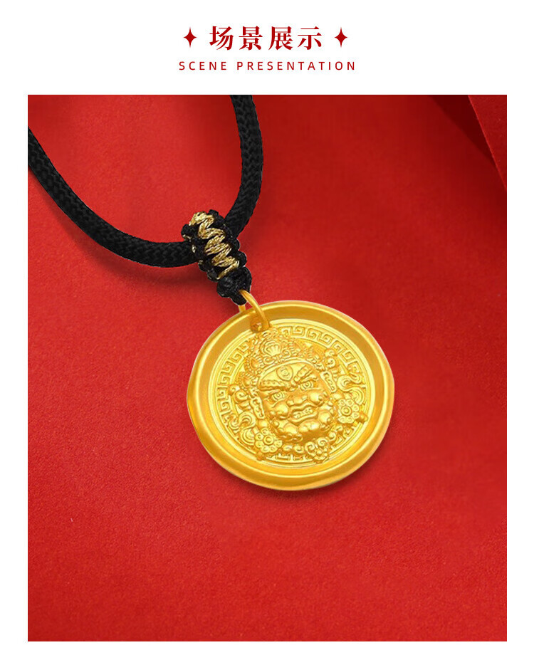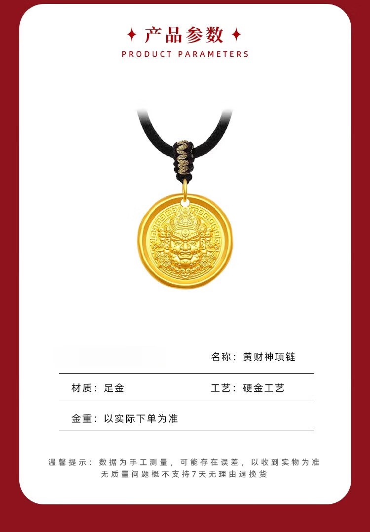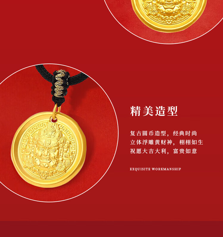 Fat Donglai's same style gold pendant 18k yellow God of Wealth women's round brand braided rope necklace men's holiday birthday gift Huang God of Wealth Necklace Black Rope 1g