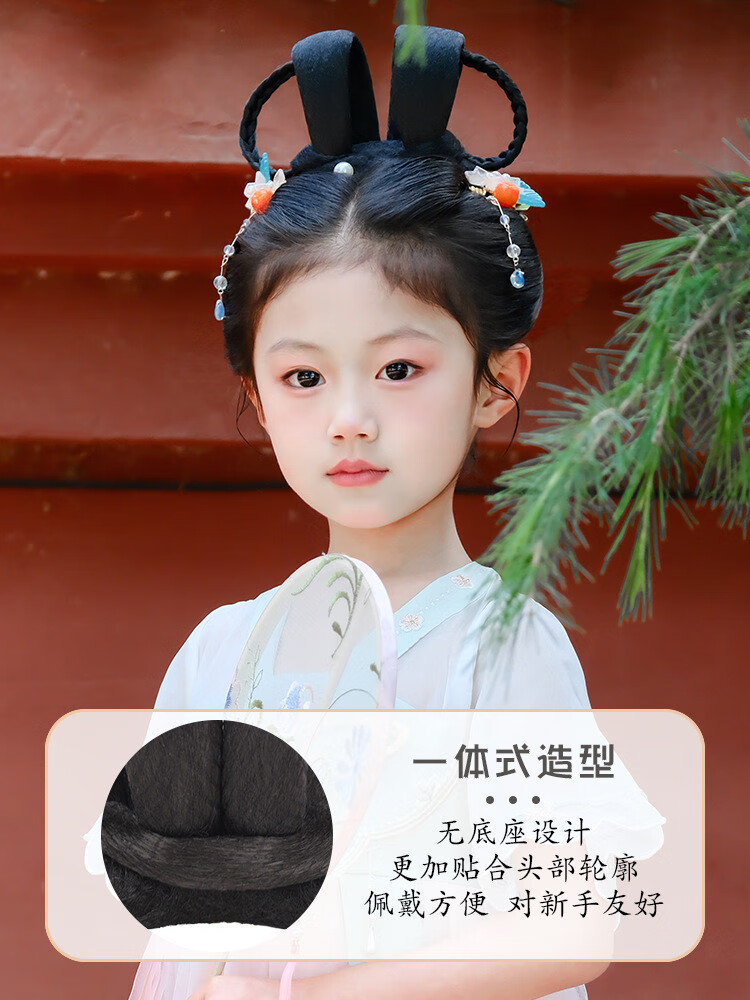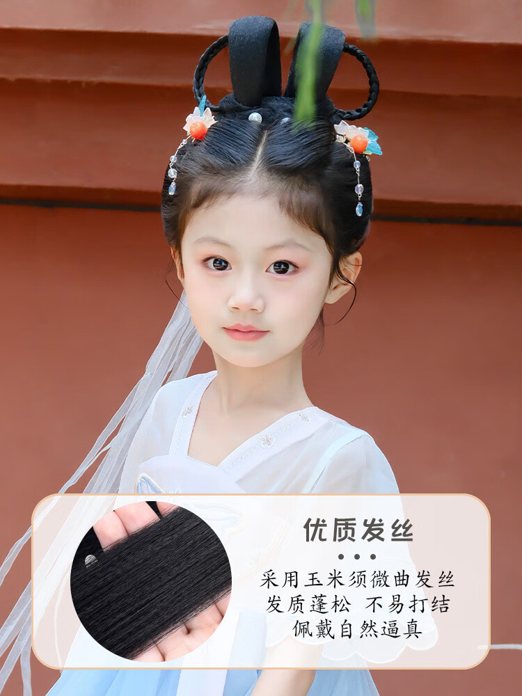 ENRMIIV children's Hanfu headwear, ancient costume, girls' stage performance, universal wig bag, ancient style soft bun hair accessories, Qianqian bun + orange clip