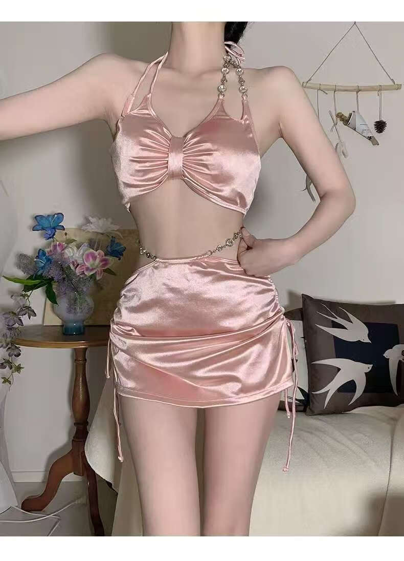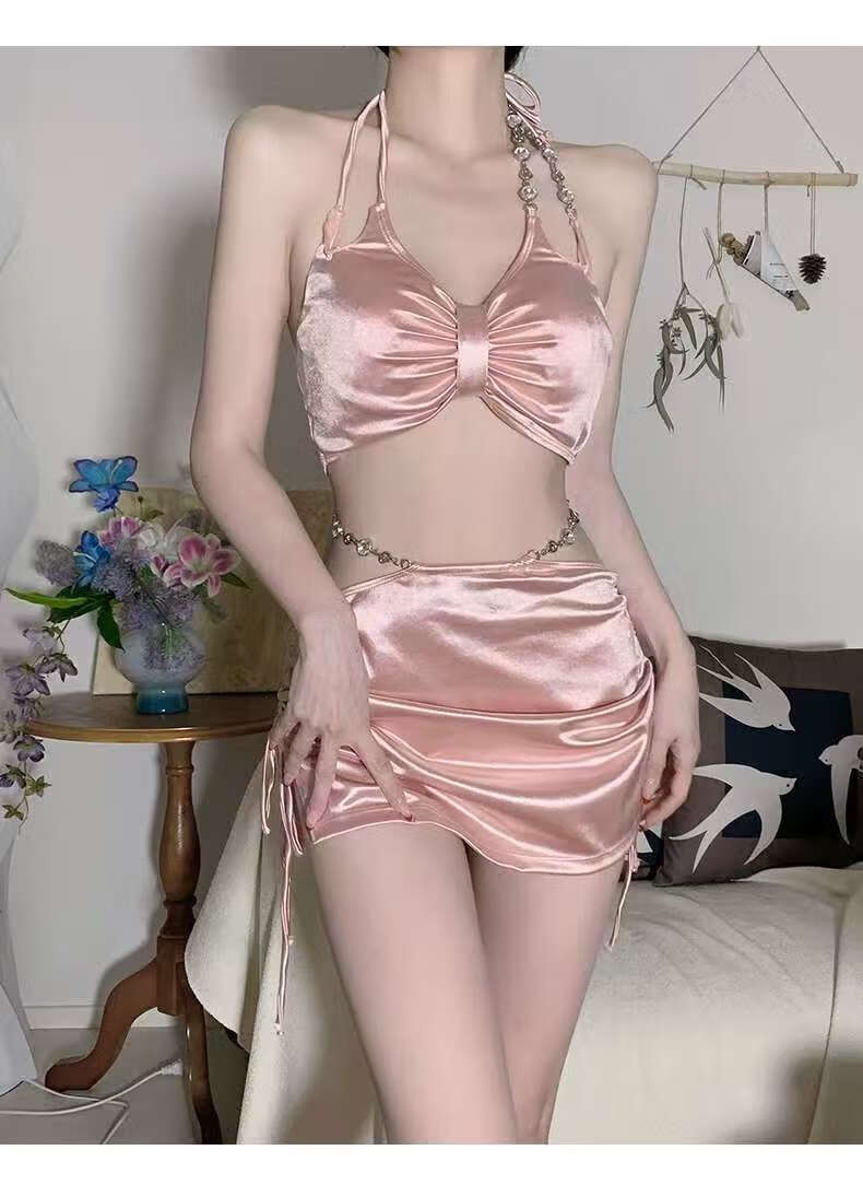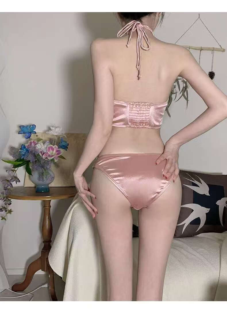Qiner swimsuit women's split three-piece sexy solid color diamond shiny bikini swimsuit pure lust hot spring swimsuit pink M recommended 85-95Jin Jin equals 0.5 kg