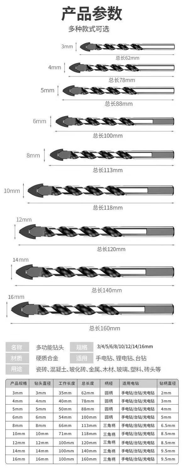 Vinoa can drill bit concrete wall drill iron tile glass woodworking electric drill turn head drilling tool tungsten steel drill 3456810 super hard tungsten steel carbide