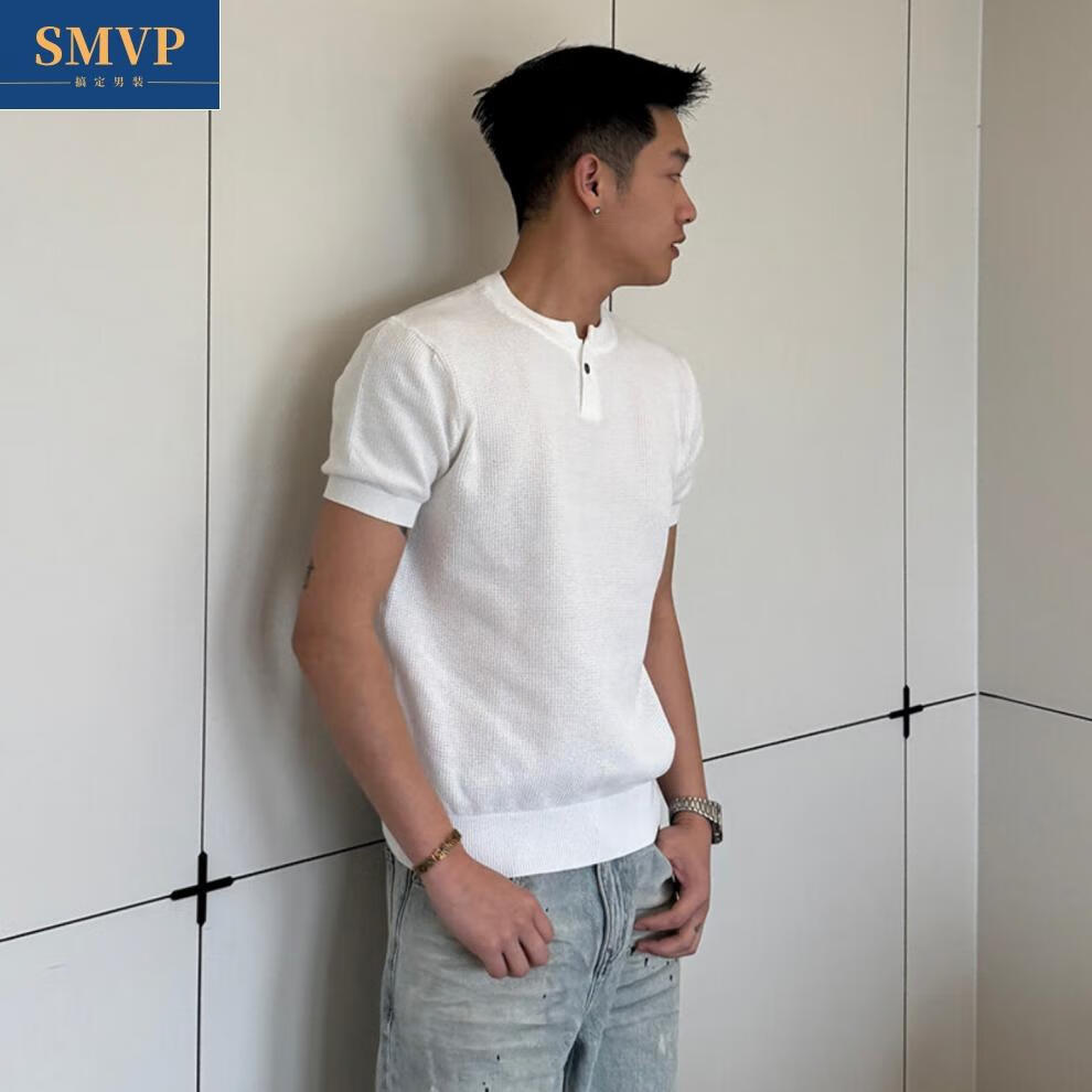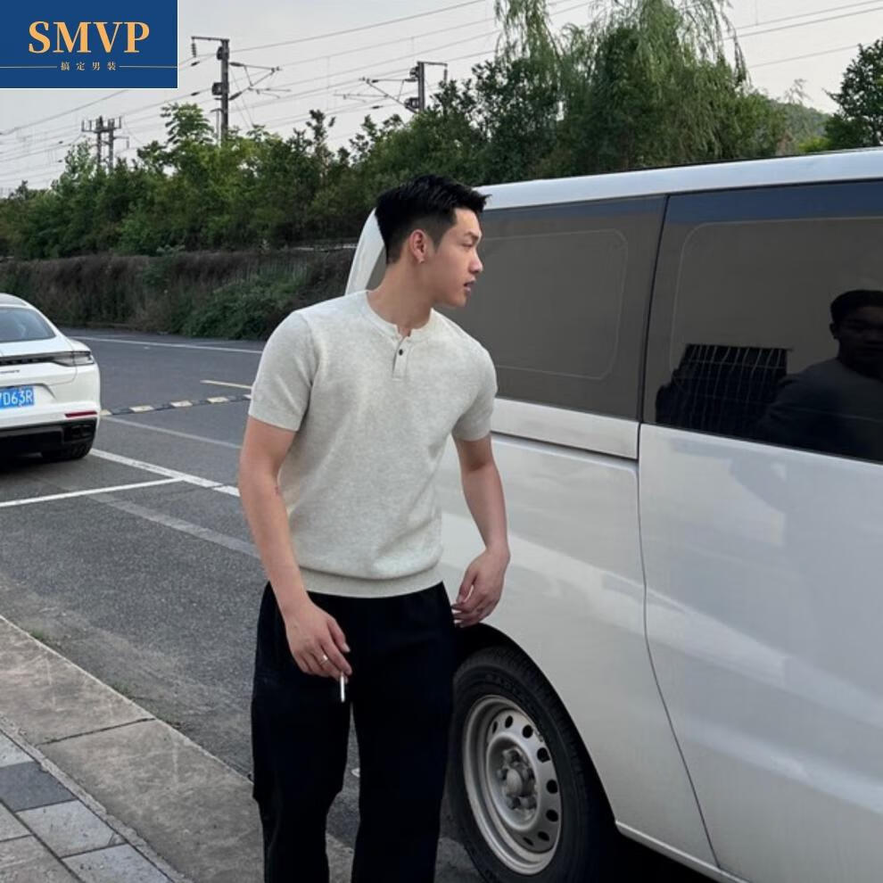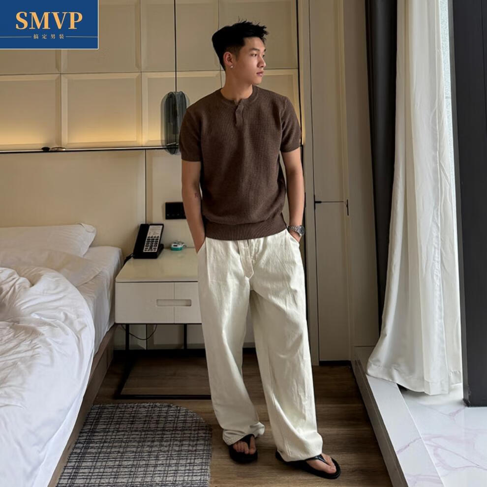 SMVP old money style polo shirt classy wear for men in summer one-button Henry collar short-sleeved T-shirt right shoulder half sleeve brown 2XL recommended 145-160Jin Jin equals 0.5 kg