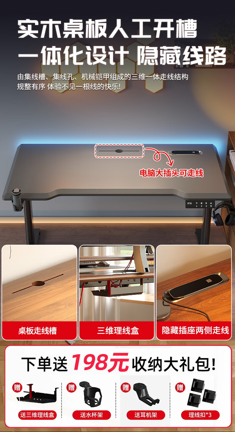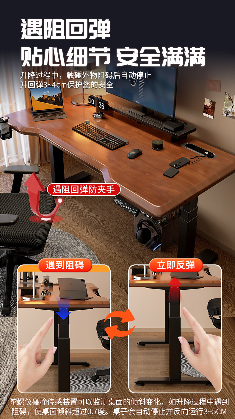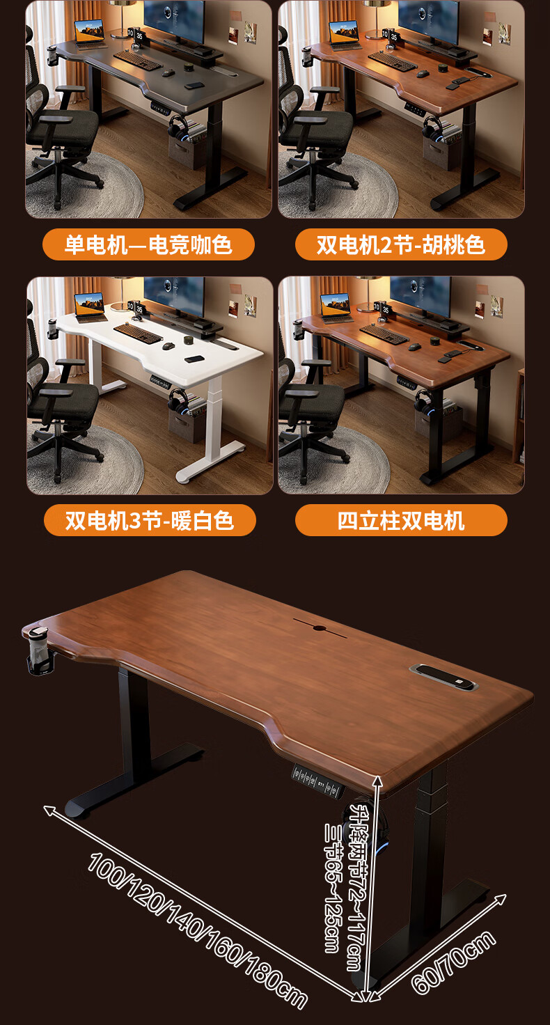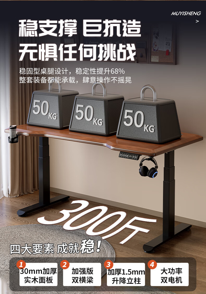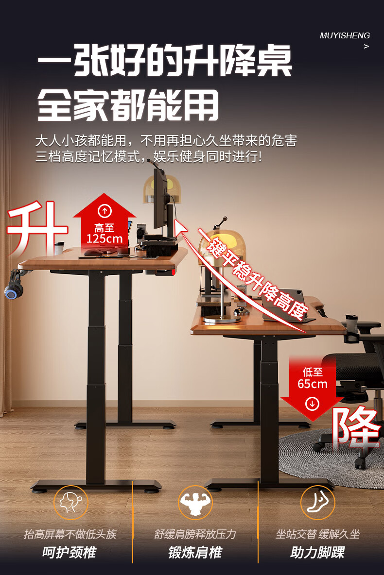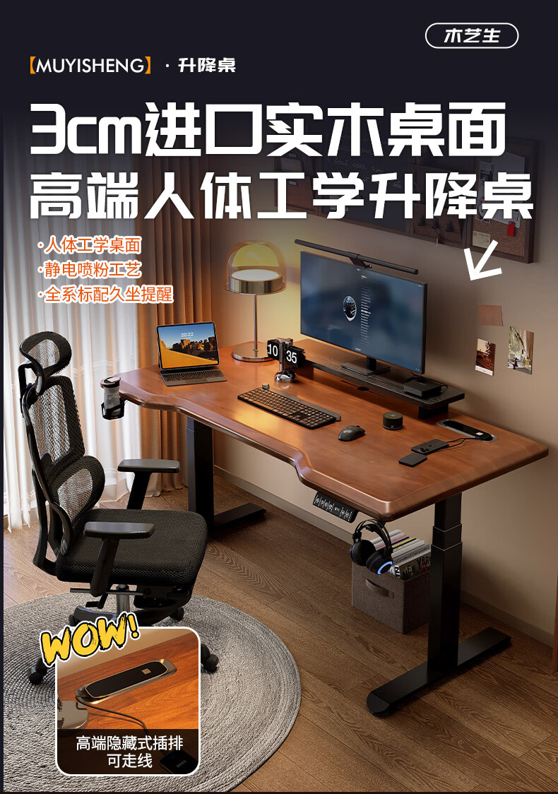 Mu Yisheng solid wood electric lift table 3cm computer desk desktop e-sports table office study desk liftable workbench hidden power strip dual motor 3cm walnut color 120*60 100% imported pure solid wood desktop