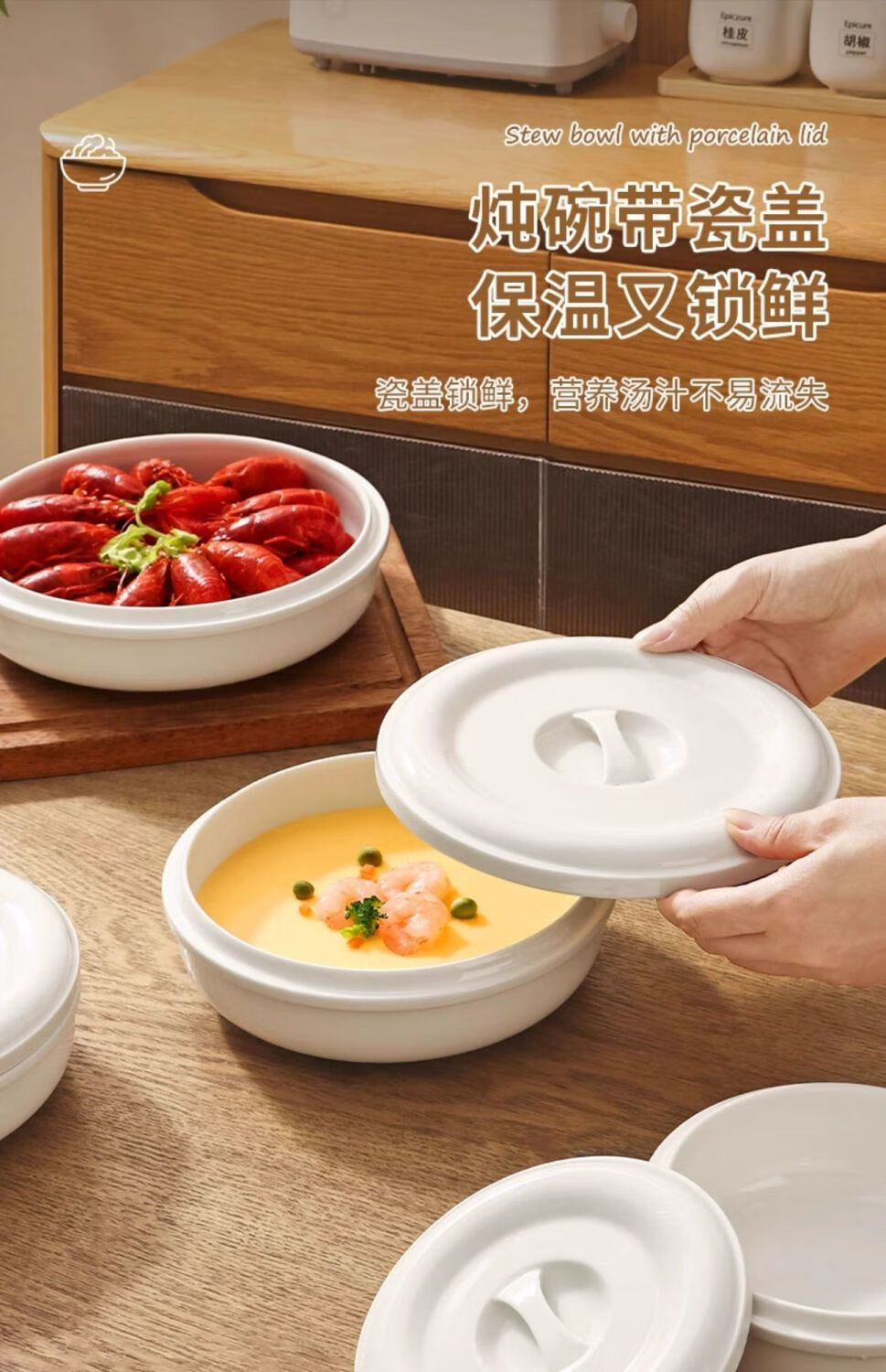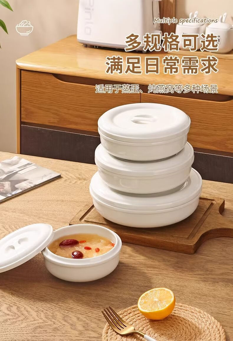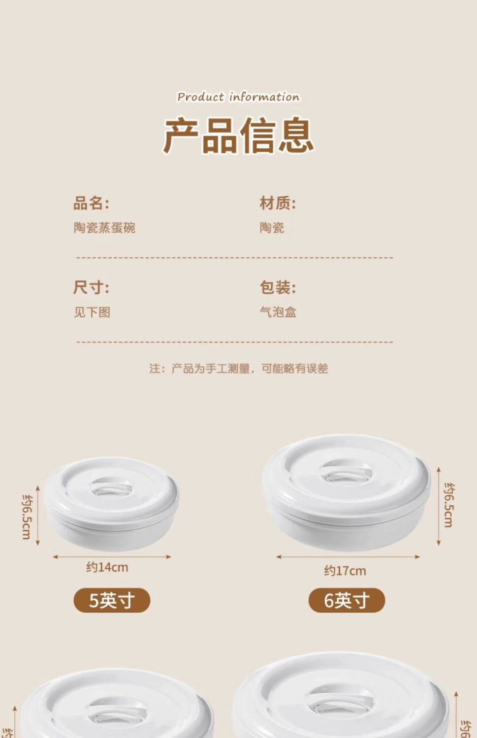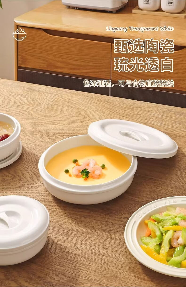 Baijie ceramic steamed egg bowl, household steaming bowl with lid for stewed eggs and egg custard, 2025 new water-proof stewed steaming dish, stew pot, 5-inch steamed egg/steaming dish (500ML with lid)
