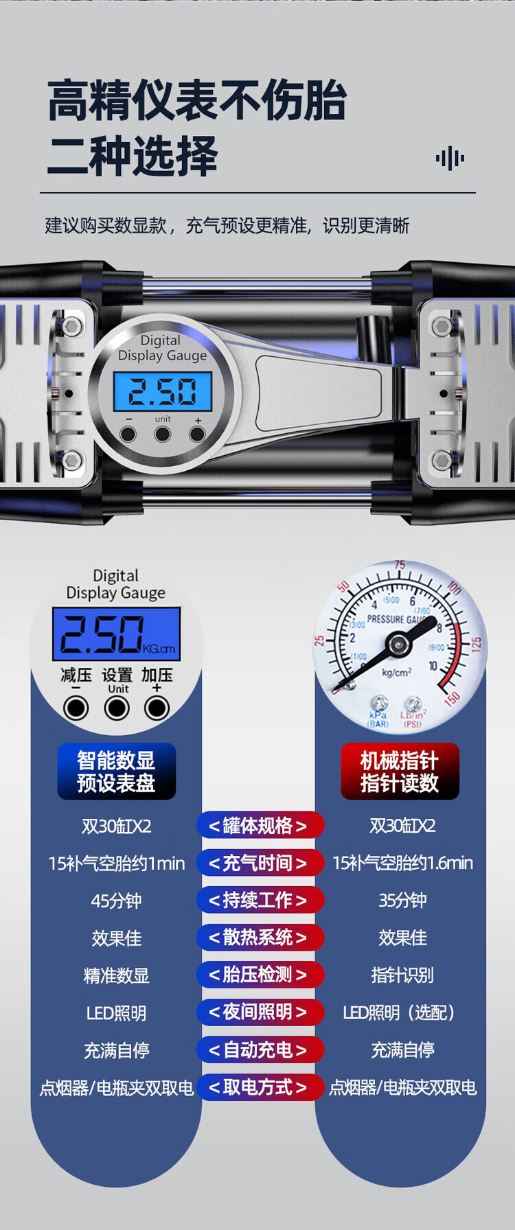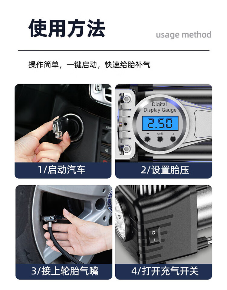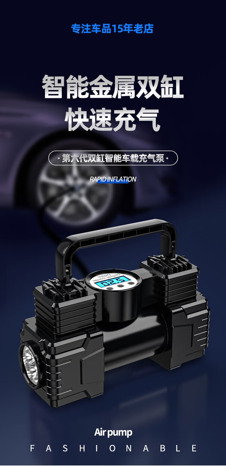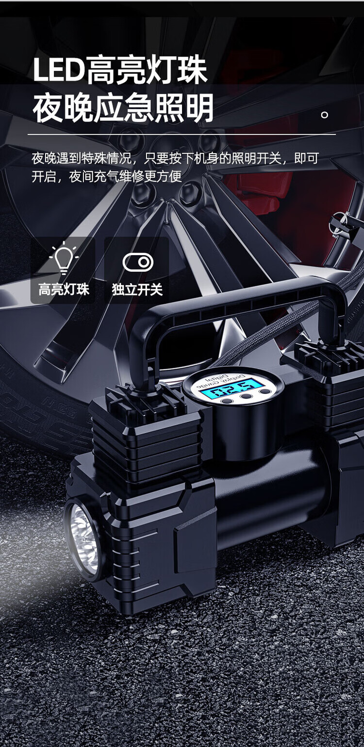 Vehicle-mounted air pump, portable car inflator, electric tire inflator for cars, high-power double-cylinder high-pressure double-cylinder 99800 high-pressure pointer type + tube + clamp + mouth
