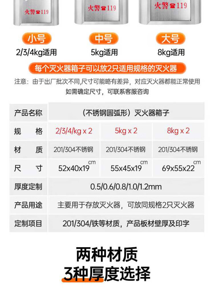 201/304 stainless steel fire extinguisher box fire extinguisher box arc-shaped anti-collision fire extinguisher box 4/5kg kindergarten shopping mall hotel capacity 4kg*2 fire extinguisher box arc box 201-0.8