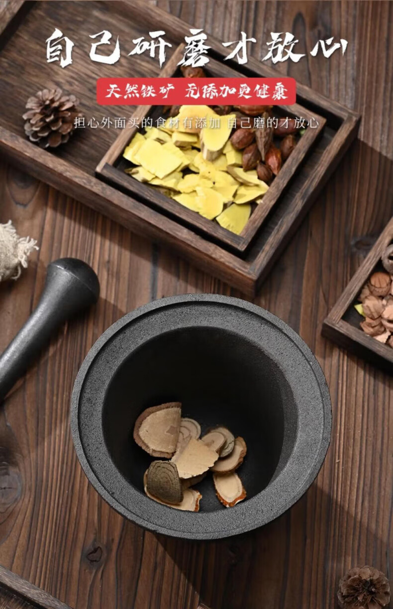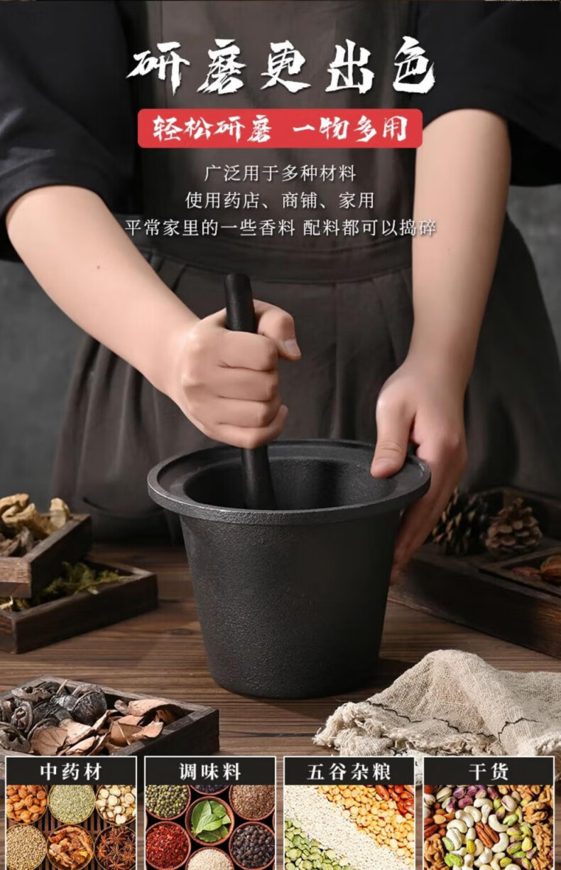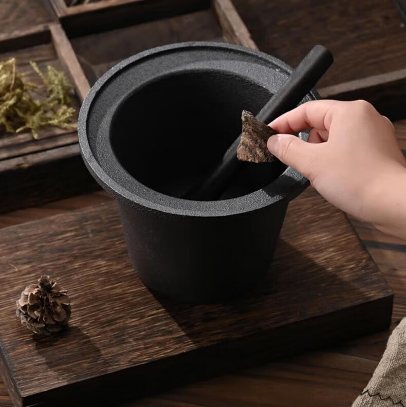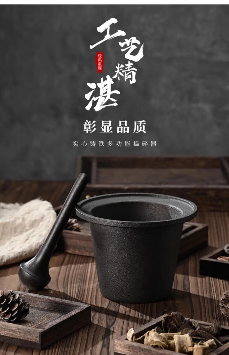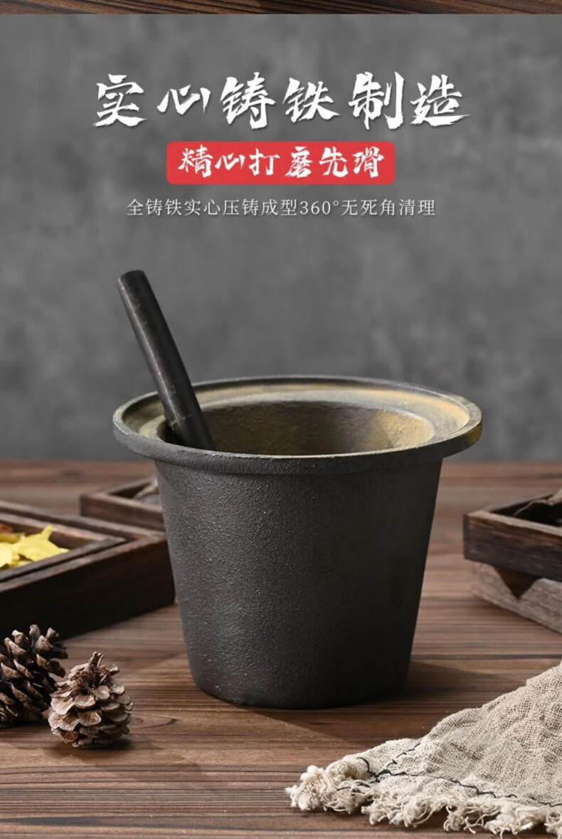 Man Gong high-end quality household cast iron pestle iron tamping medicine jar masher Chinese medicine tamping iron pestle mortar pestle medicine jar vegetable oil small size oil brush + leather cover