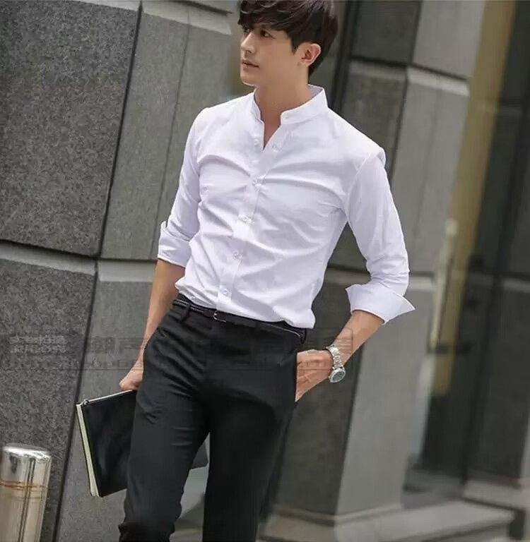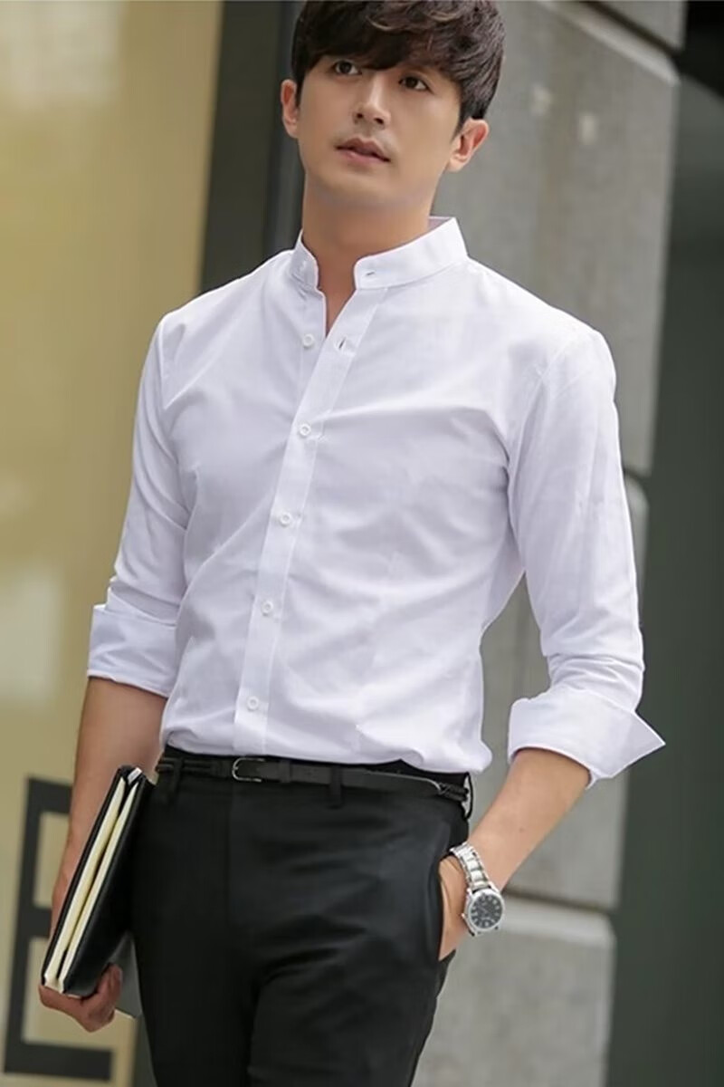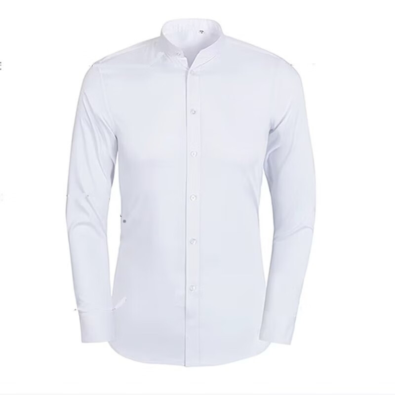 Shirt men's summer thin tunic pure white stand-up collar shirt long-sleeved slim business casual solid color top white counter quality 3XL