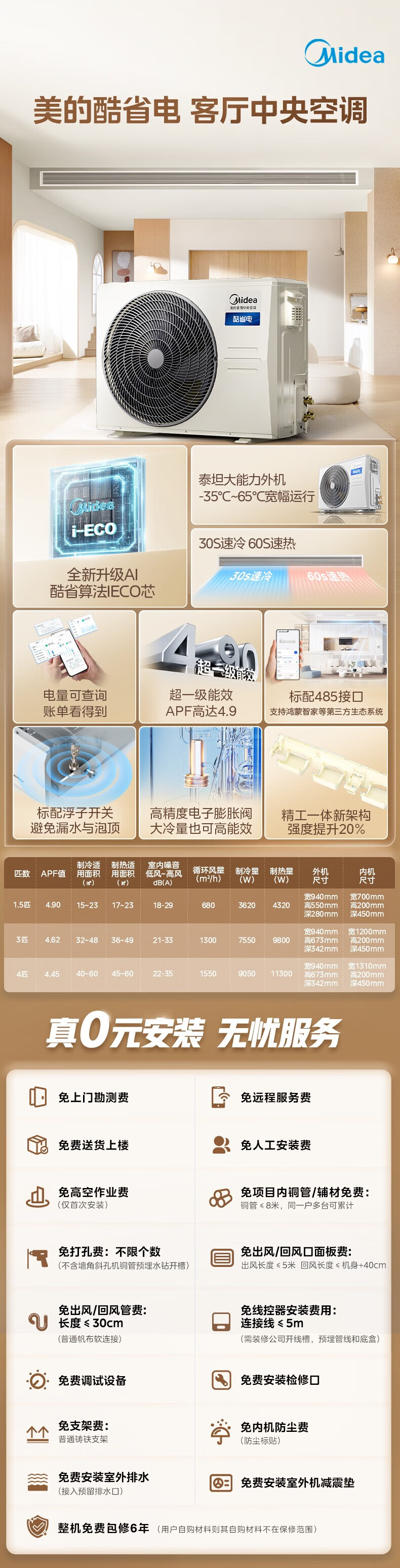 Midea cool energy-saving air duct machine one-to-one one-level energy efficiency living room household central air conditioner large 4 HP first-level energy efficiency cool energy saving (40-60)