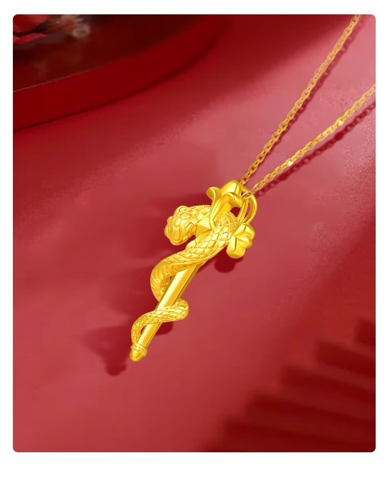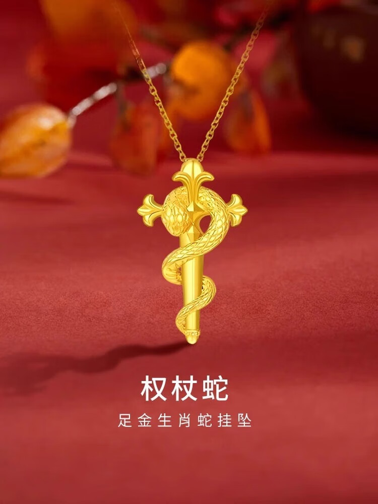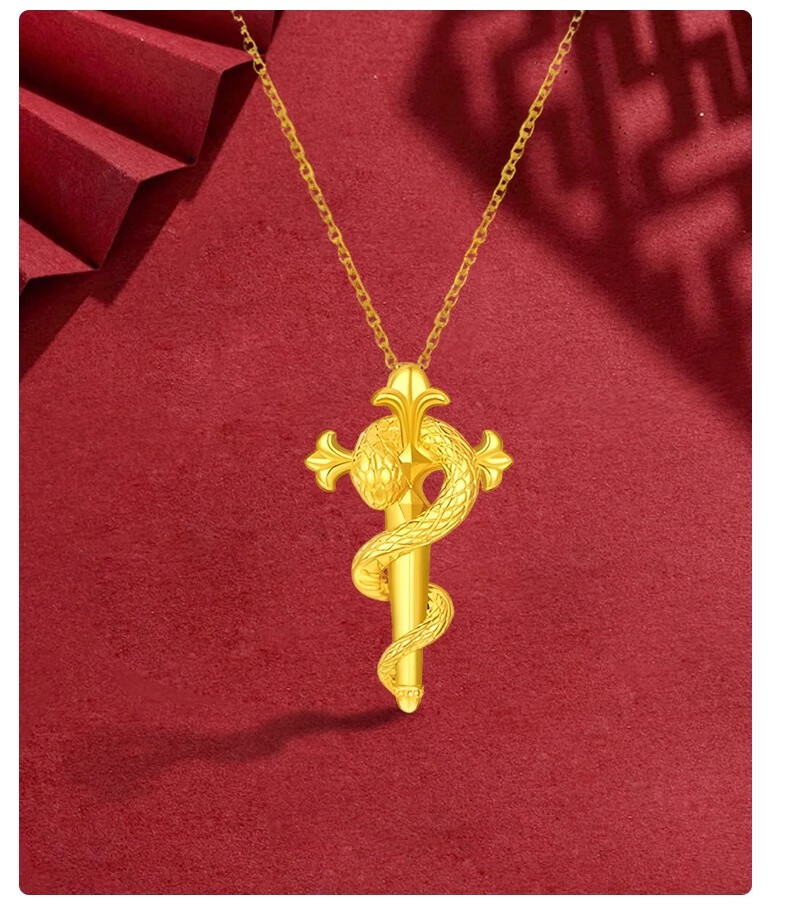 Ji Bochi pure gold-plated silver G24K yellow gold scepter and snake pendant, zodiac sign snake guardian cross winding lock for girlfriend, scepter and snake single pendant, thickened gold layer