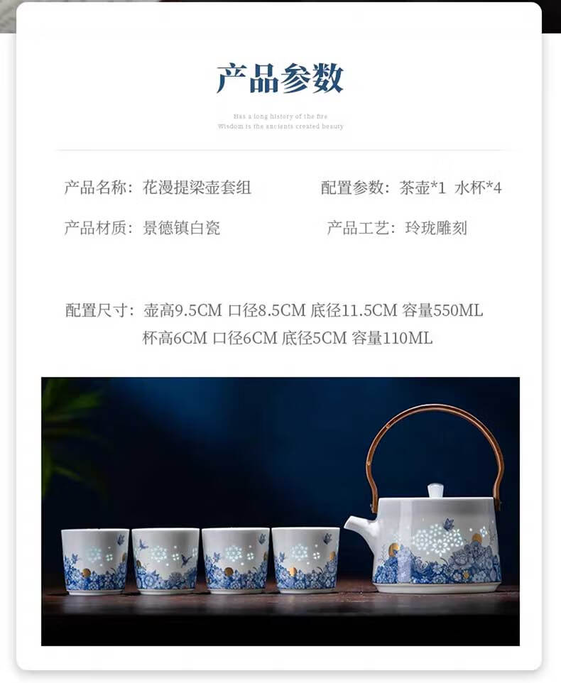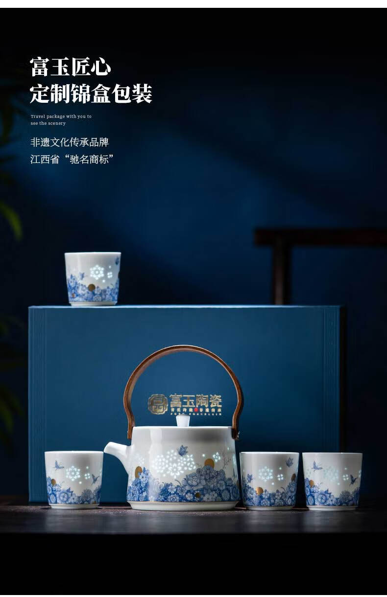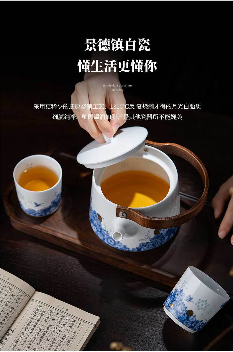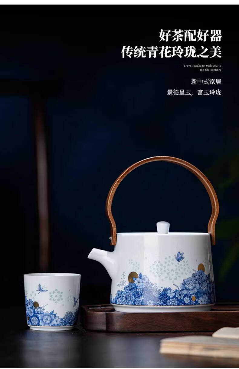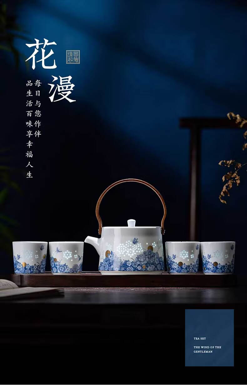 Lingfeng Jingdezhen Rich Jade Exquisite Ceramics Hand-Painted Blue and White Tea Set with Flower Mantic Lift Beam Pot Teacup Teapot Set One Pot Four Cups Tea Set Gift Box 5 Pieces