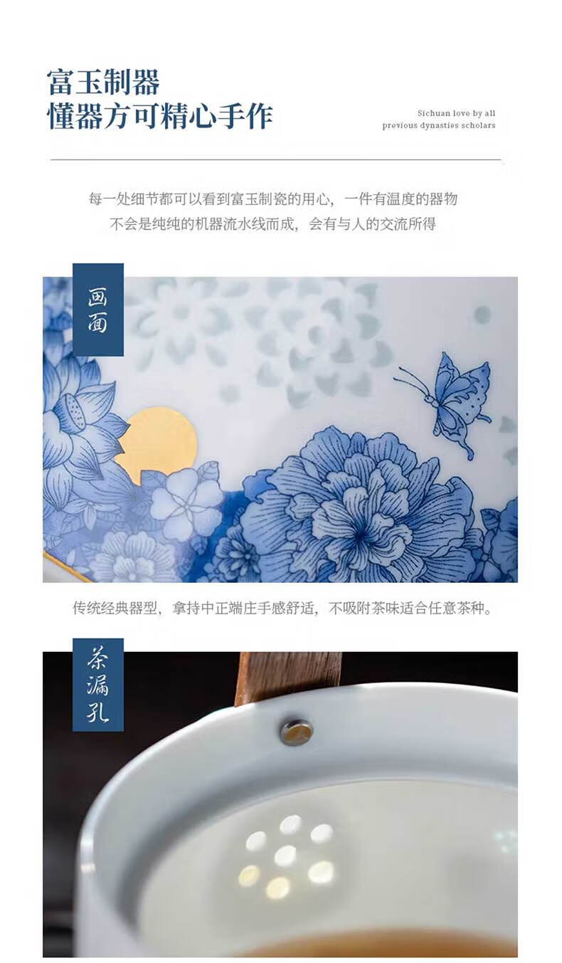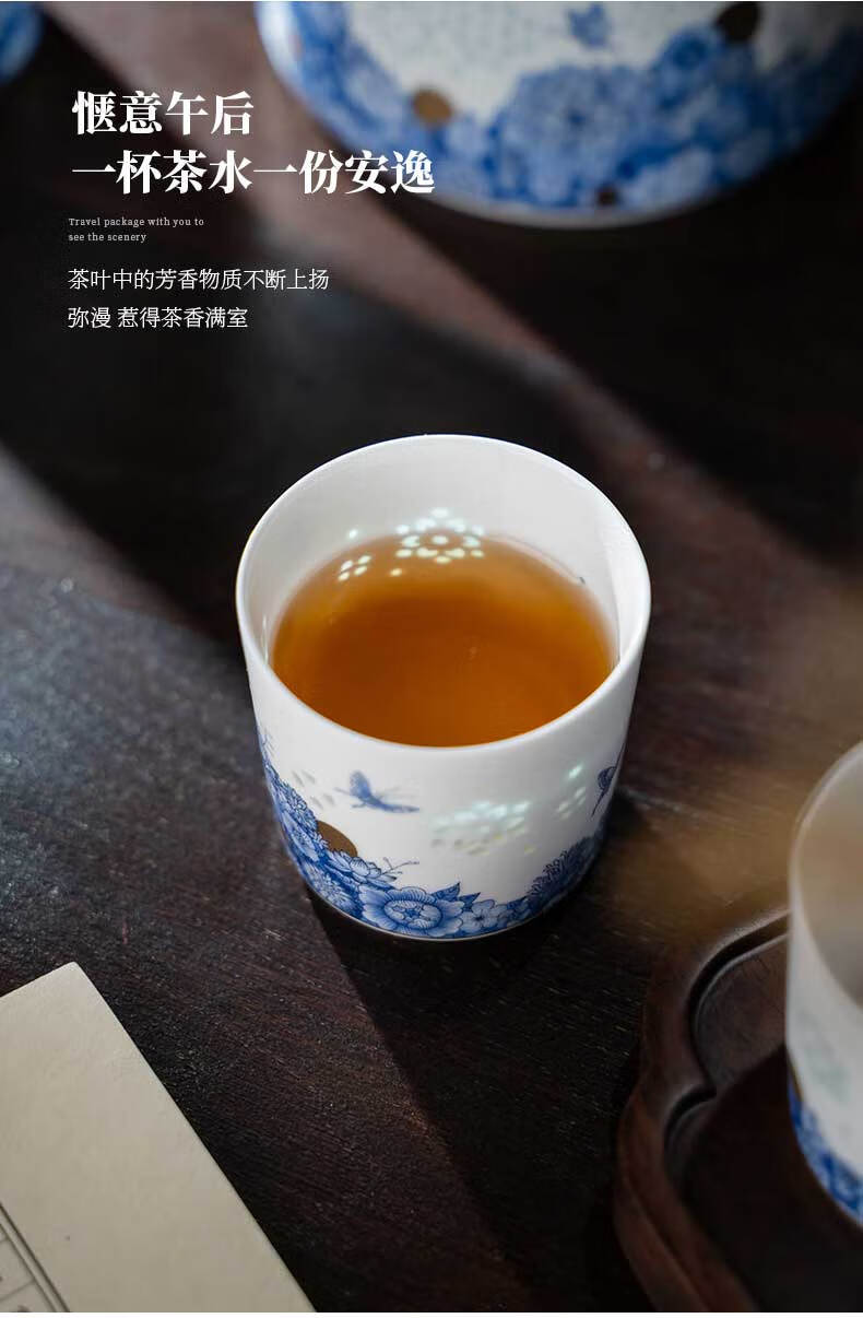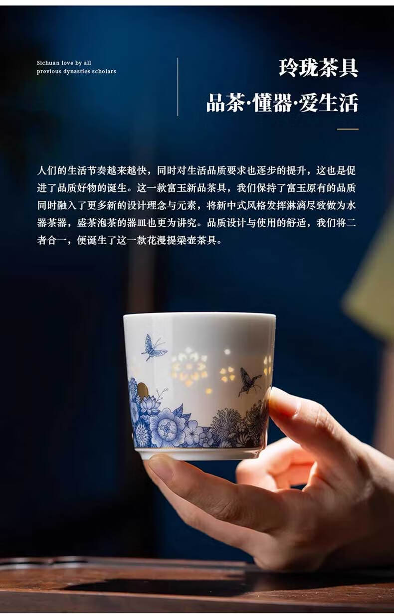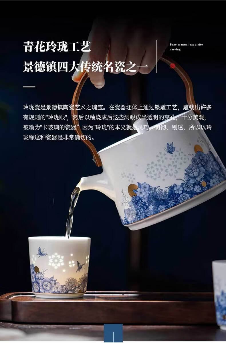 Lingfeng Jingdezhen Rich Jade Exquisite Ceramics Hand-Painted Blue and White Tea Set with Flower Mantic Lift Beam Pot Teacup Teapot Set One Pot Four Cups Tea Set Gift Box 5 Pieces