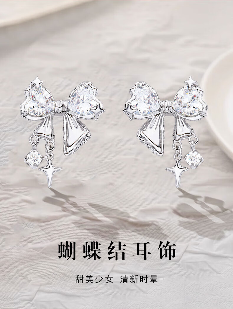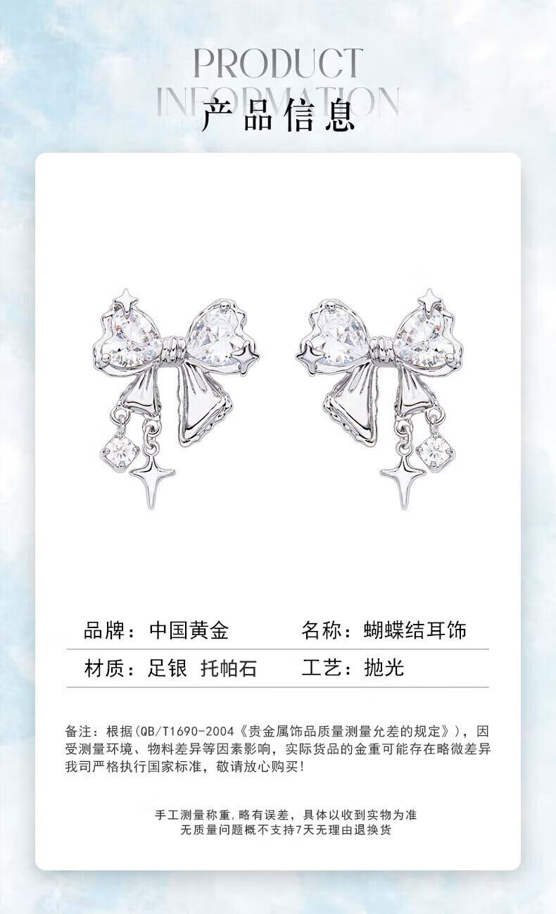 CHINA GOLD Bow-knot Pure Silver Earrings Women's Light Luxury Niche Design Earrings Silver Earrings Mid-Autumn Festival Gifts for Girlfriends and Wife Zhongjin Gift Box Bow Earrings