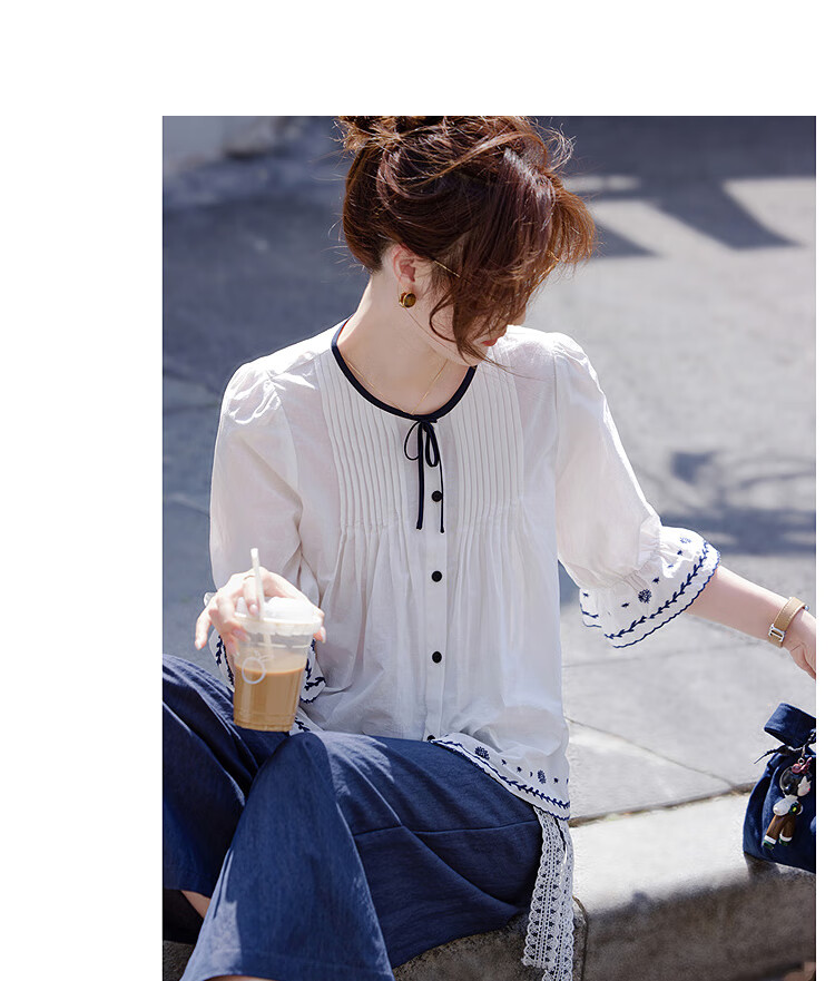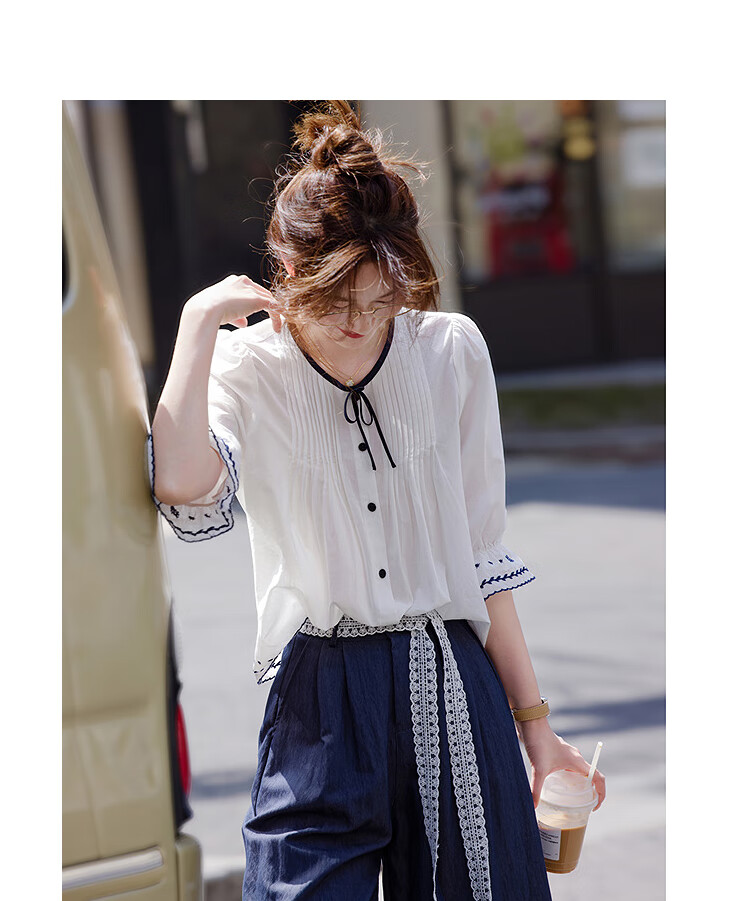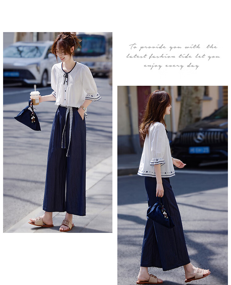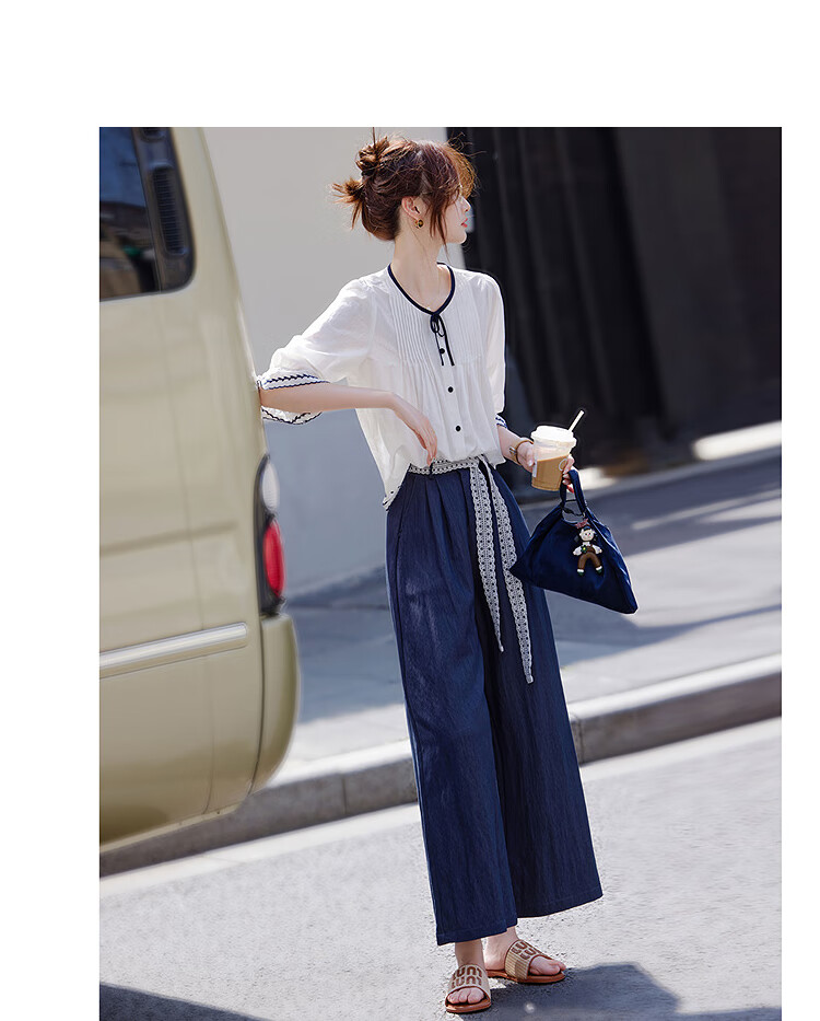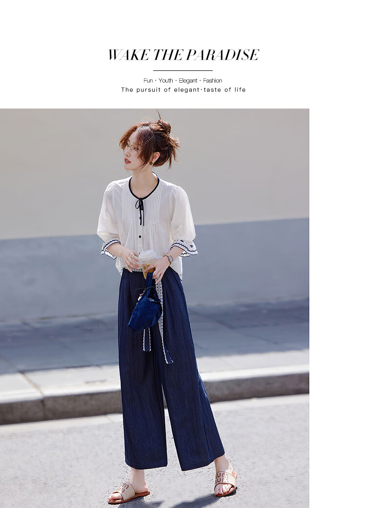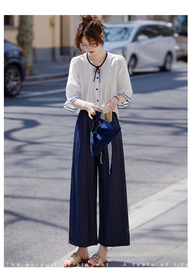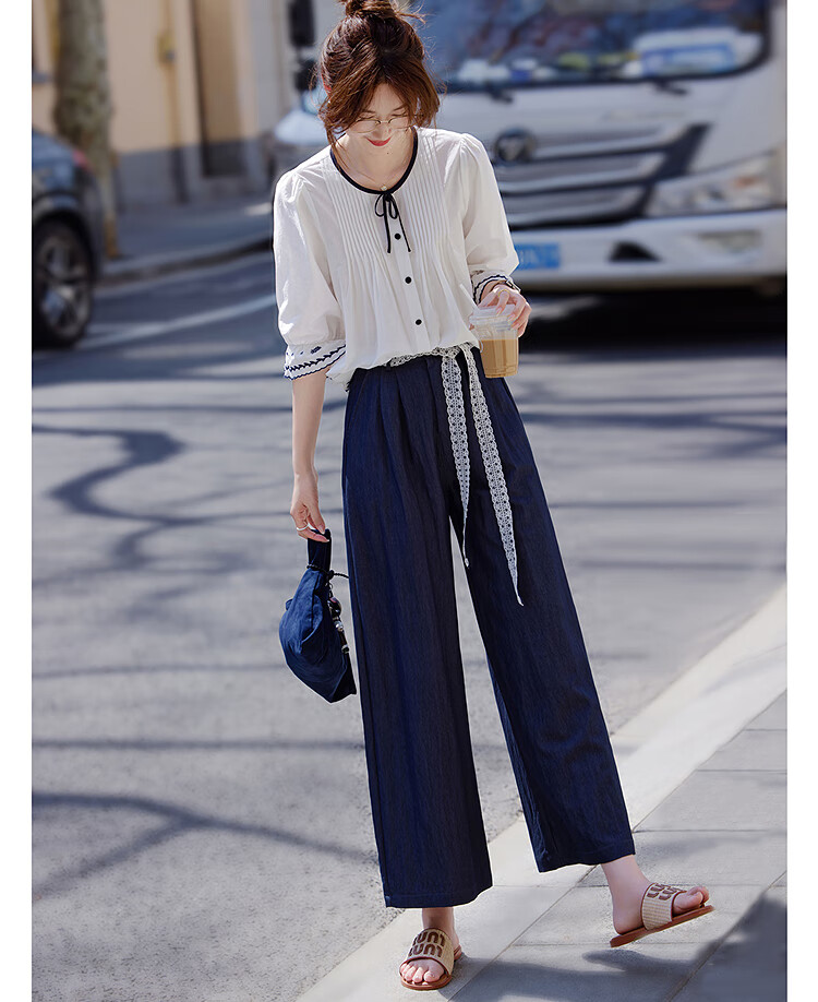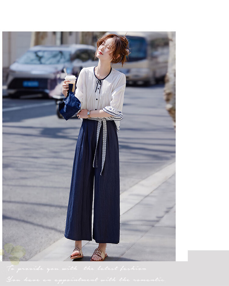 Awakening Paradise French Style Literary Style Round Neck Shirt Lace Tie High Waisted Wide Leg Pants Two-piece Commuting Suit Navy XL