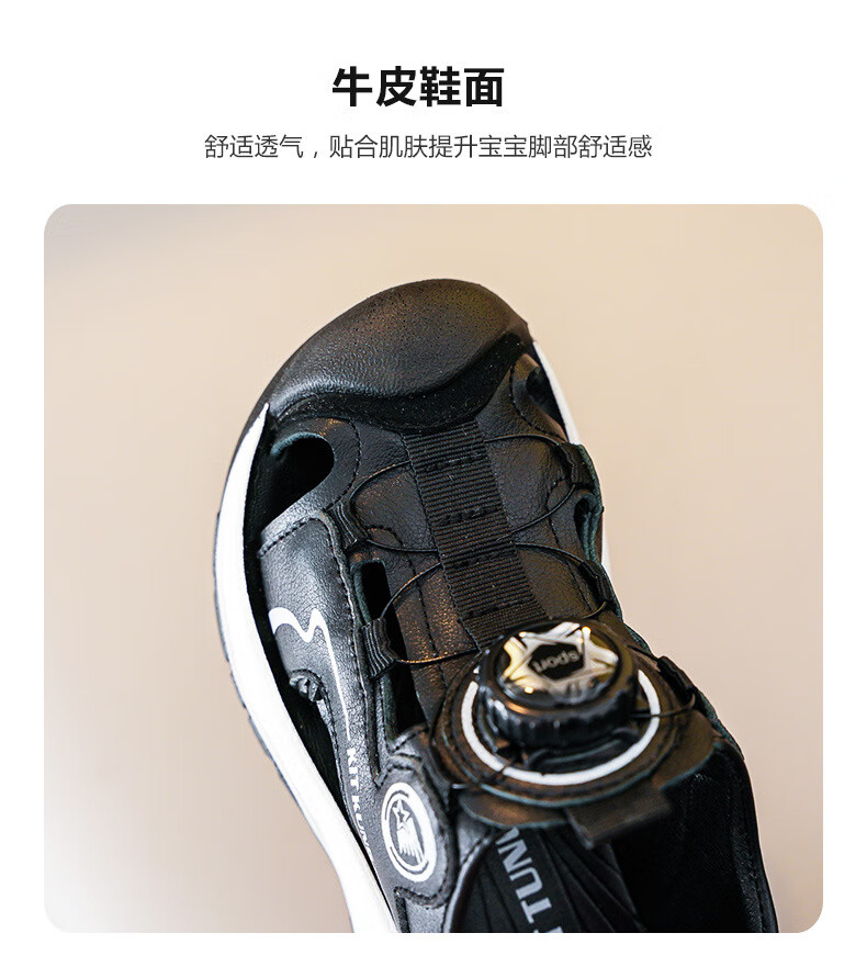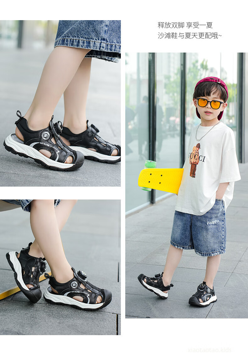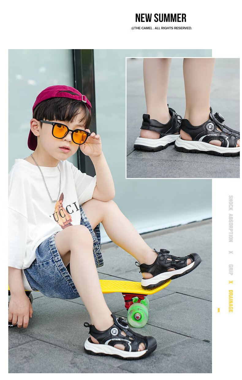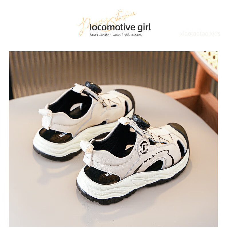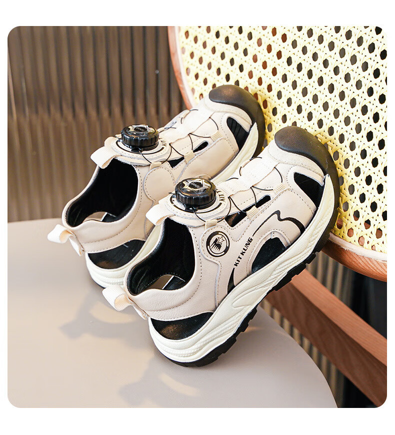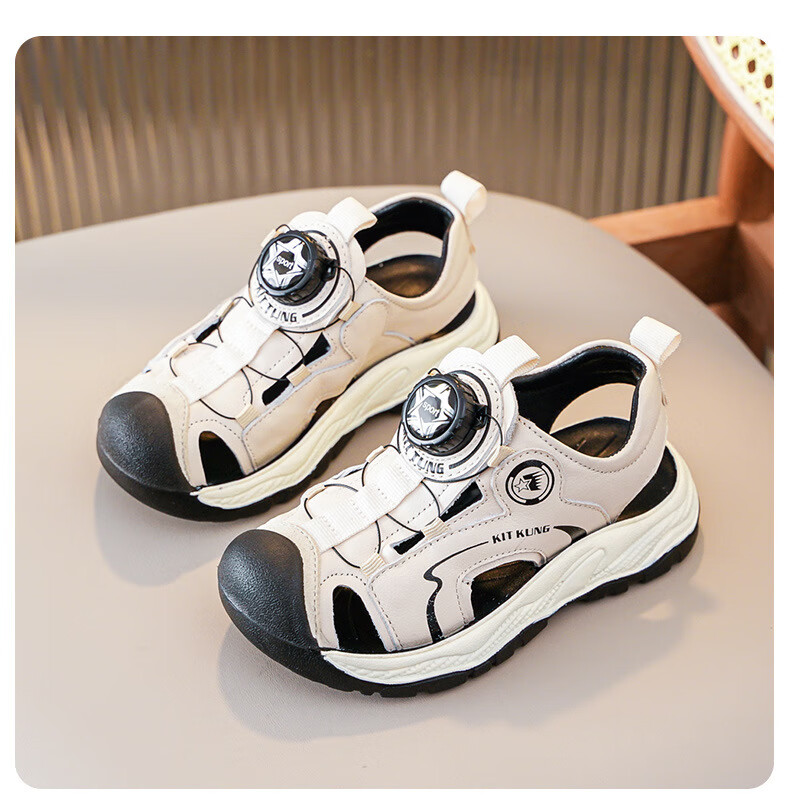 Children's sandals summer style cowhide breathable baby shoes soft sole non-slip swivel buckle boys' toe beach sneakers beige size 26 inner length 16.5cm