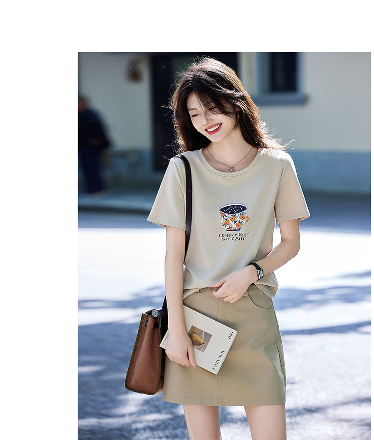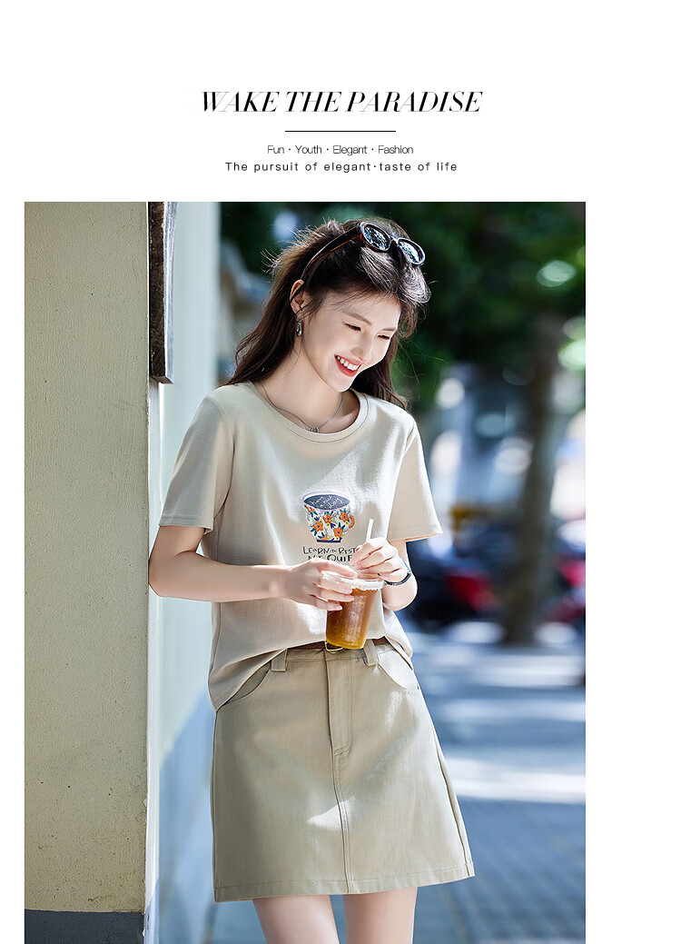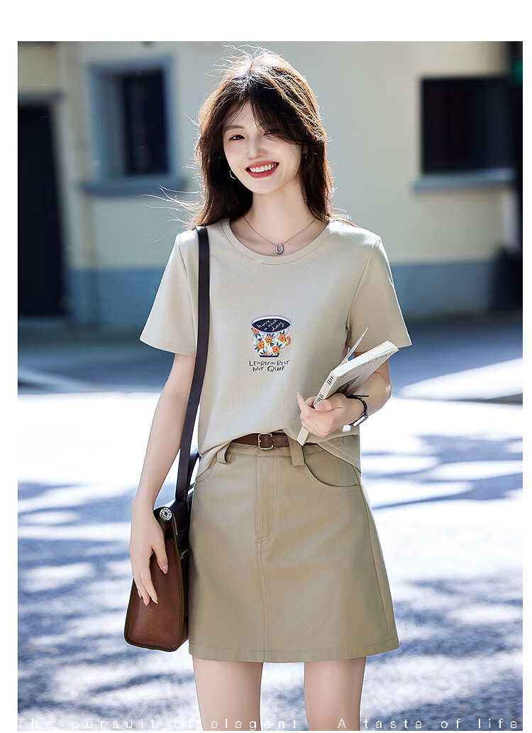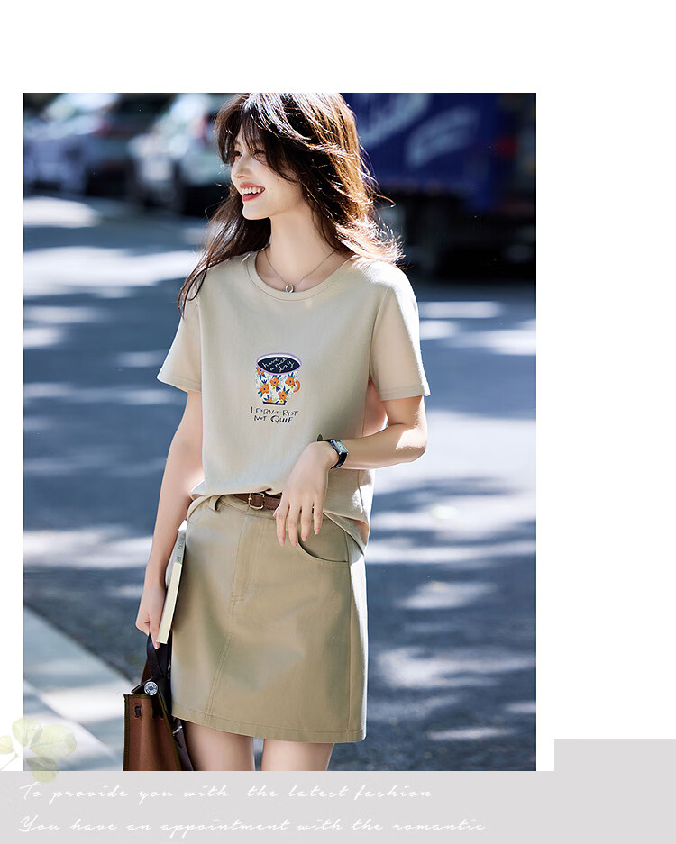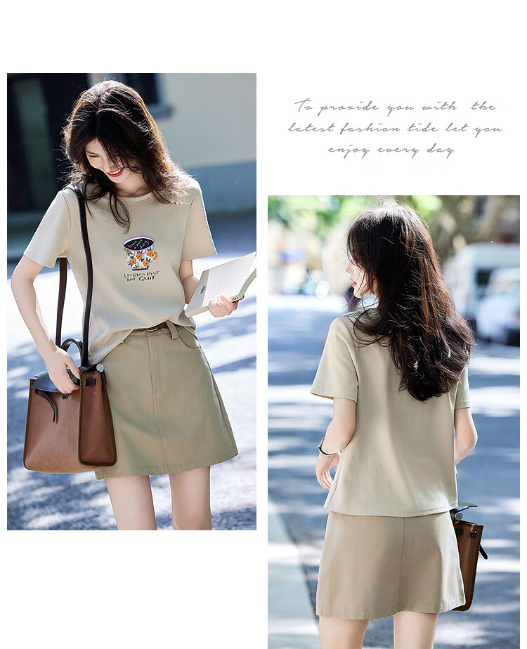 Awakening Paradise Summer Fashion Letter Printed Round Neck Short Sleeve T-Shirt Top High Waist Belted Skirt Casual Suit Khaki S