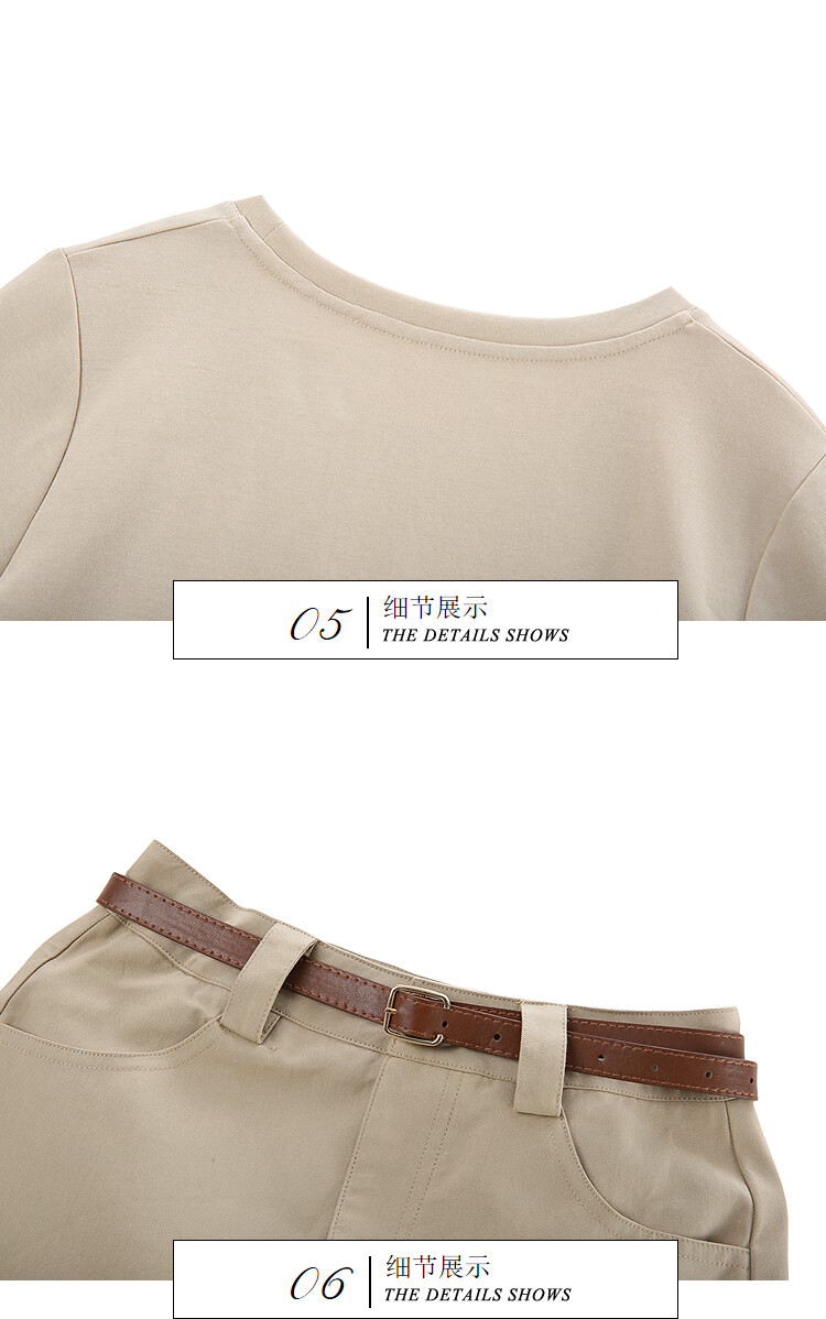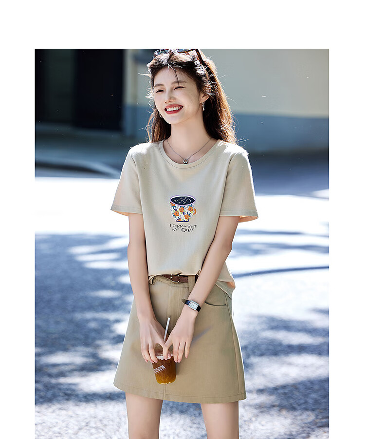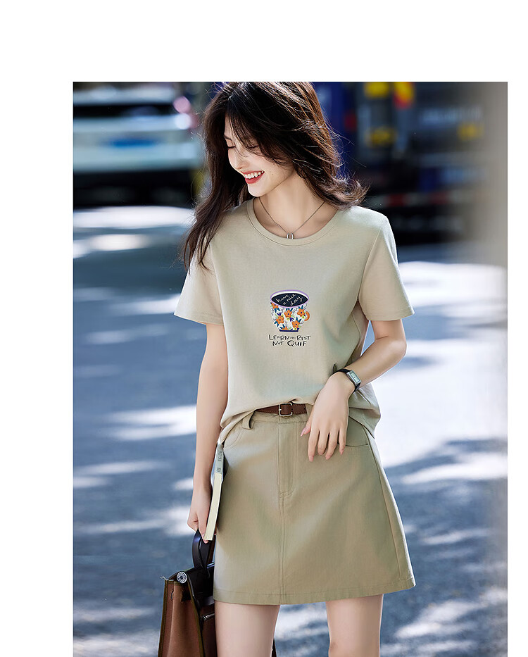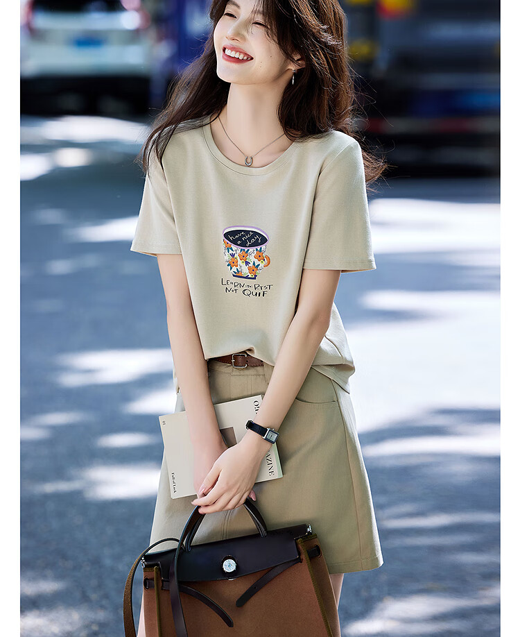 Awakening Paradise Summer Fashion Letter Printed Round Neck Short Sleeve T-Shirt Top High Waist Belted Skirt Casual Suit Khaki S