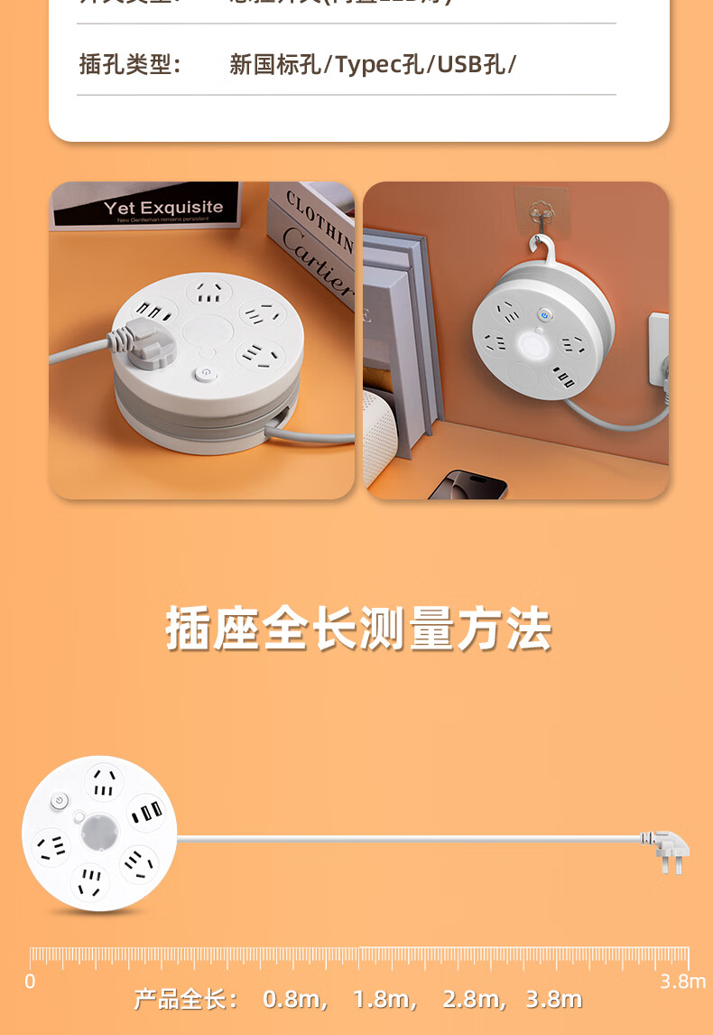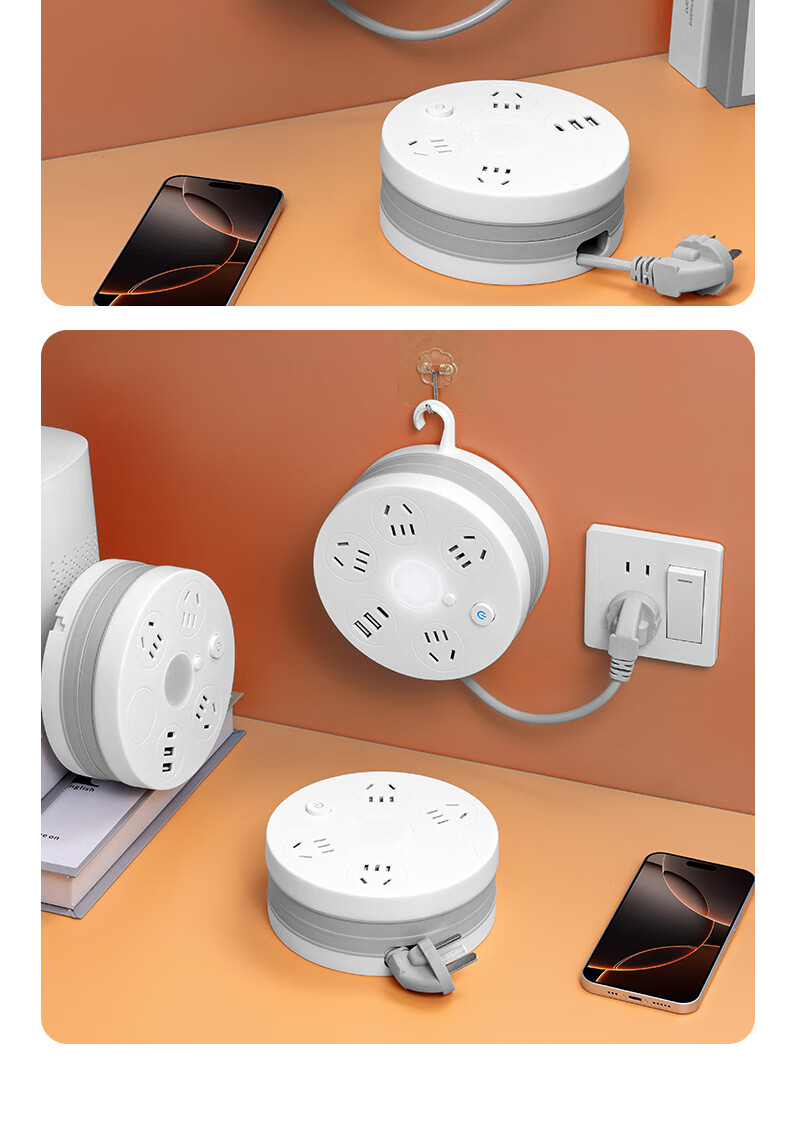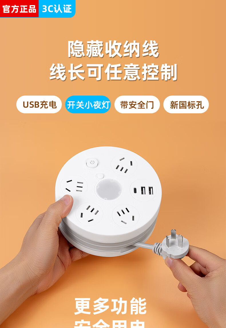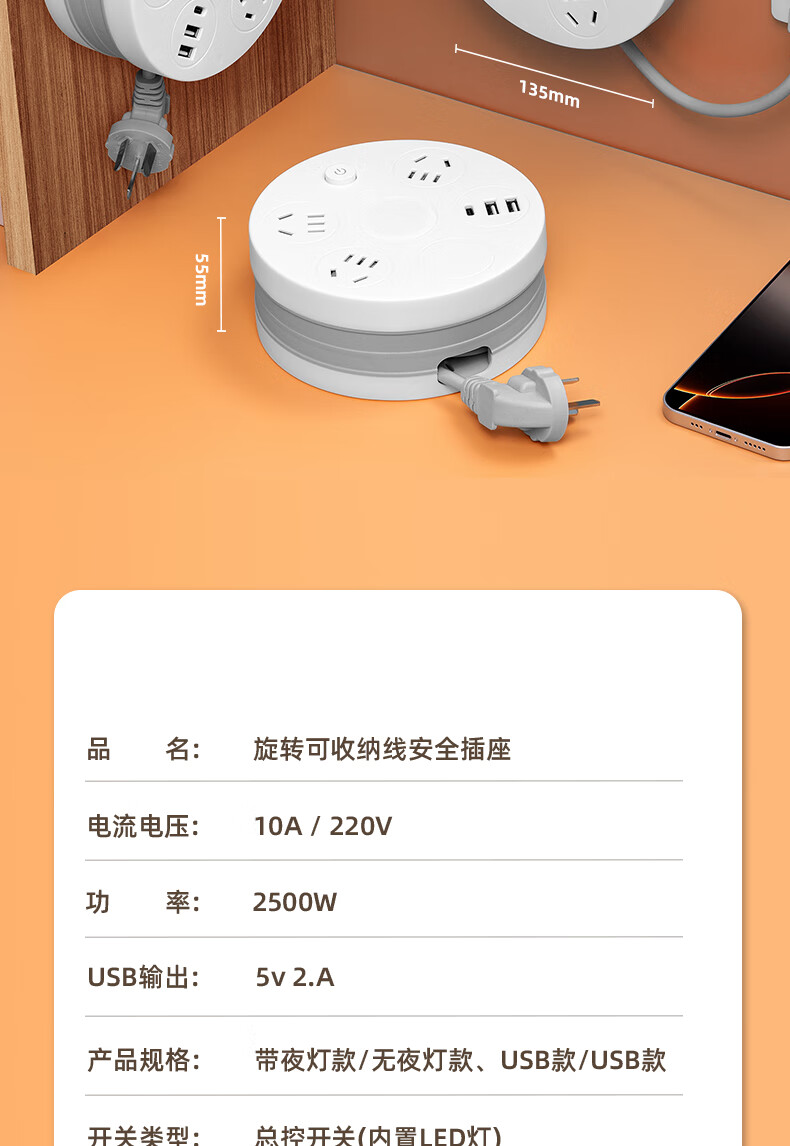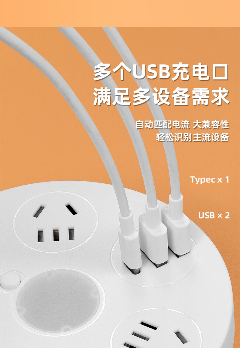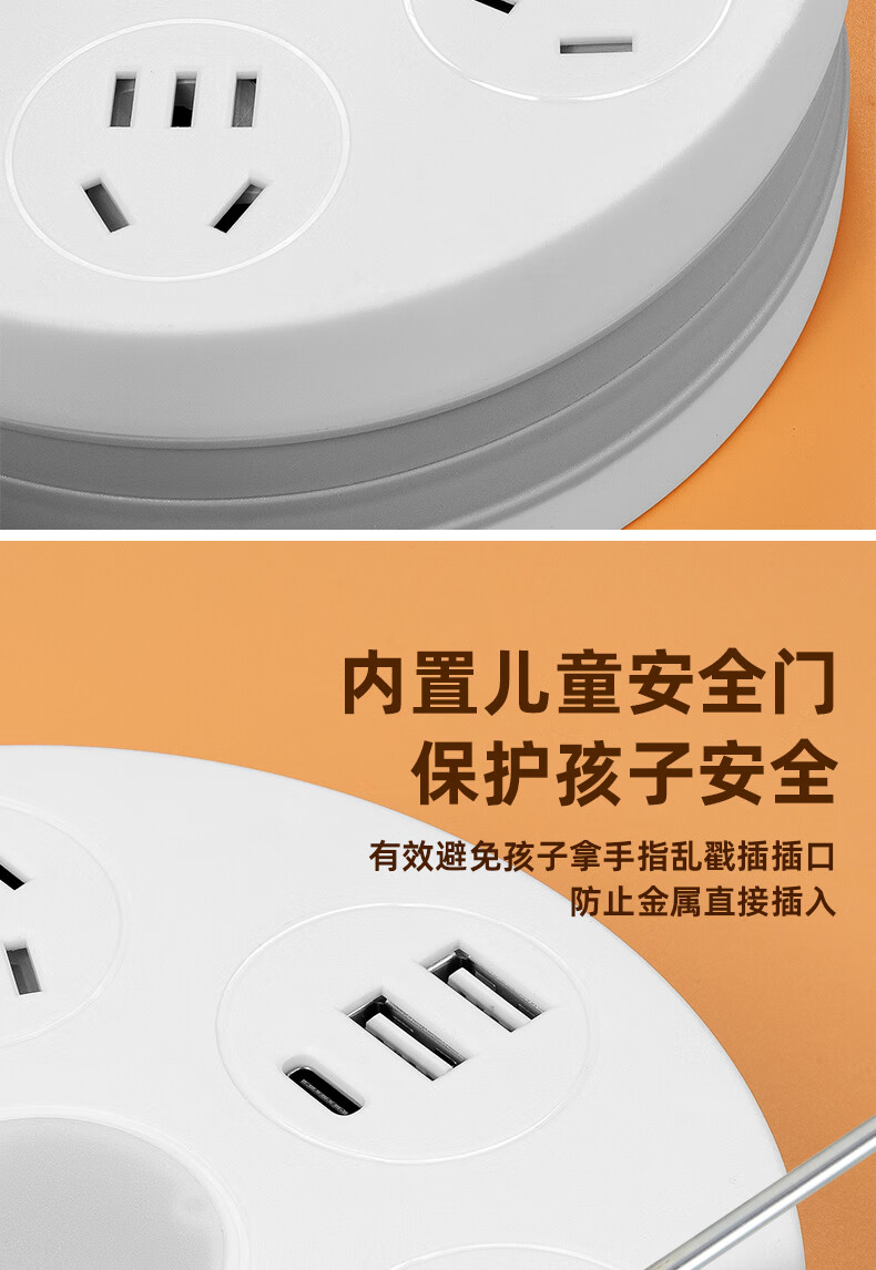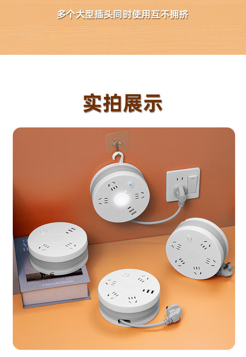 Bull (BULL) same style pure copper strip retractable storage socket multi-functional socket with light household plug board Bull five-position jack USB + night light 2.8