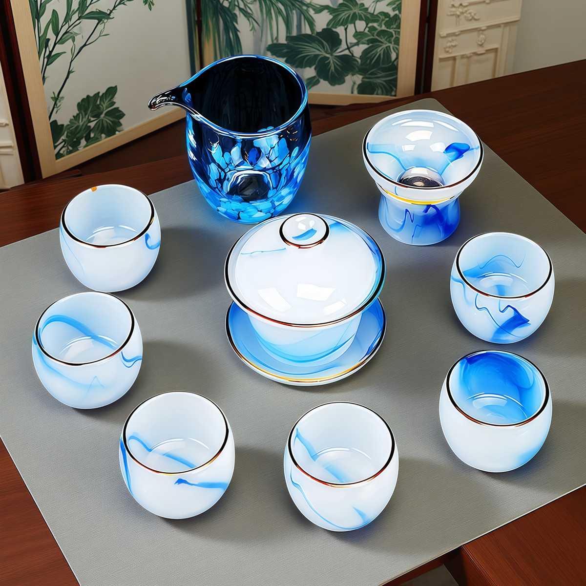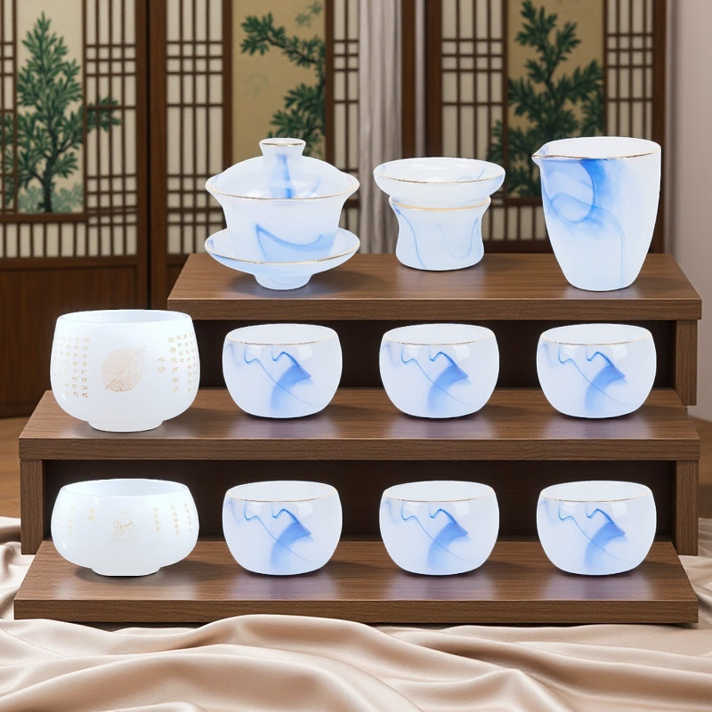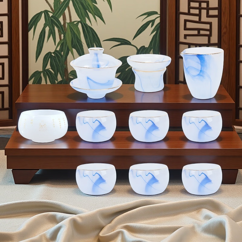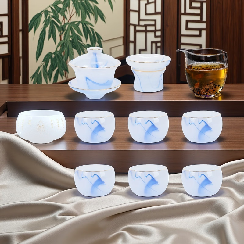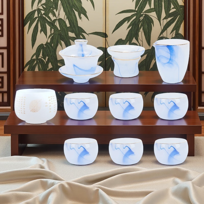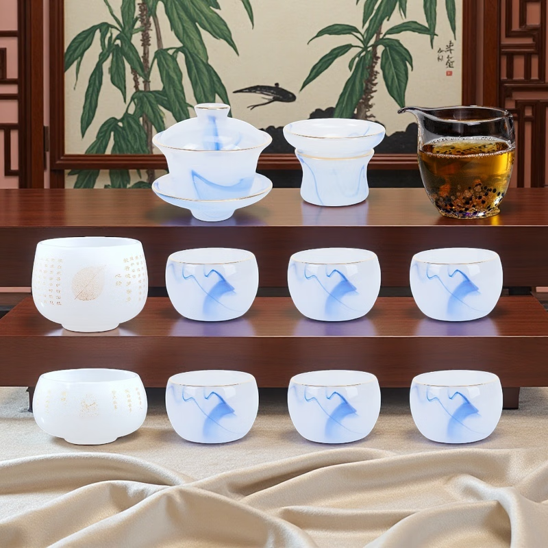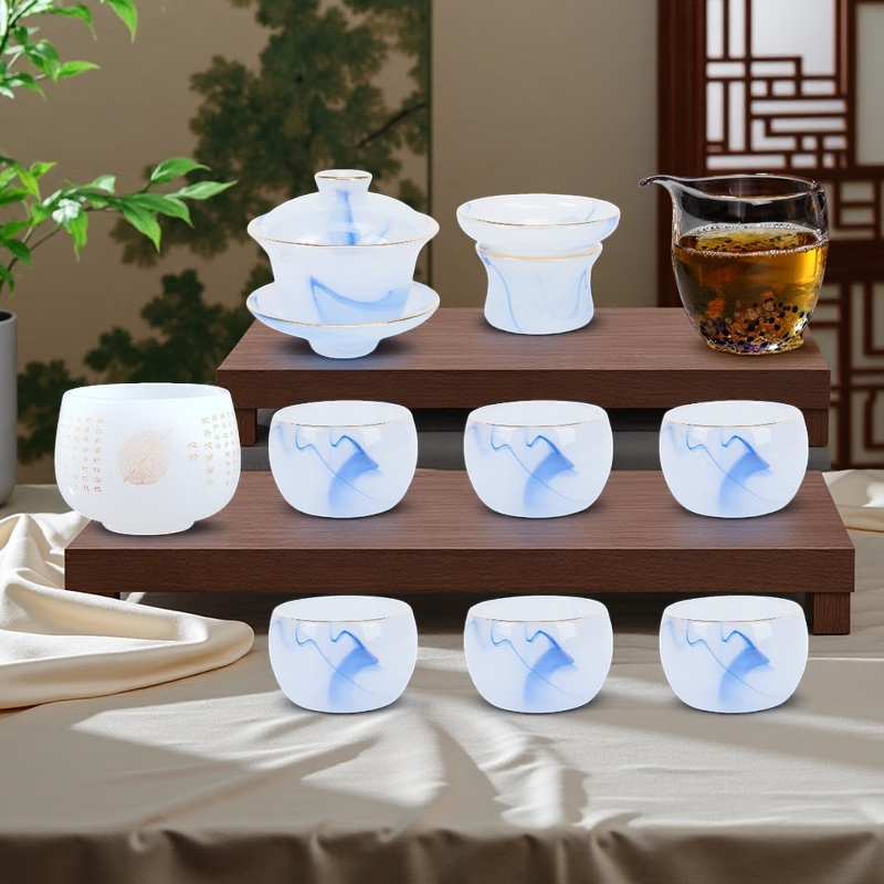 Fumei ancient house, gilt blue and white jade porcelain Kung Fu tea set, high-end gift box for elders and friends, business gift for housewarming and opening ceremony, gilt blue and white jade porcelain tea set, Buddha said crystal cup, 11 pieces