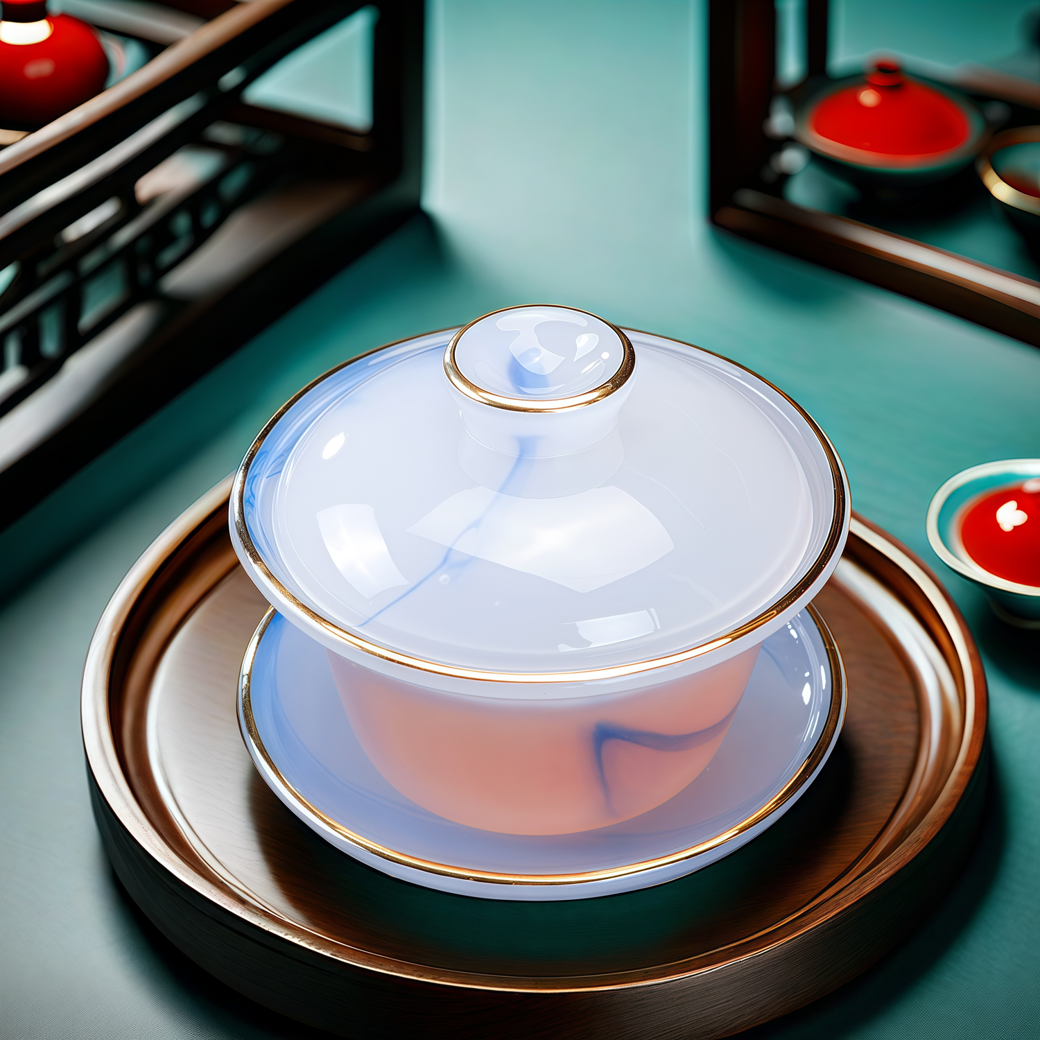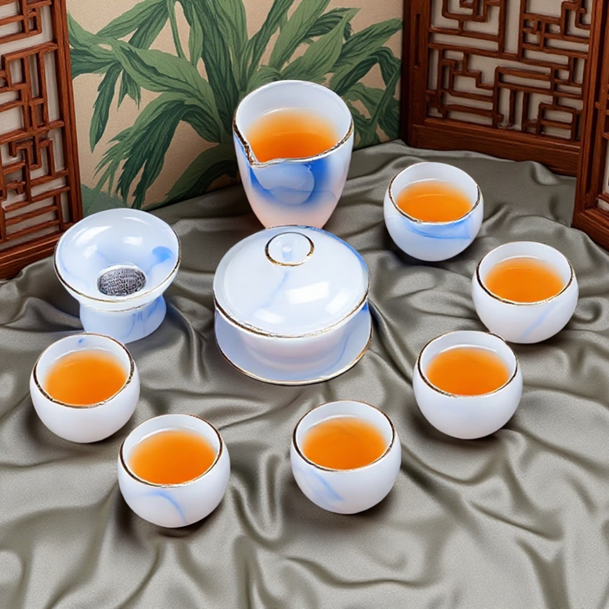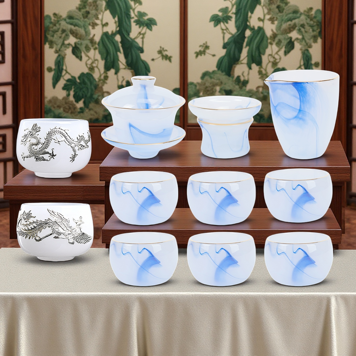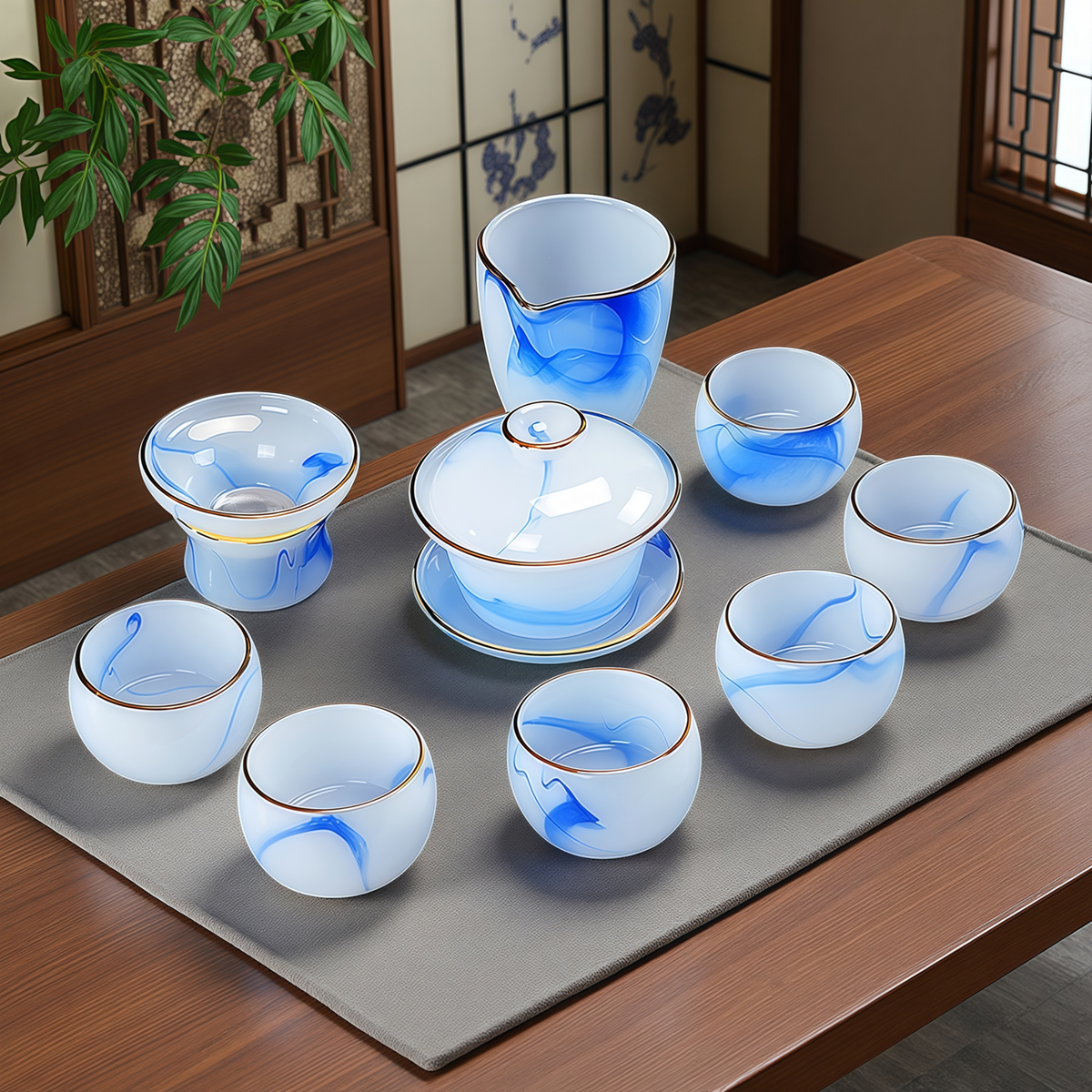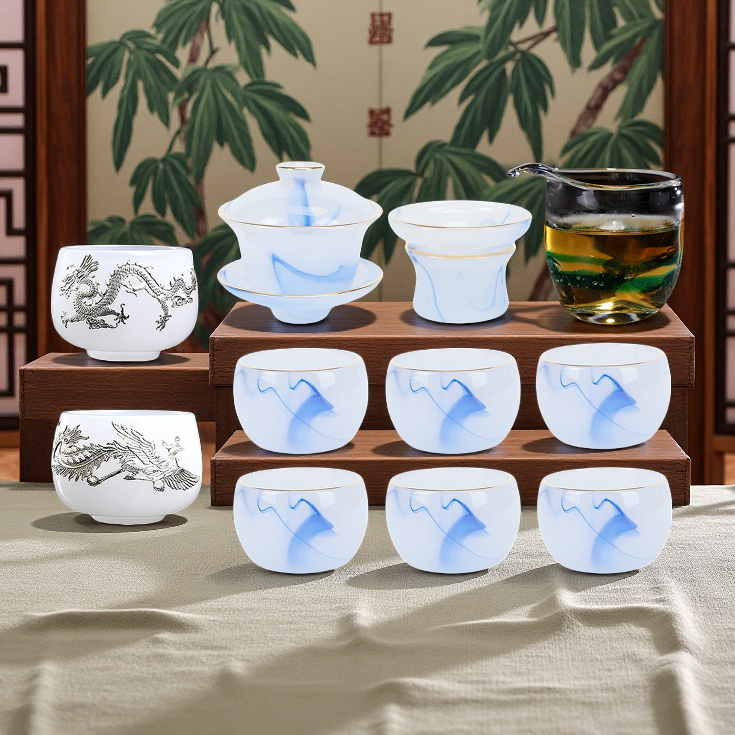 Fumei ancient house, gilt blue and white jade porcelain Kung Fu tea set, high-end gift box for elders and friends, business gift for housewarming and opening ceremony, gilt blue and white jade porcelain tea set, Buddha said crystal cup, 11 pieces
