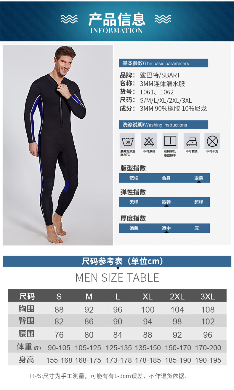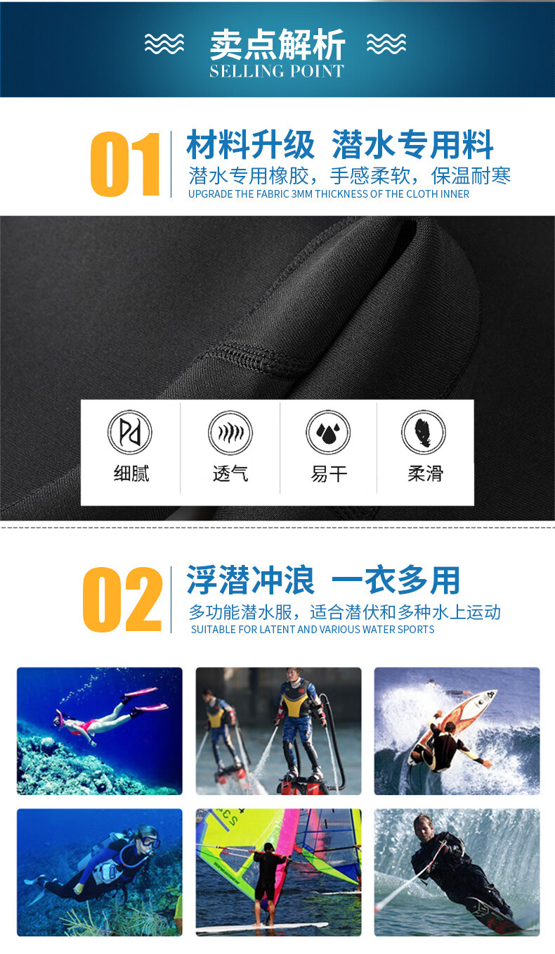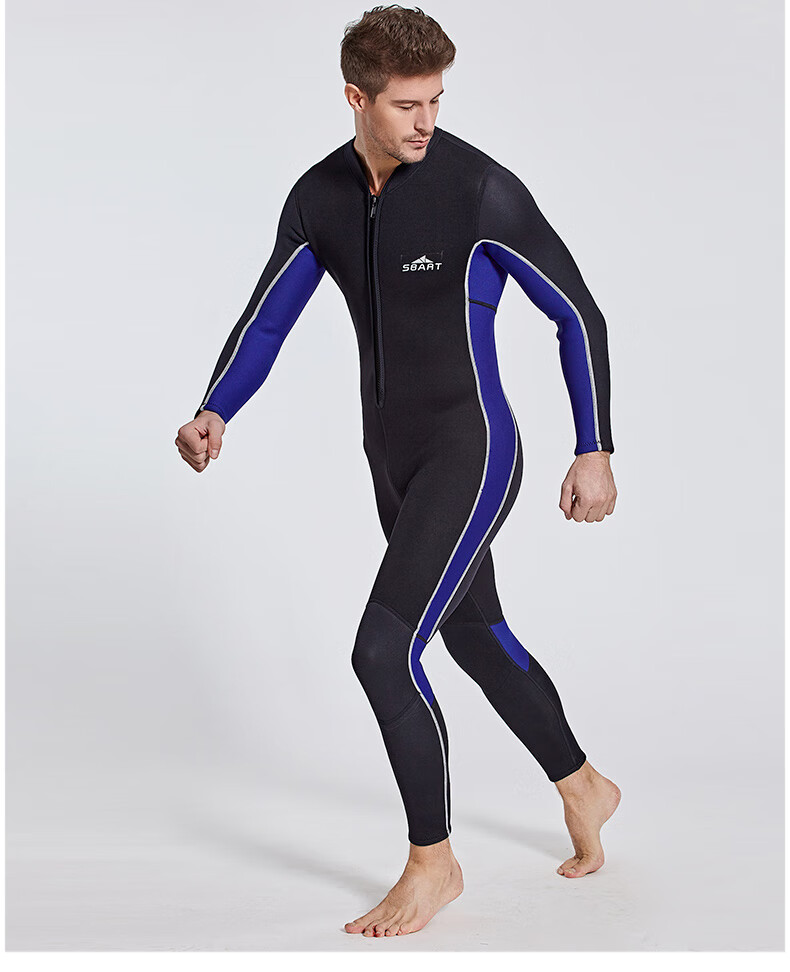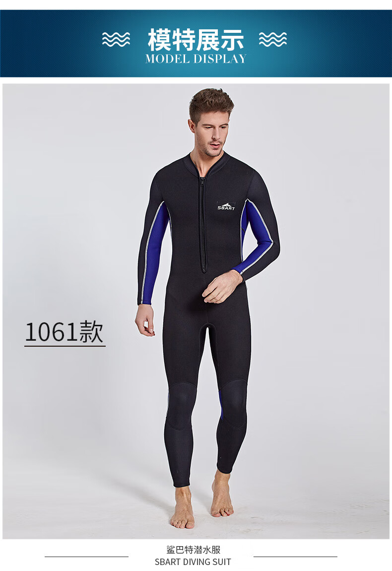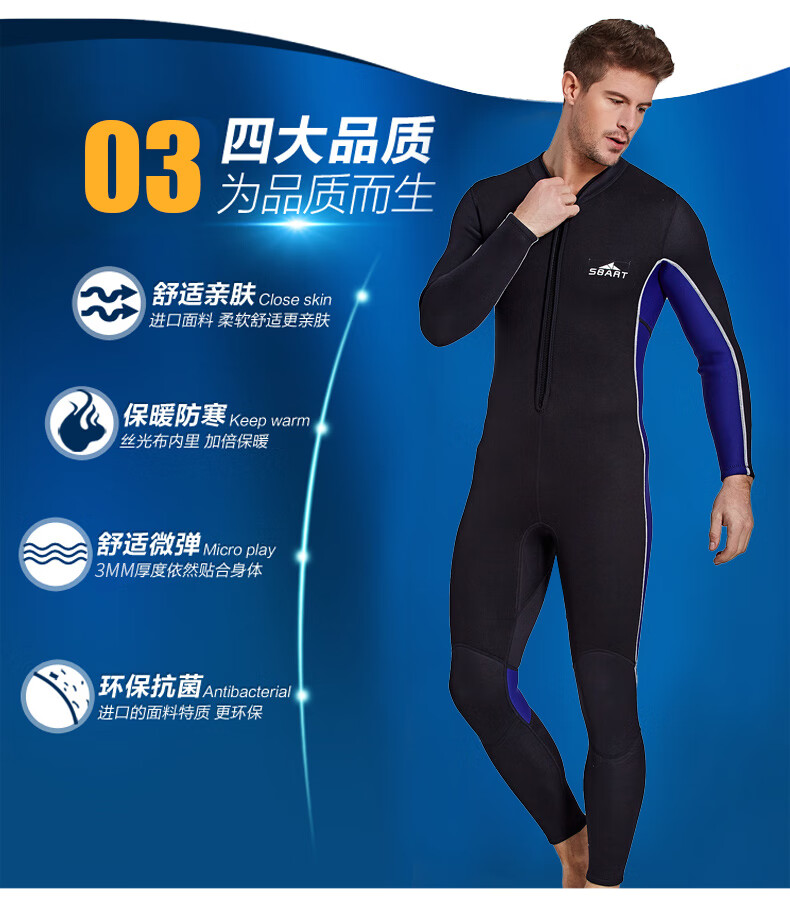 He Jiagong couple's long-sleeved 3MM thickened and warm men's and women's one-piece swimsuit surfing suit jellyfish suit diving black and water blue S