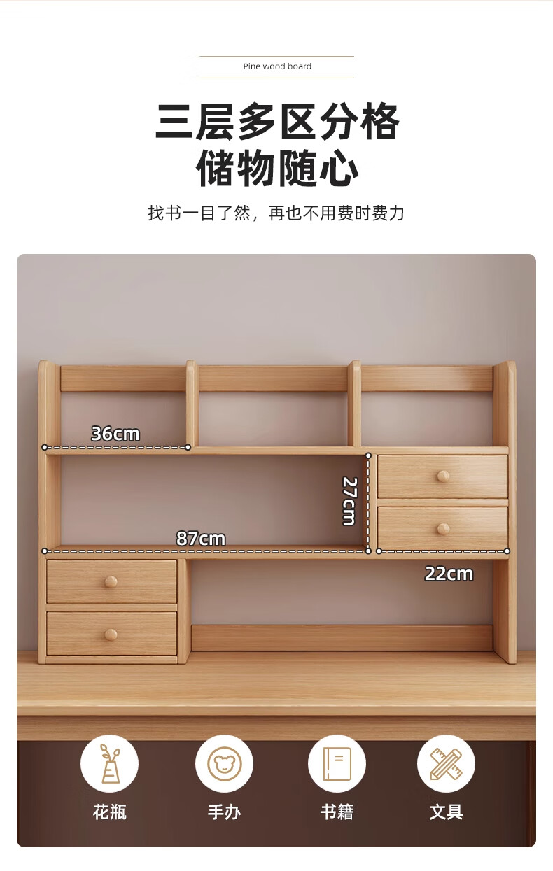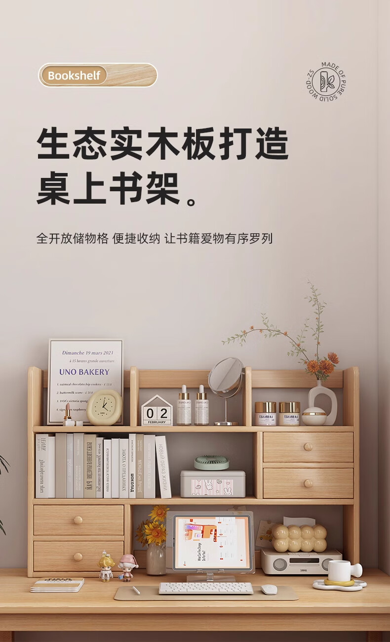 Medieval style high-quality solid wood bookshelf desktop storage rack for home dormitory office reading desk multi-layer storage rack ecological board Lantau cedar wood 60cm assembled
