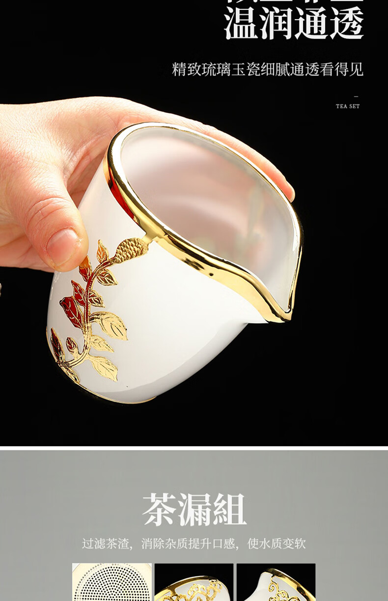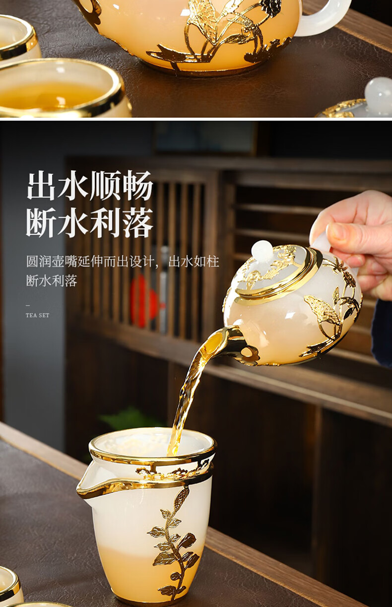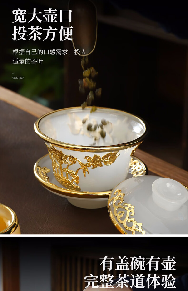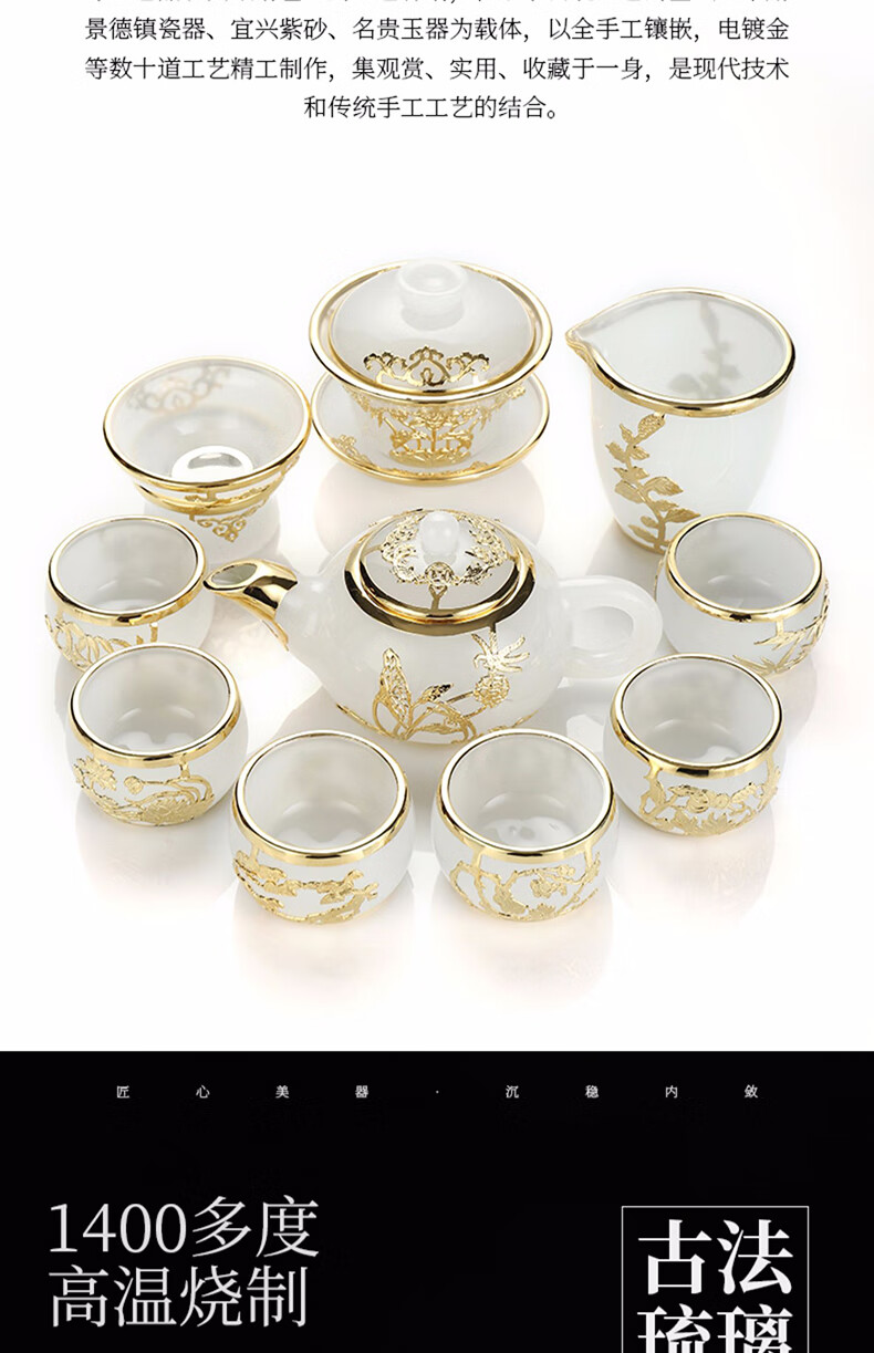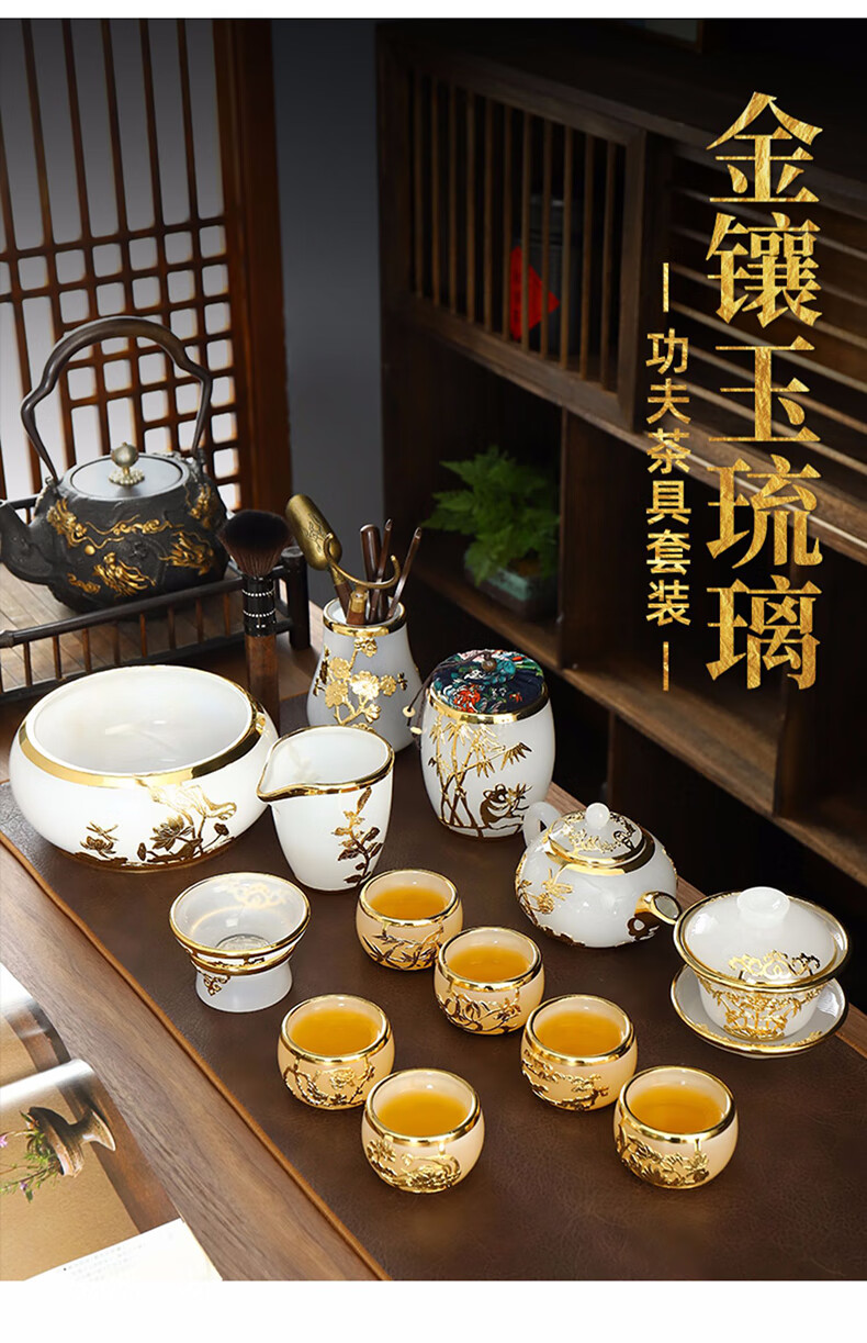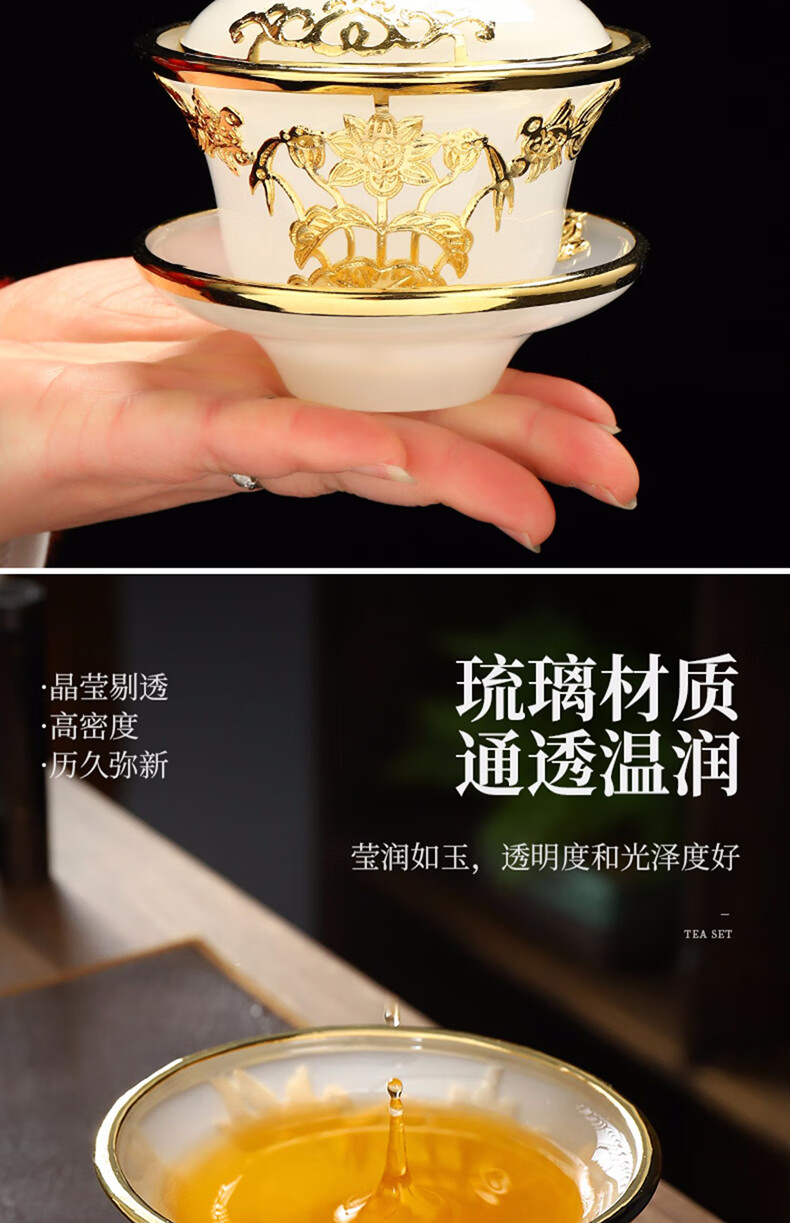 Chengyun Shangzun inlaid with gold and jade tea set, colored glaze pure handmade Kung Fu tea cup set, home office gift teapot cover bowl, colored glaze set (large set of 14 heads)