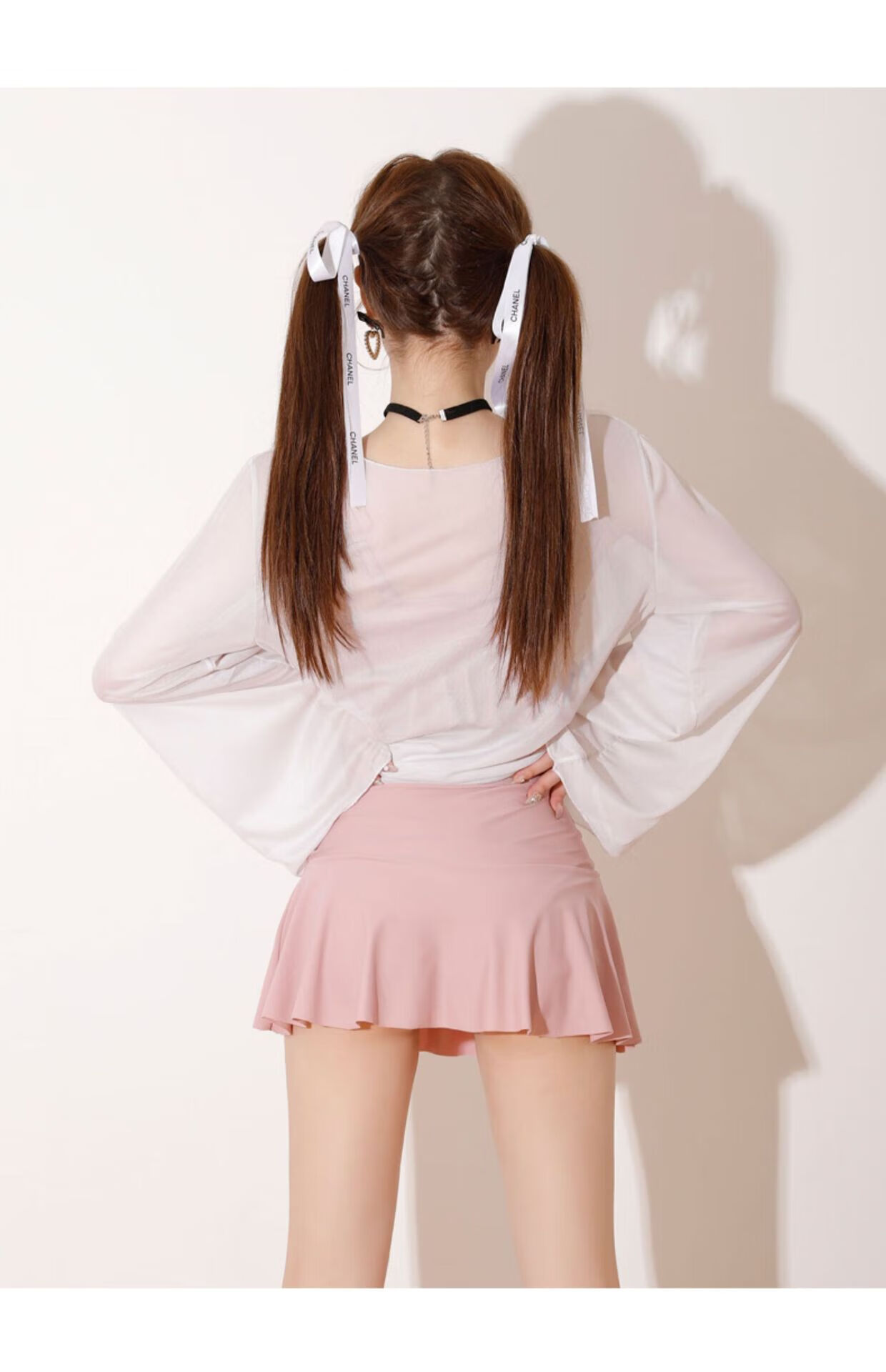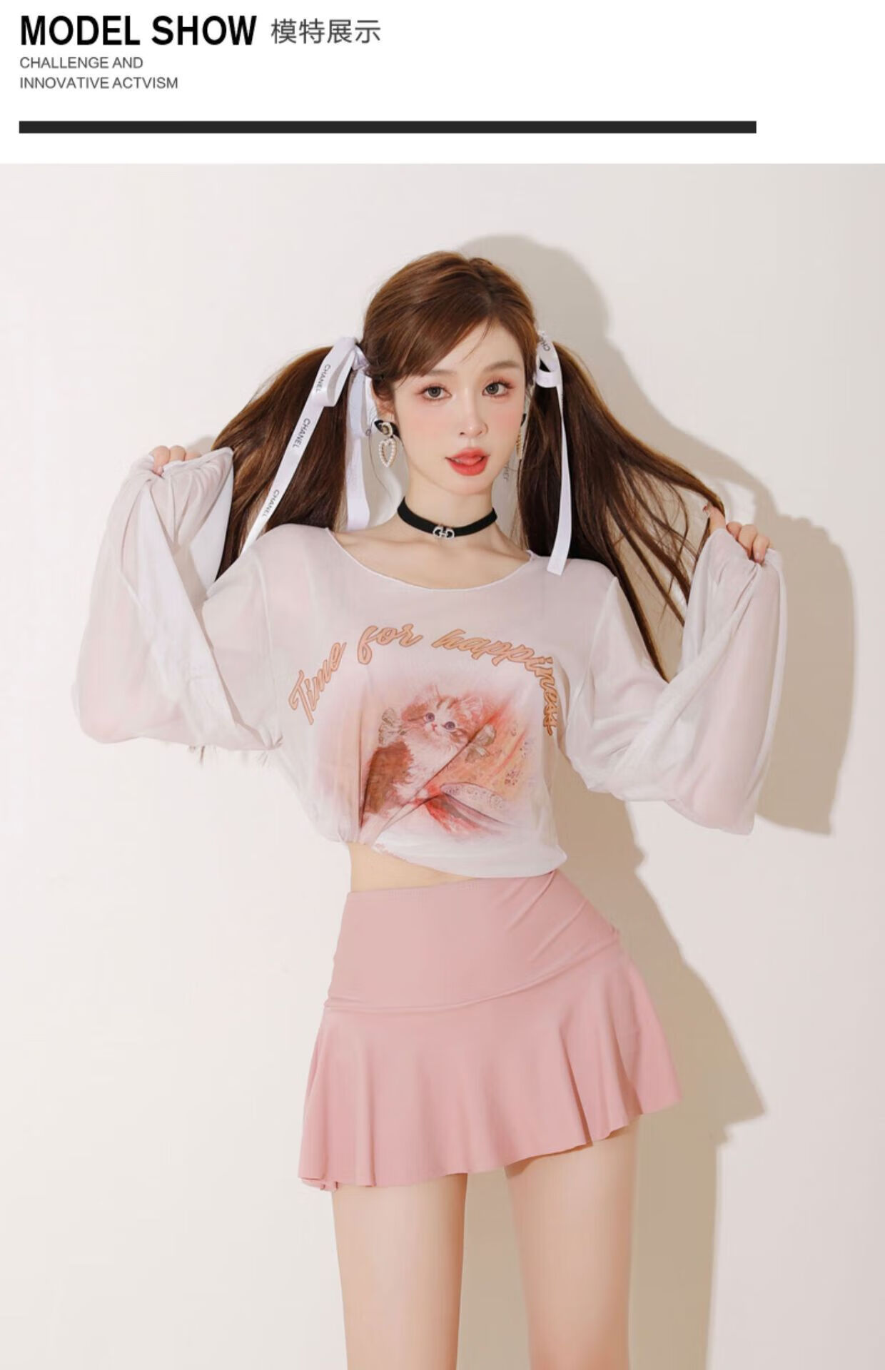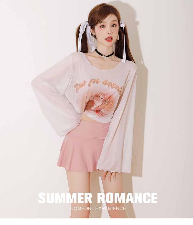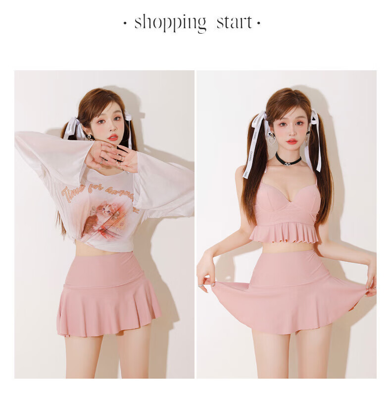 Lugeli swimsuit for women, conservative split long-sleeved blouse, skirt style, sun protection, flesh-covering, slimming, hot spring vacation, simple style swimsuit, three-piece set, pink, one size fits all, 80-120Jin Jin is equal to 0.5 kg, can be worn