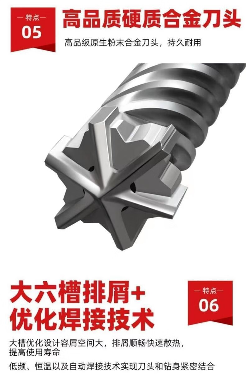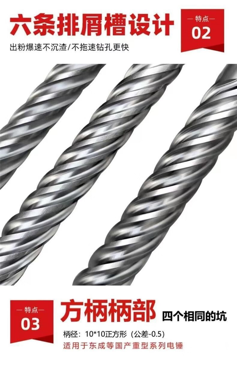 Six-blade impact drill bit, wall drill bit, cross electric hammer drill bit, hexagonal square head, round head, reinforced electric concrete drilling, square handle, 4 pits, diameter*total length, 25*500, one six-blade