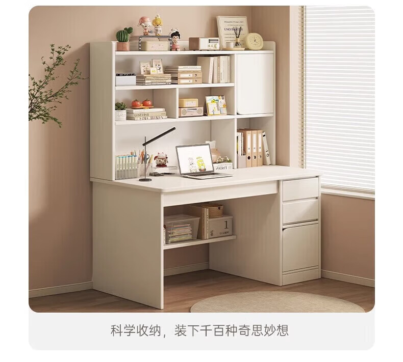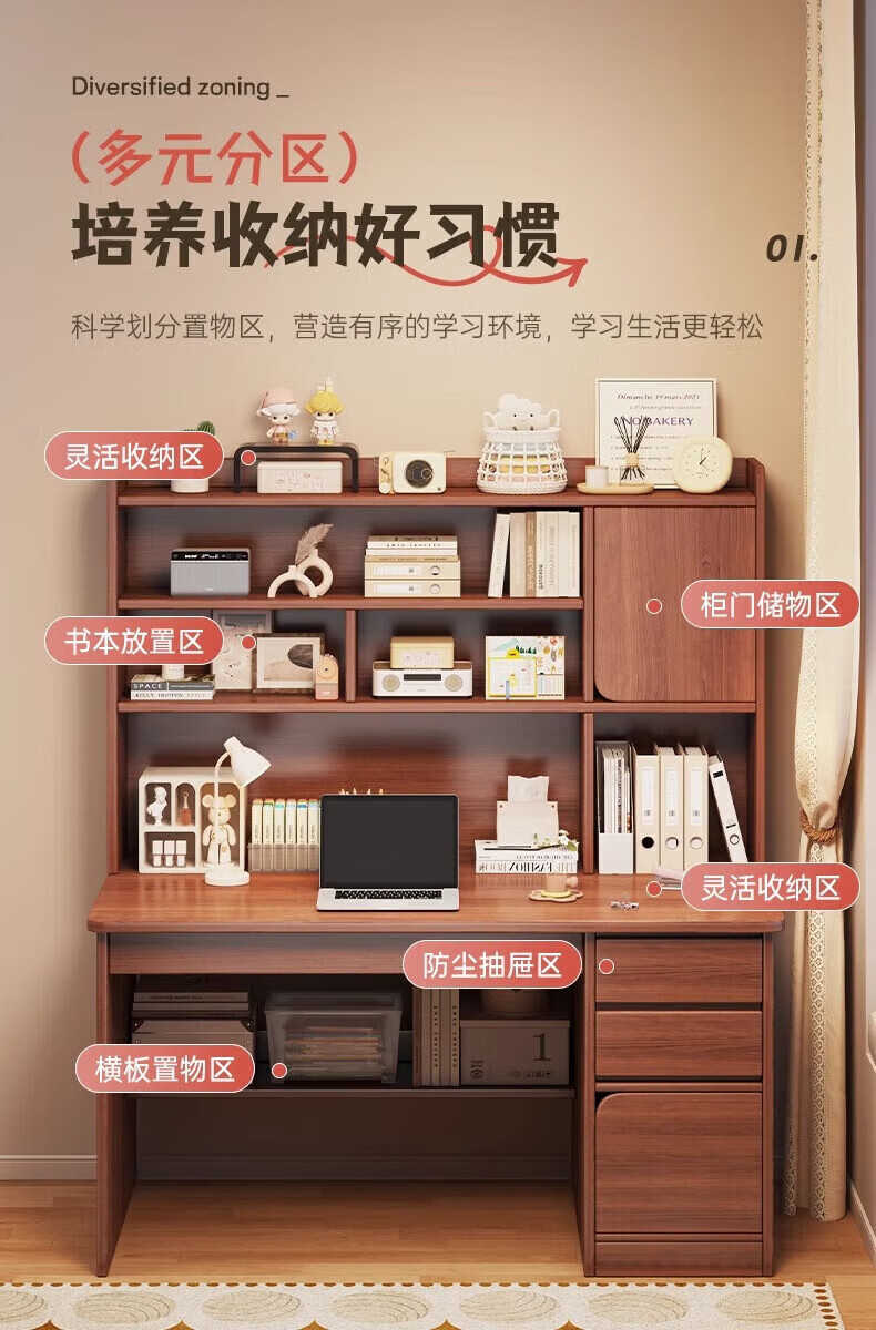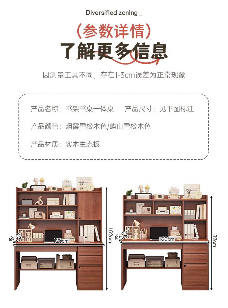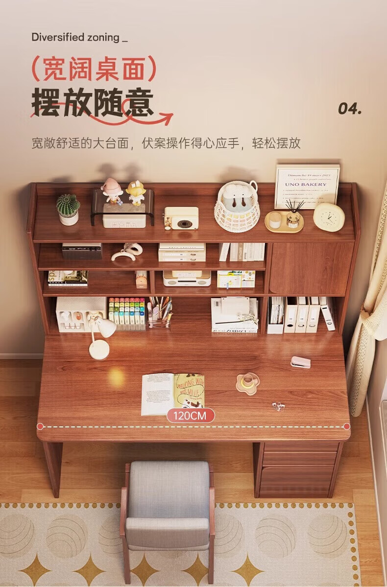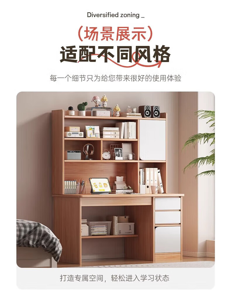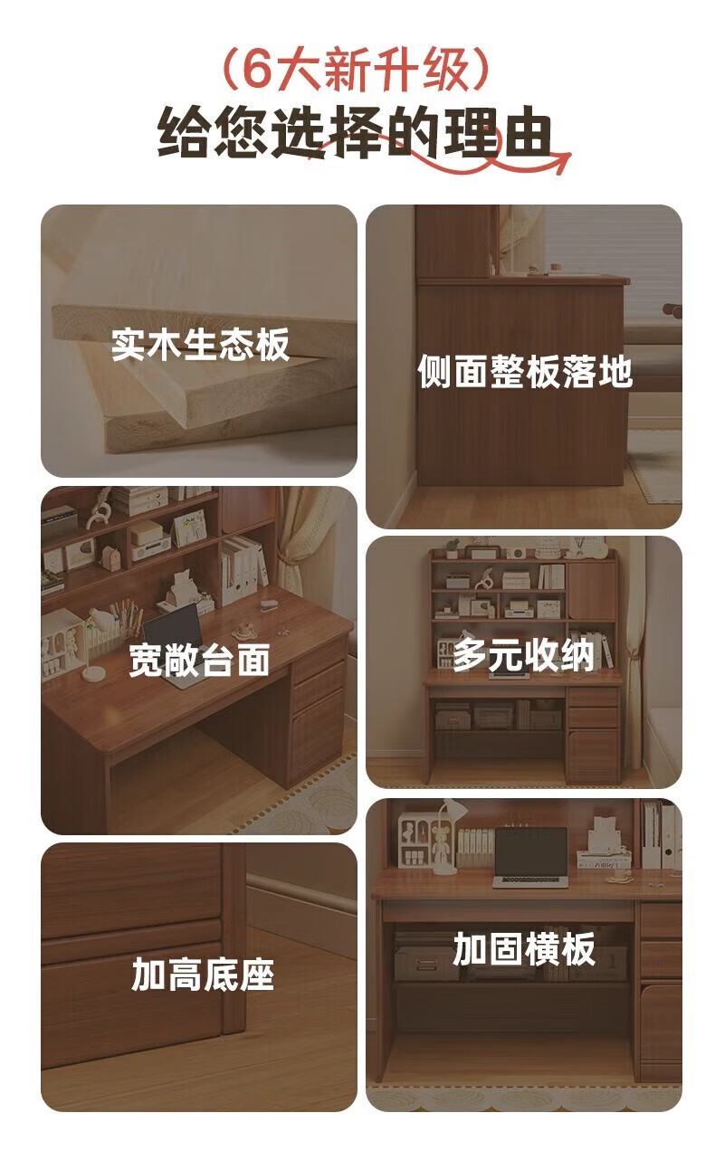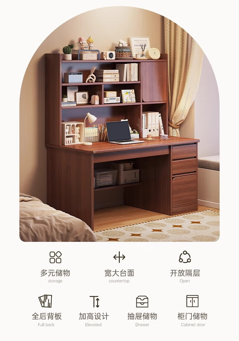 Solid wood core desk student home study desk bedroom bookshelf integrated table bookcase wall computer desk solid wood ecological board 120cm walnut color heightening