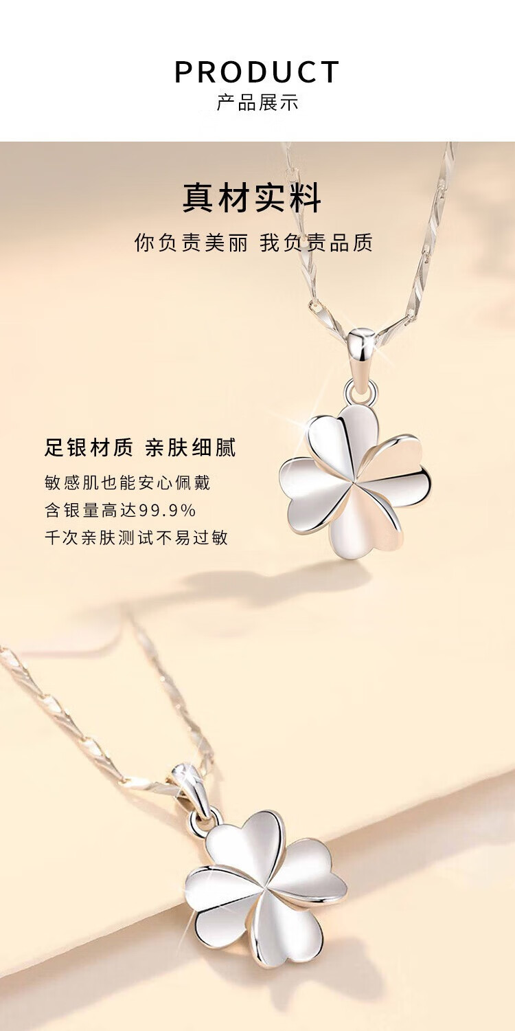 999 pure silver four-leaf clover necklace for women, simple and versatile pendant accessories for girlfriend’s birthday gift, four-leaf clover (single pendant) + brand gift box + certificate