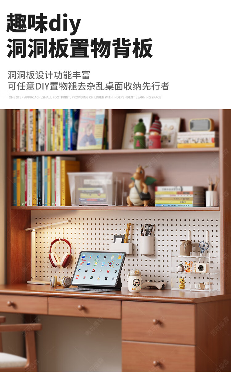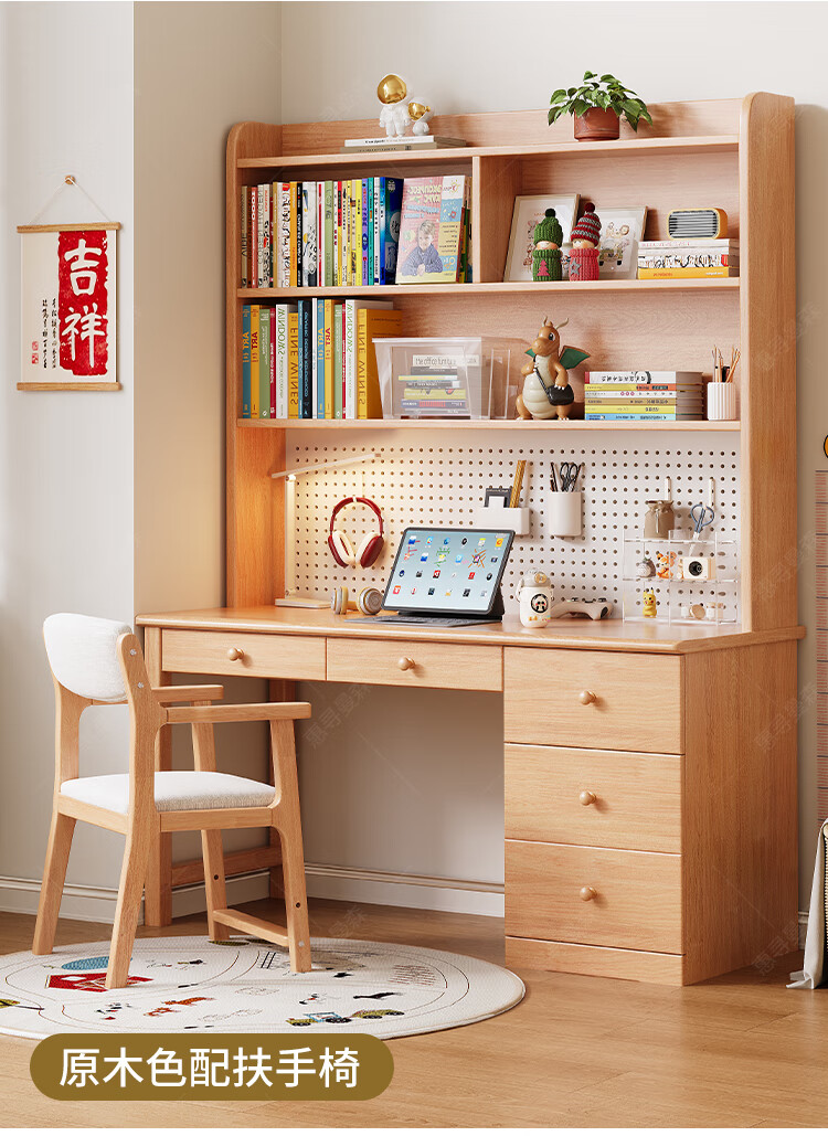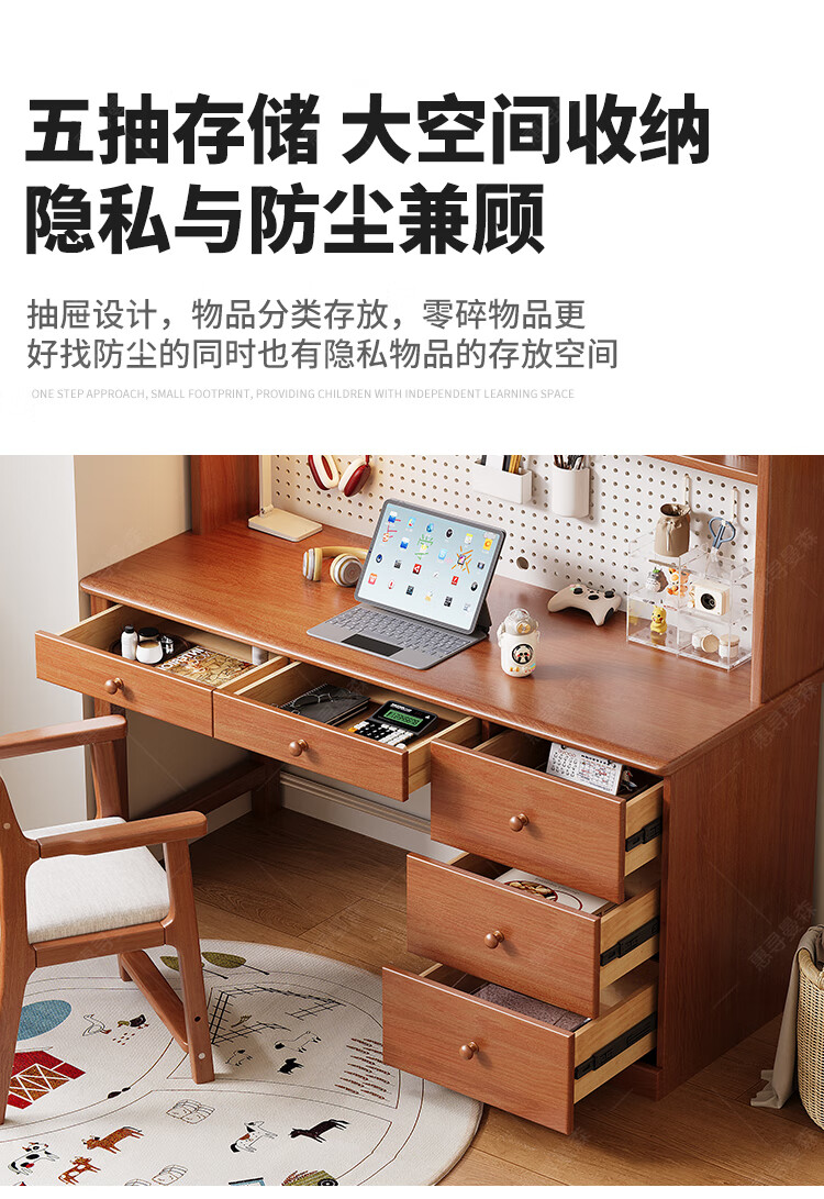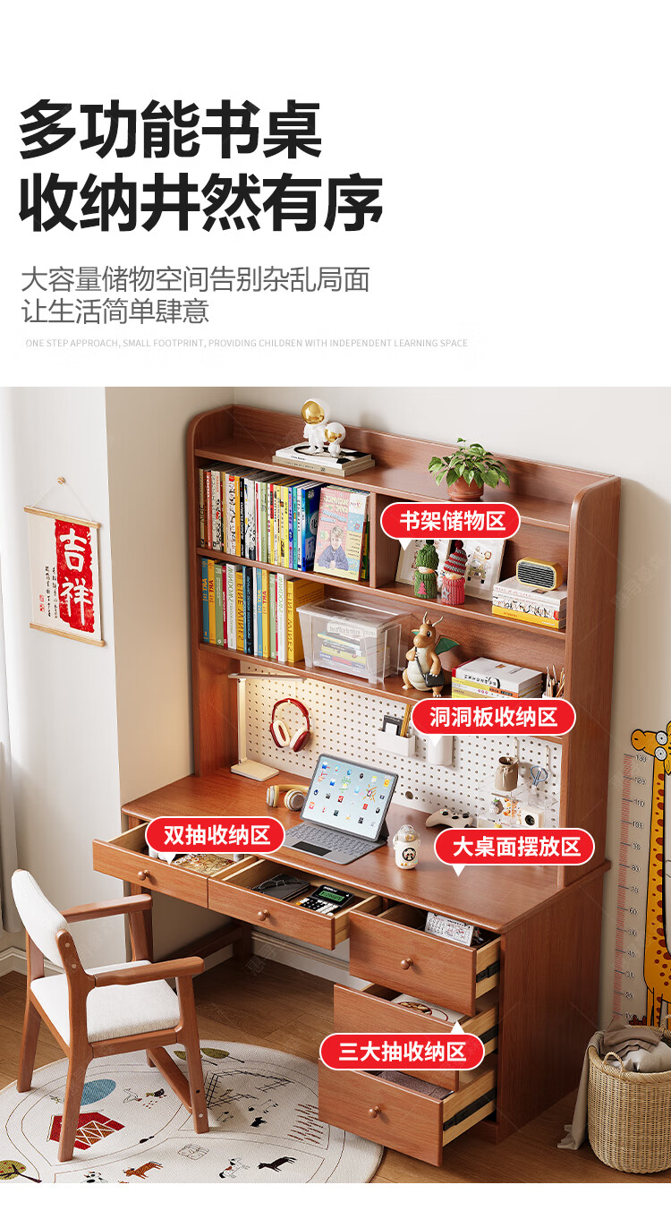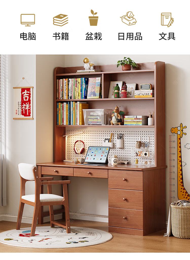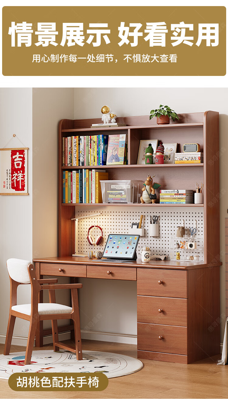 Huixun solid wood desk with bookshelf integrated table perforated board student children study table bedroom home office computer table walnut color desk + bookshelf 100cm*60cm*75cm total height 190cm