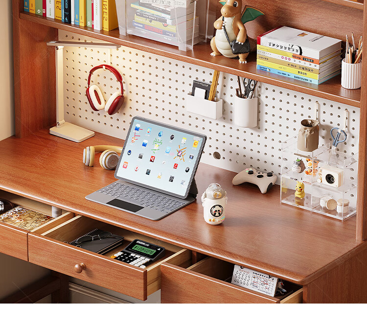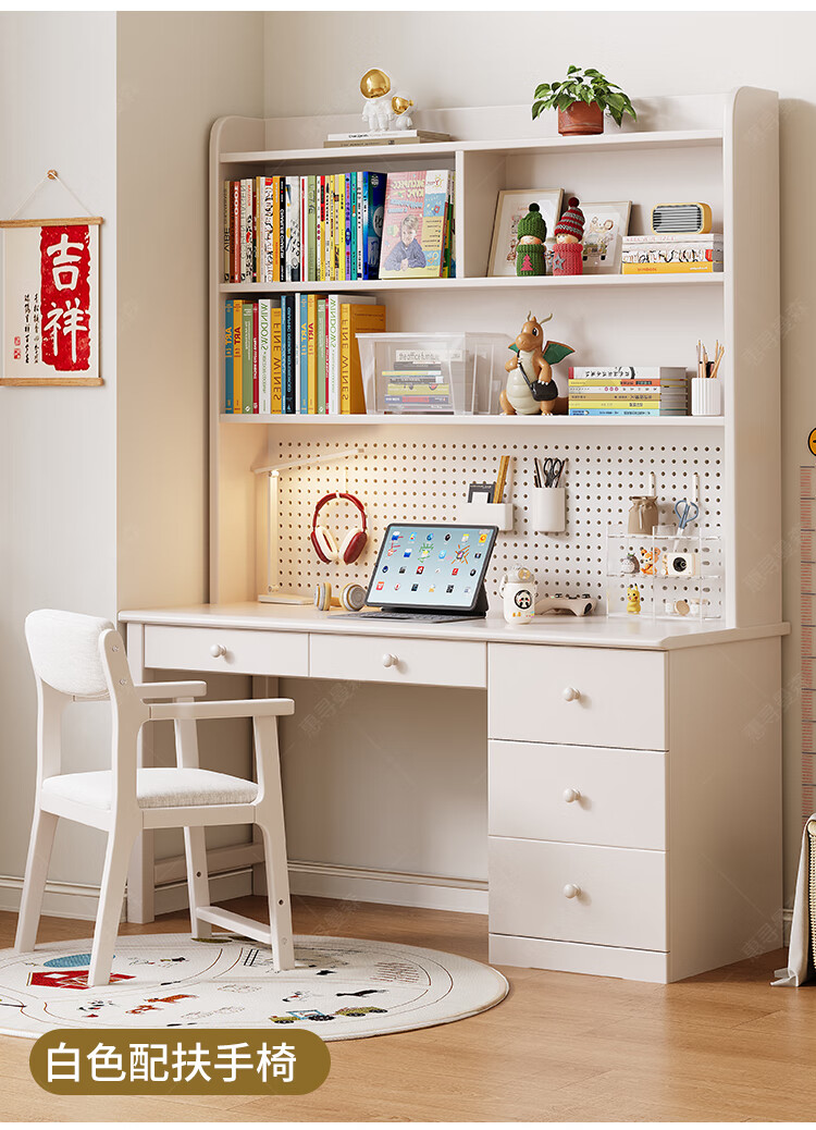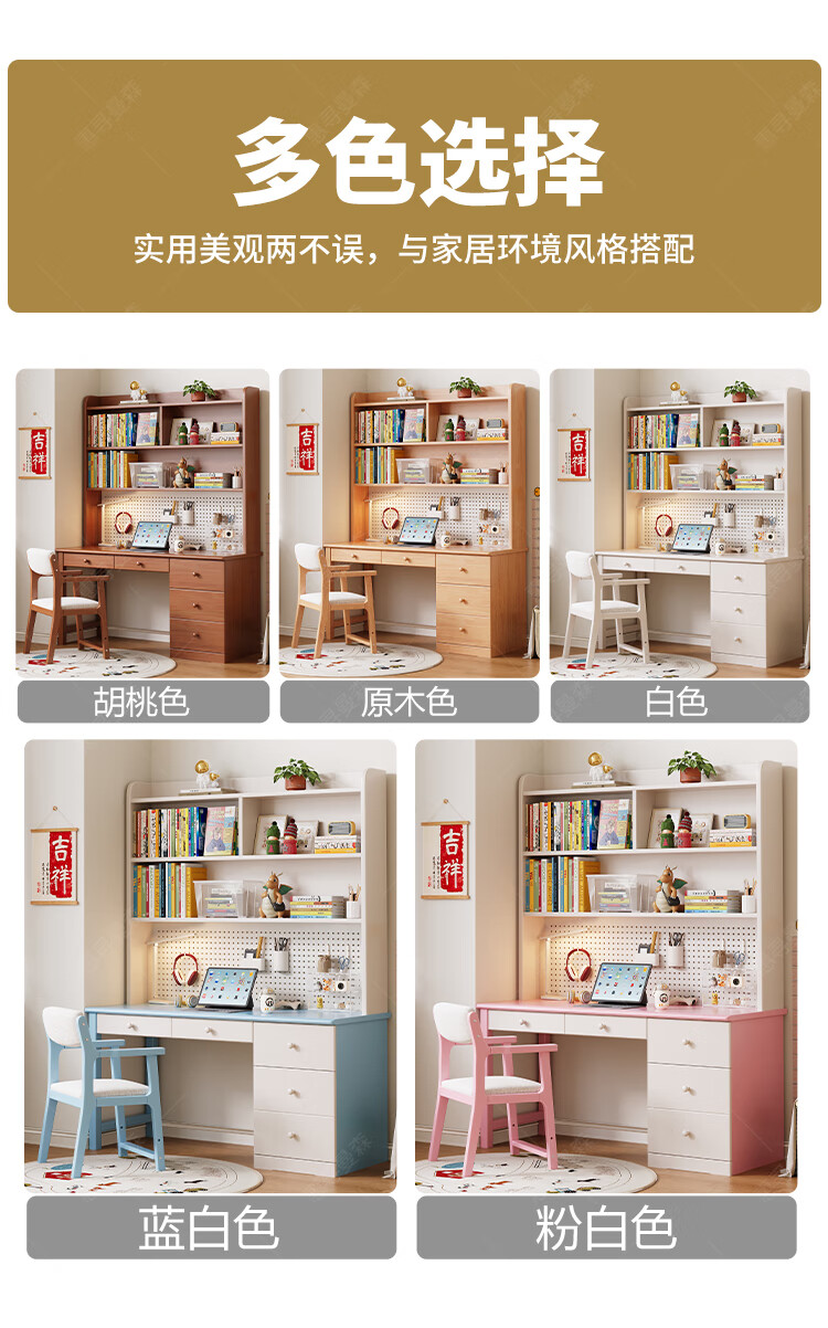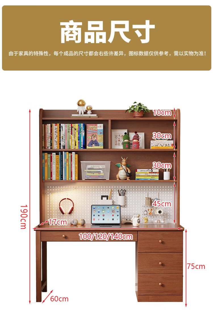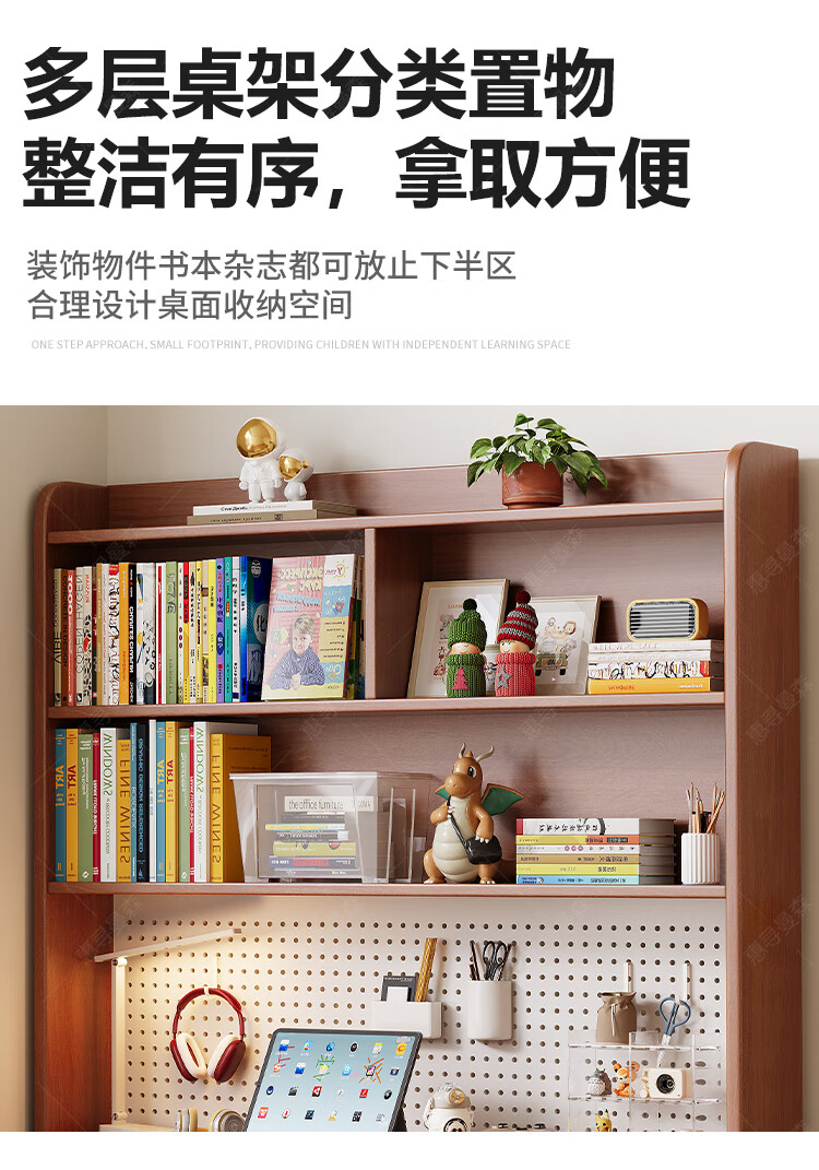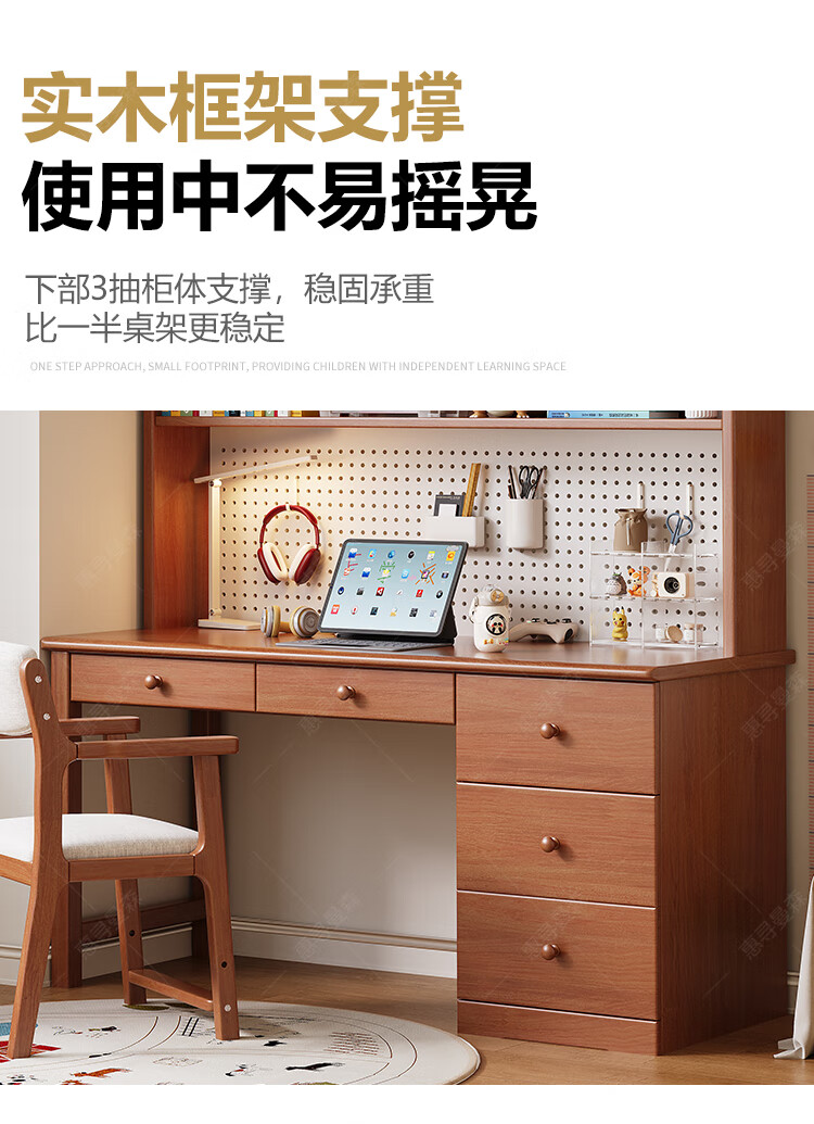 Huixun solid wood desk with bookshelf integrated table perforated board student children study table bedroom home office computer table walnut color desk + bookshelf 100cm*60cm*75cm total height 190cm