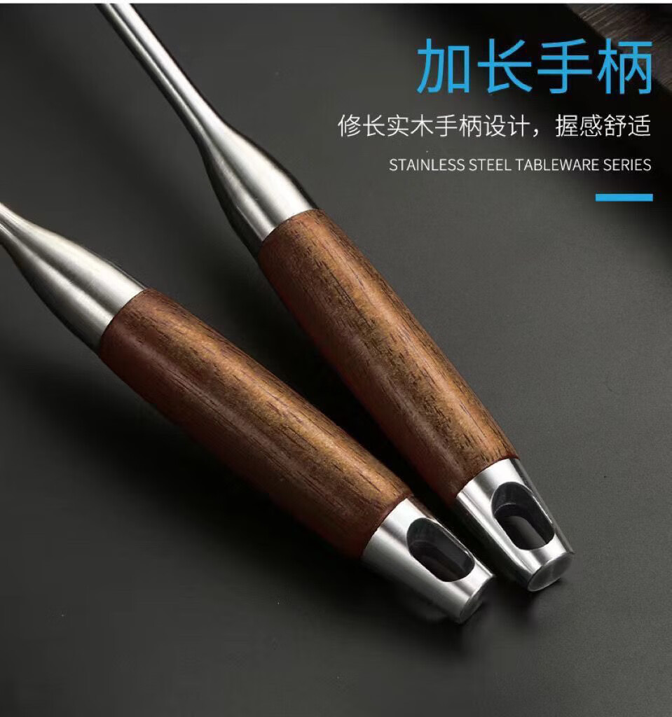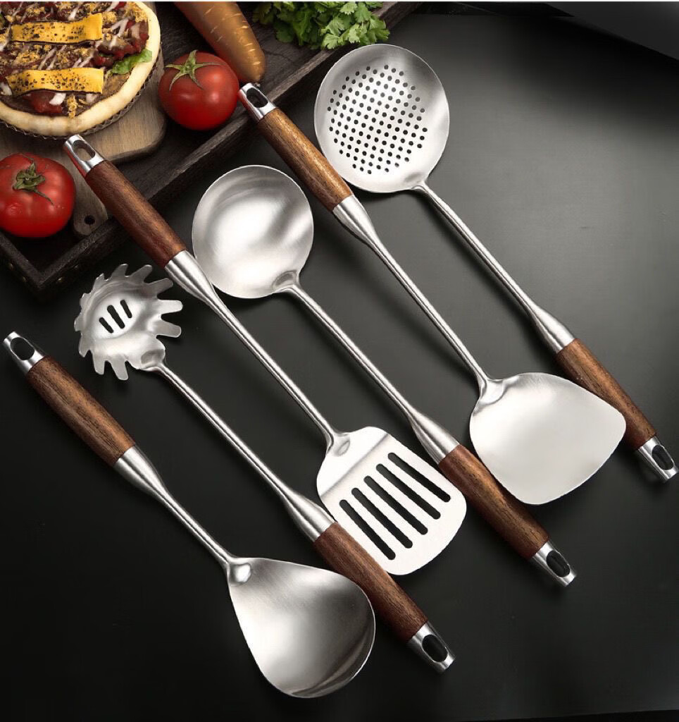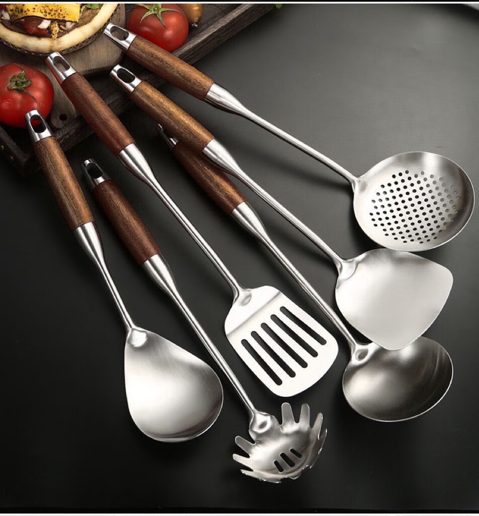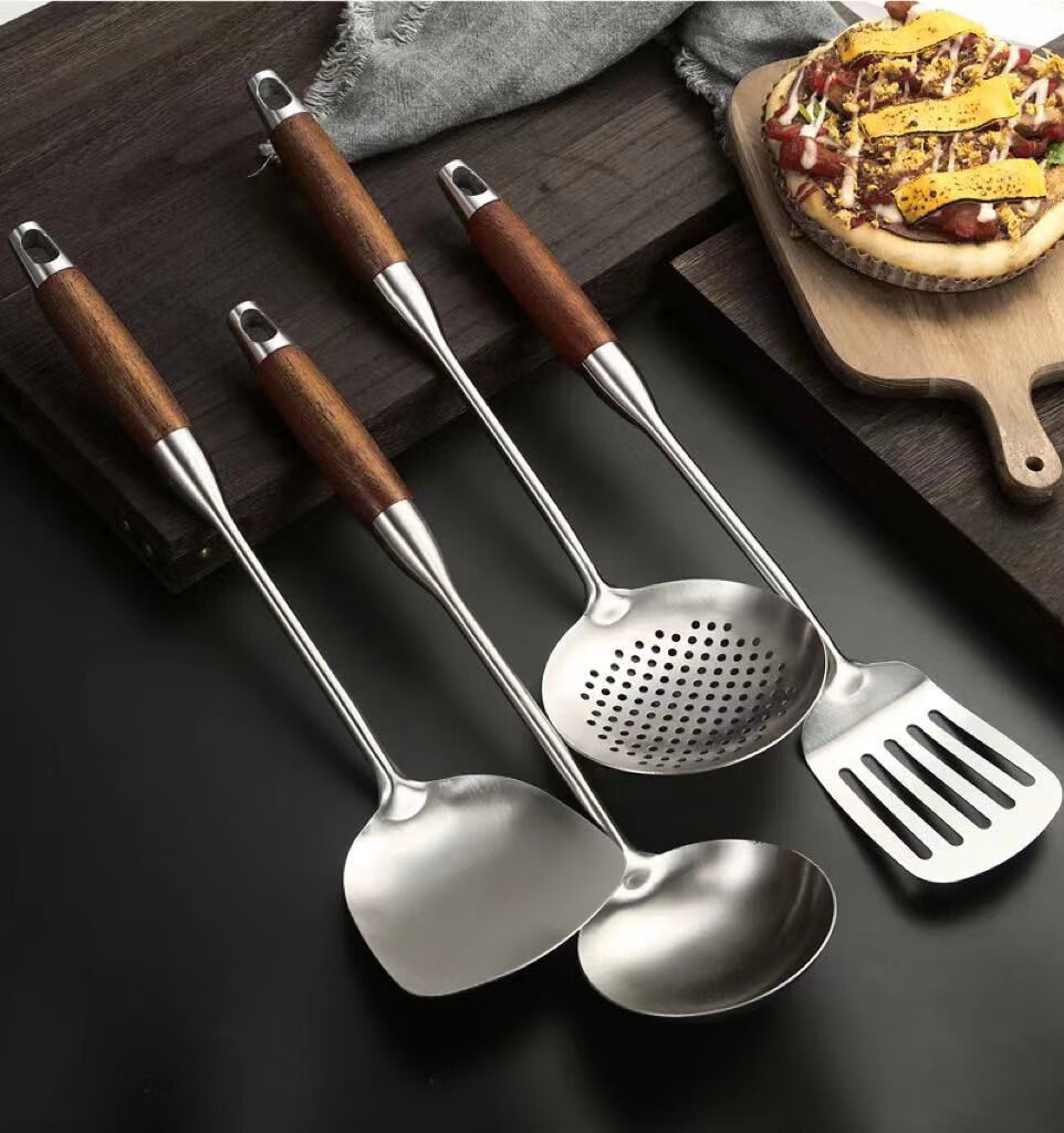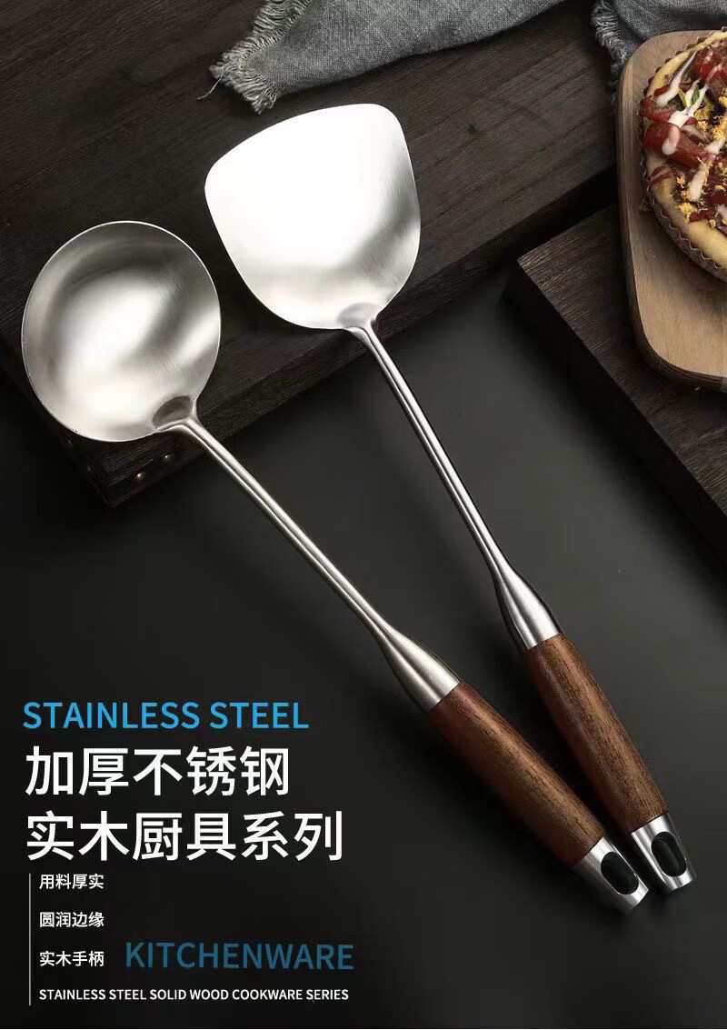 Fat Donglai thickened 316 stainless steel kitchen utensil set for home kitchen cooking spatula and ladle, German 316 material, wood grain plastic handle, spatula + soup spoon + frying spatula + colander, 4-piece set (
