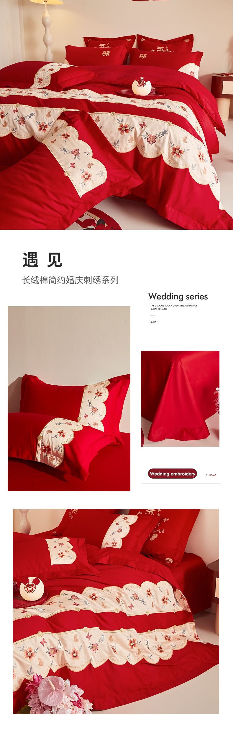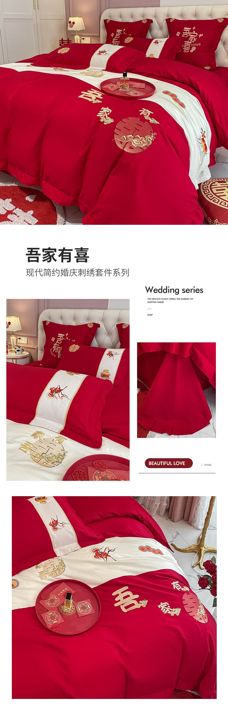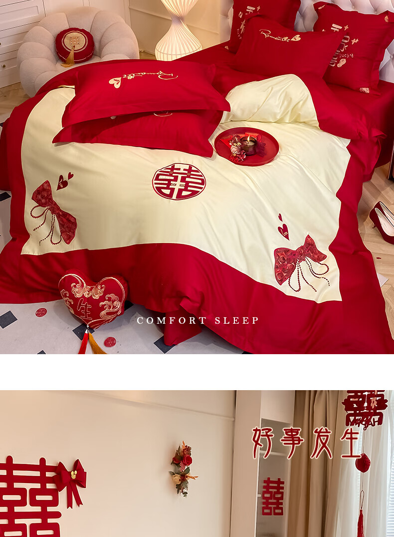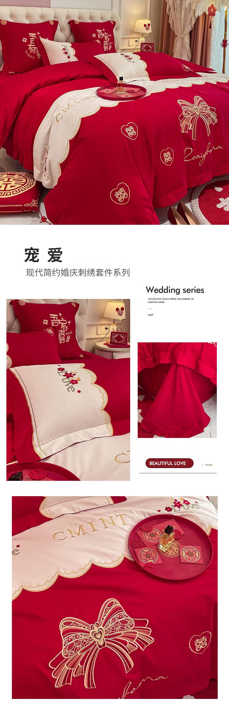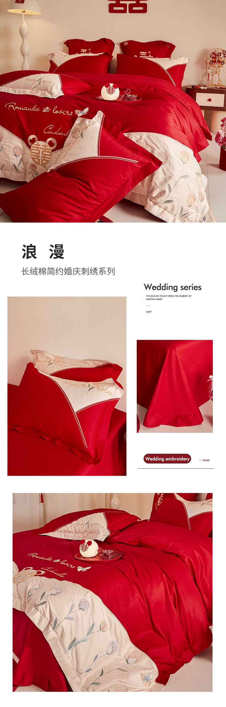 Mercury series home textiles red pure cotton wedding four-piece set long-staple cotton wedding cotton embroidered bed sheet quilt cover newlywed bedding Alice 2.0 bed sheet style four-piece set