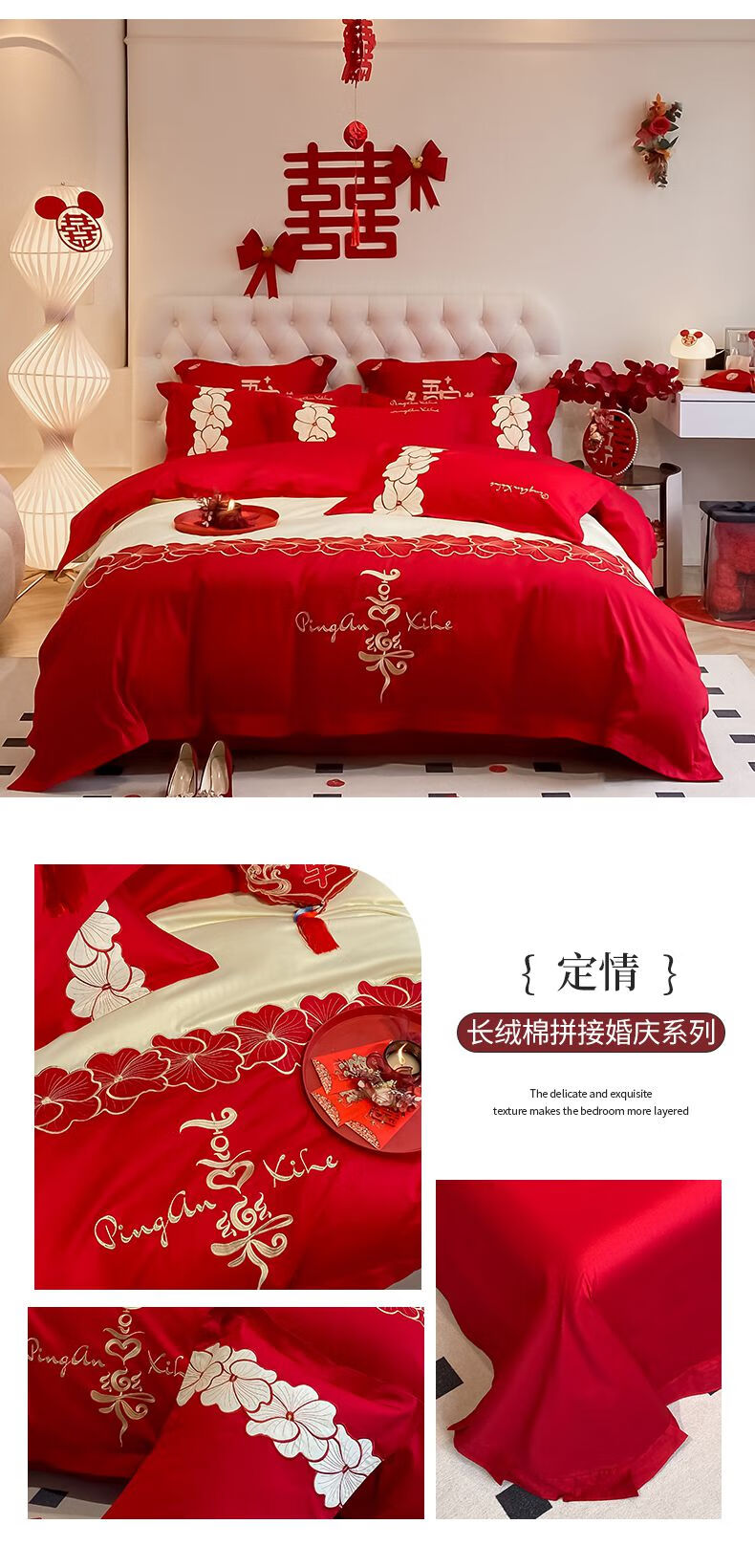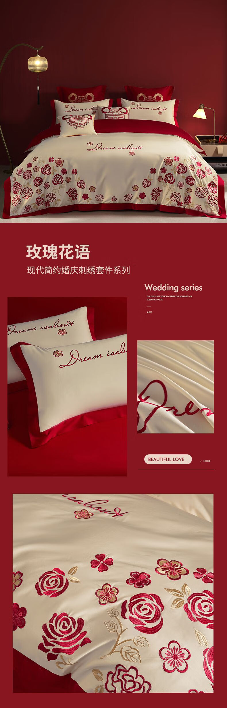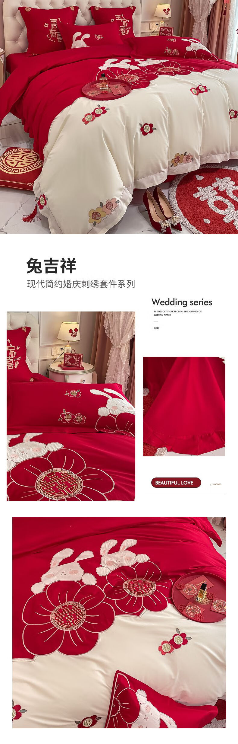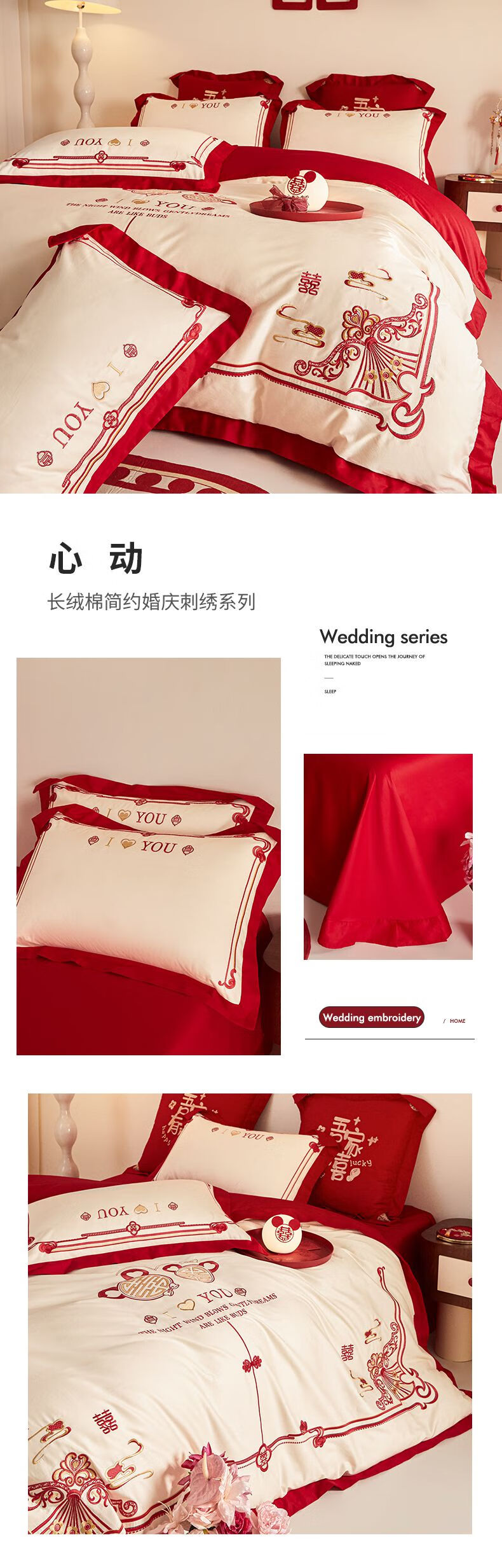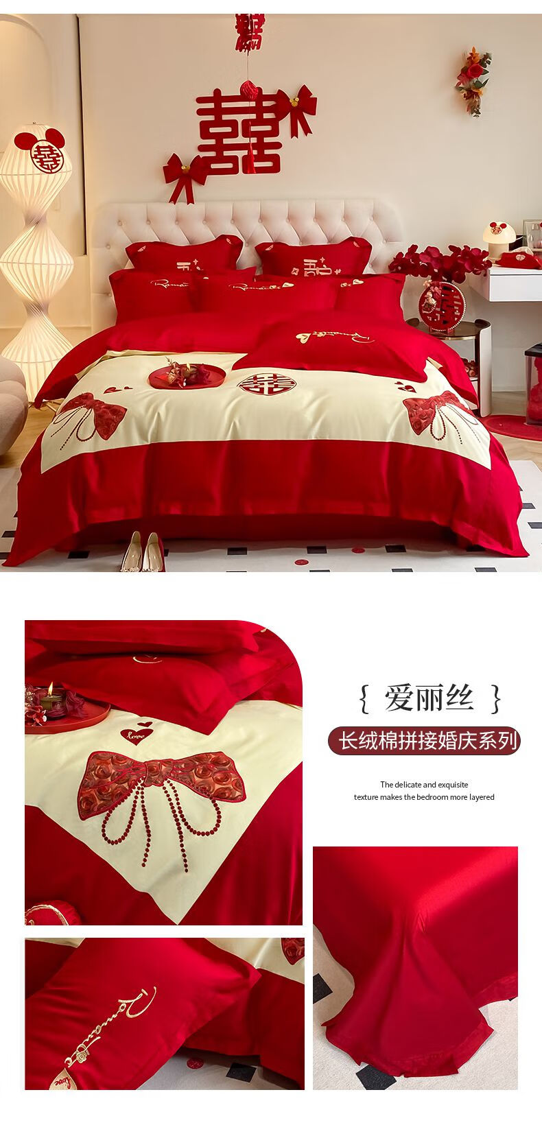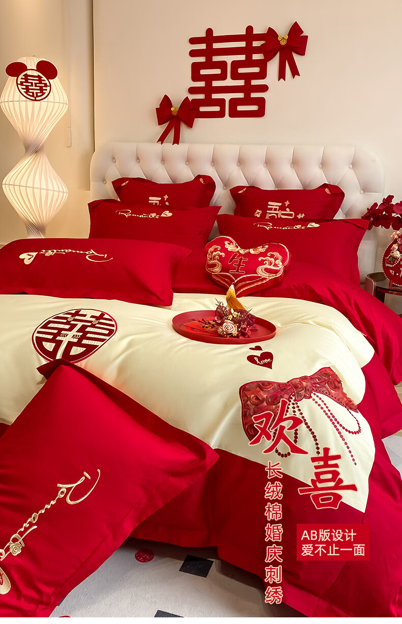 Mercury series home textiles red pure cotton wedding four-piece set long-staple cotton wedding cotton embroidered bed sheet quilt cover newlywed bedding Alice 2.0 bed sheet style four-piece set