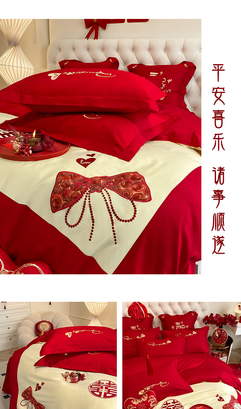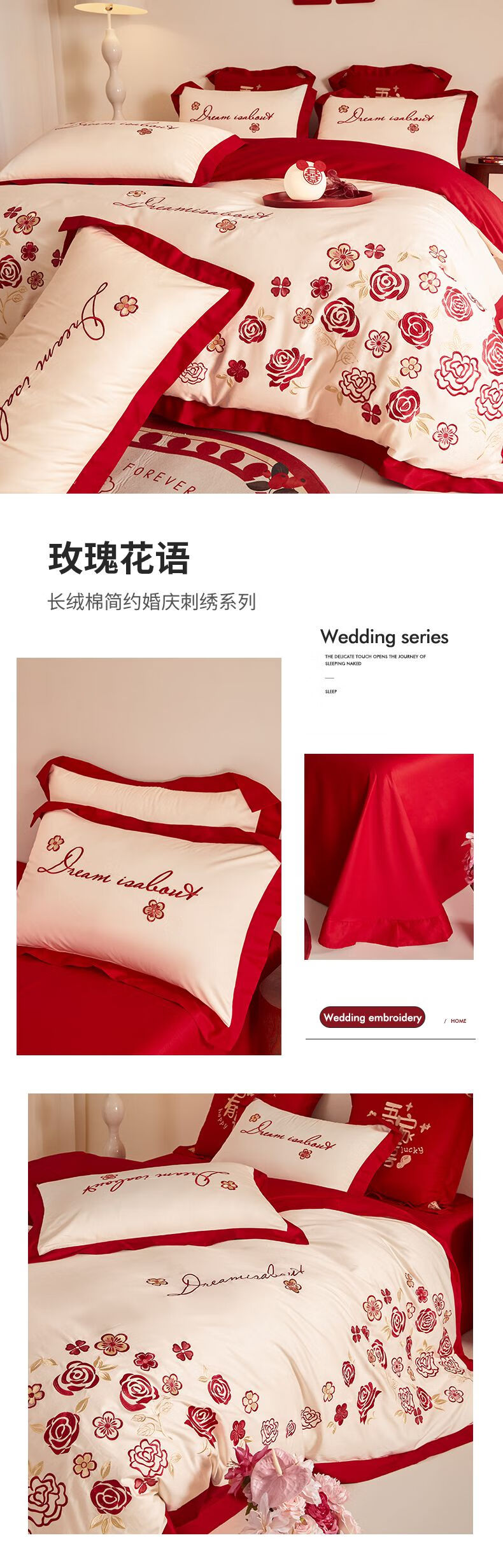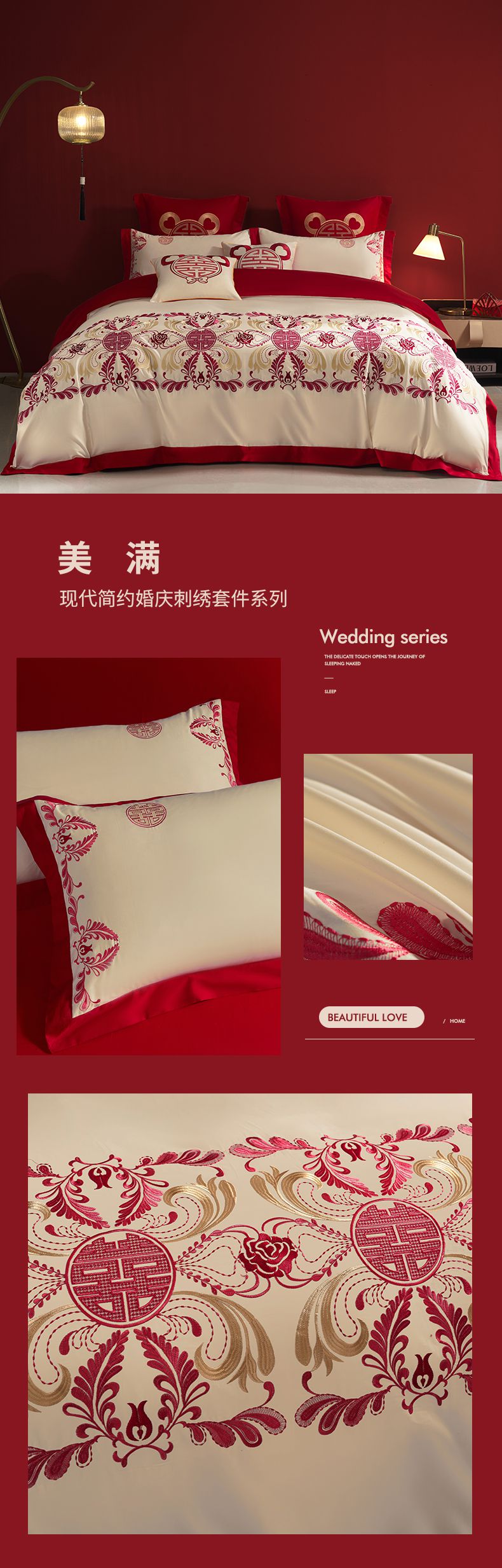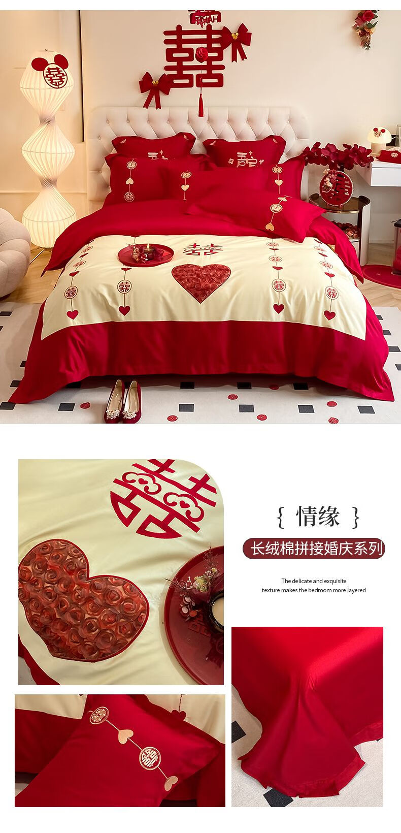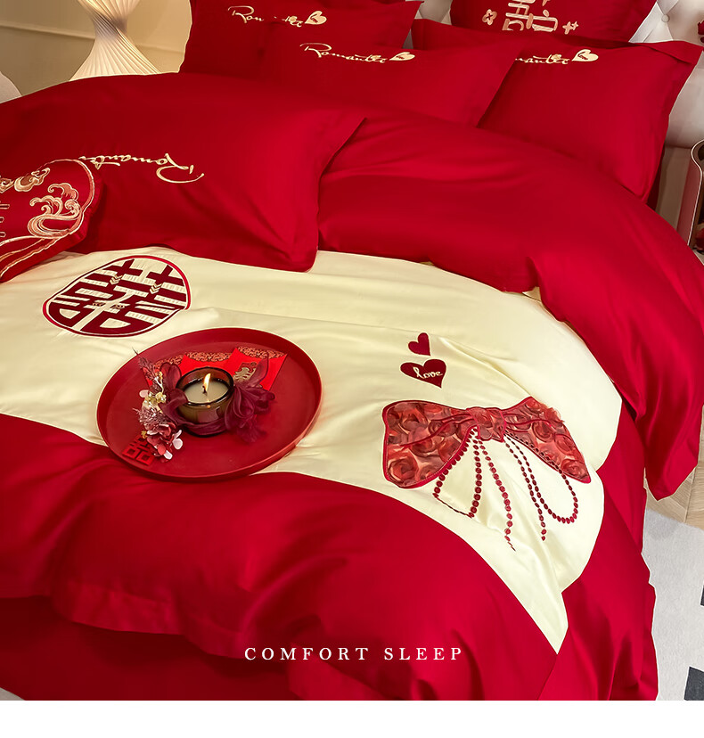 Mercury series home textiles red pure cotton wedding four-piece set long-staple cotton wedding cotton embroidered bed sheet quilt cover newlywed bedding Alice 2.0 bed sheet style four-piece set
