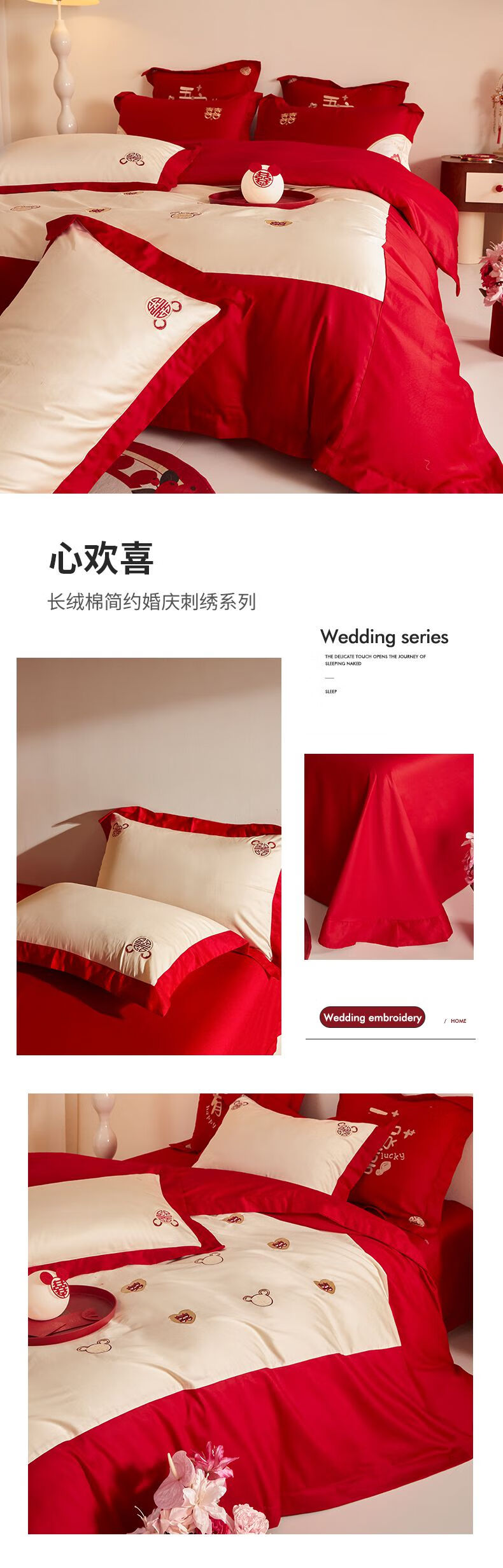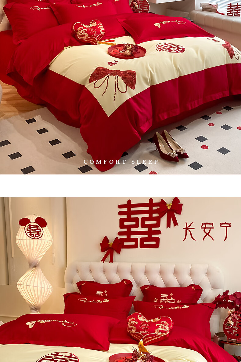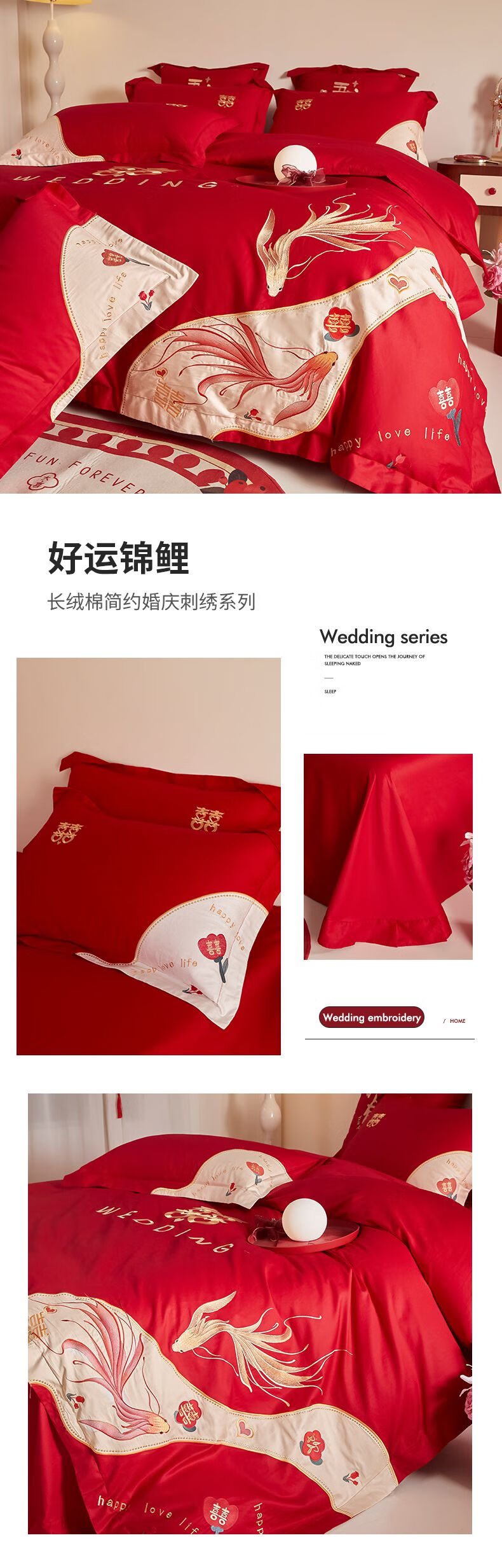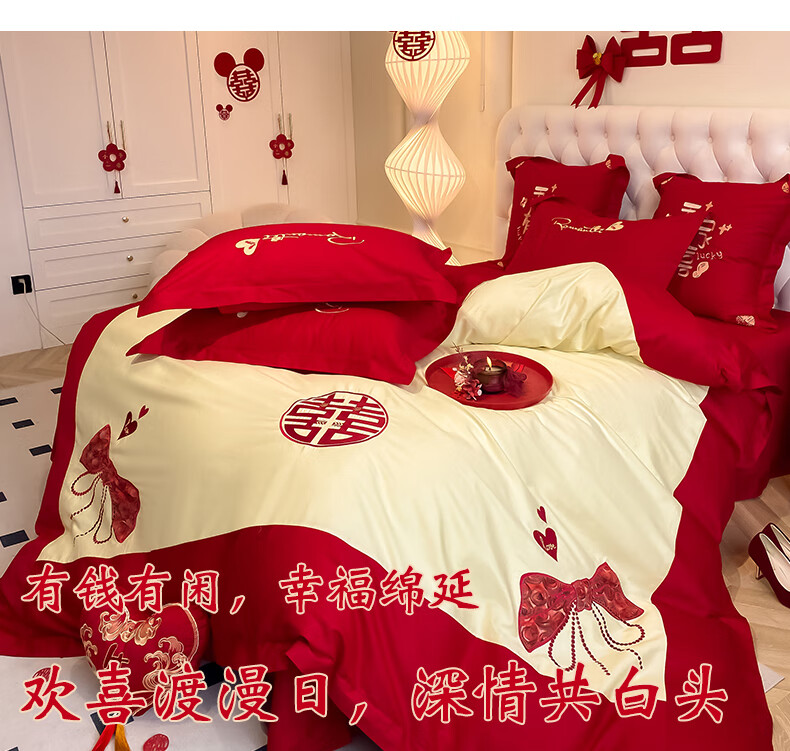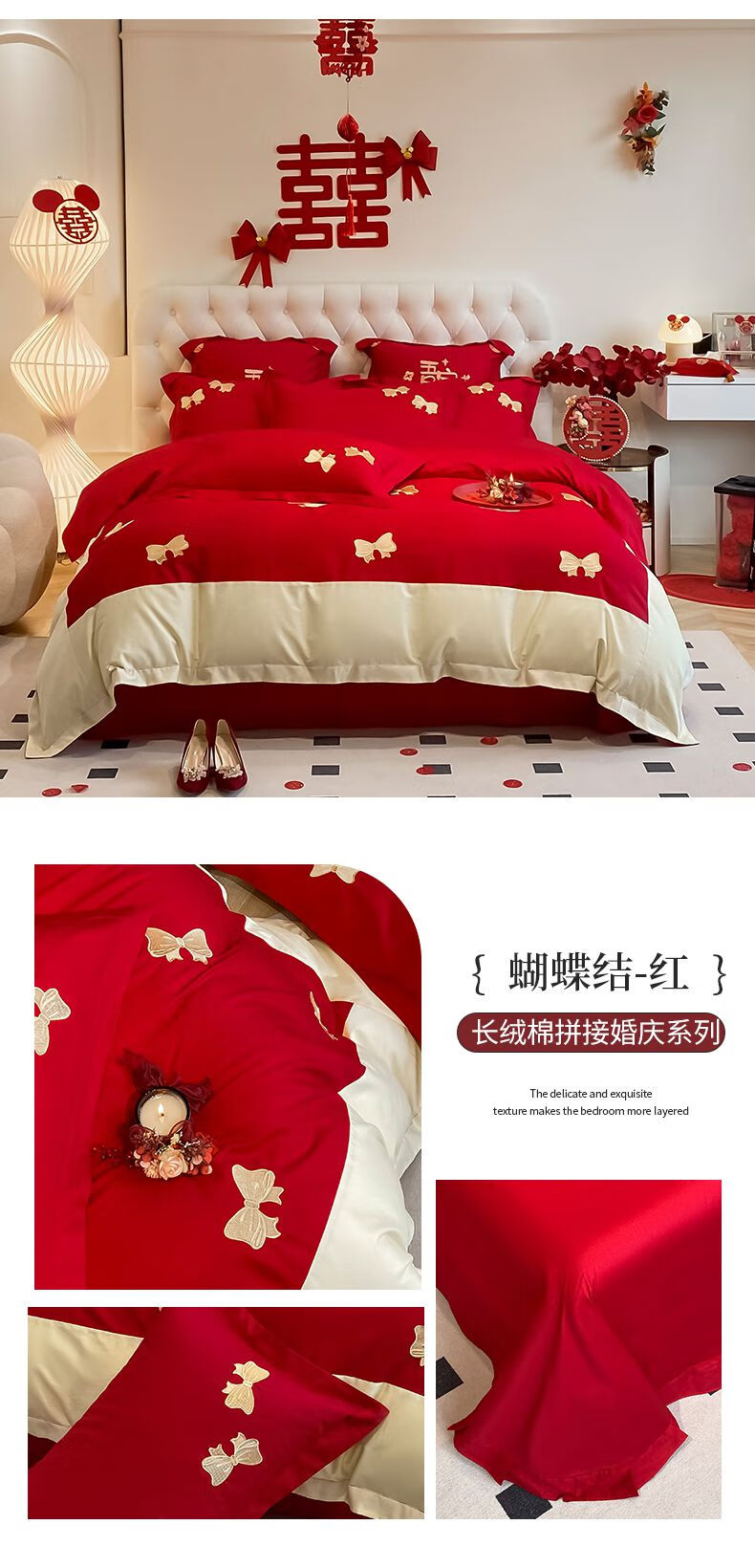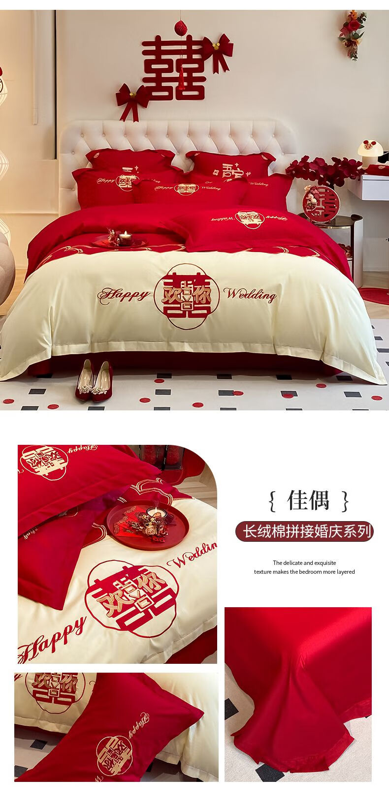 Mercury series home textiles red pure cotton wedding four-piece set long-staple cotton wedding cotton embroidered bed sheet quilt cover newlywed bedding Alice 2.0 bed sheet style four-piece set