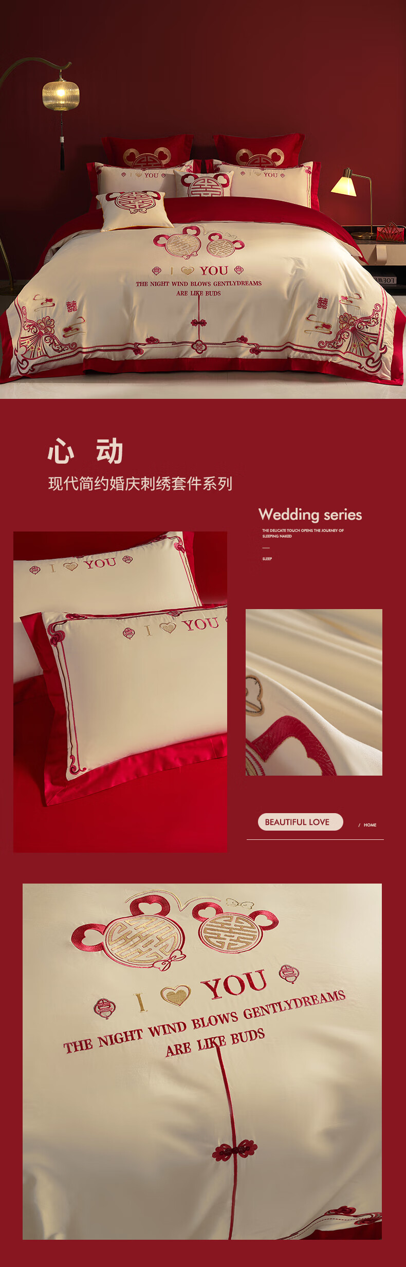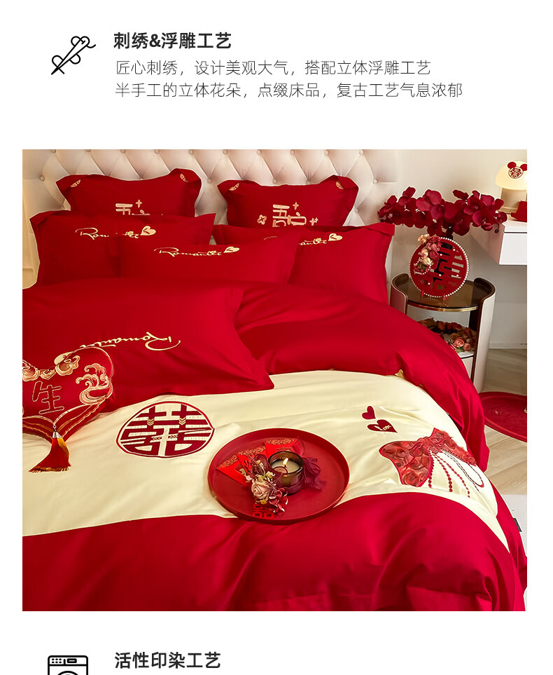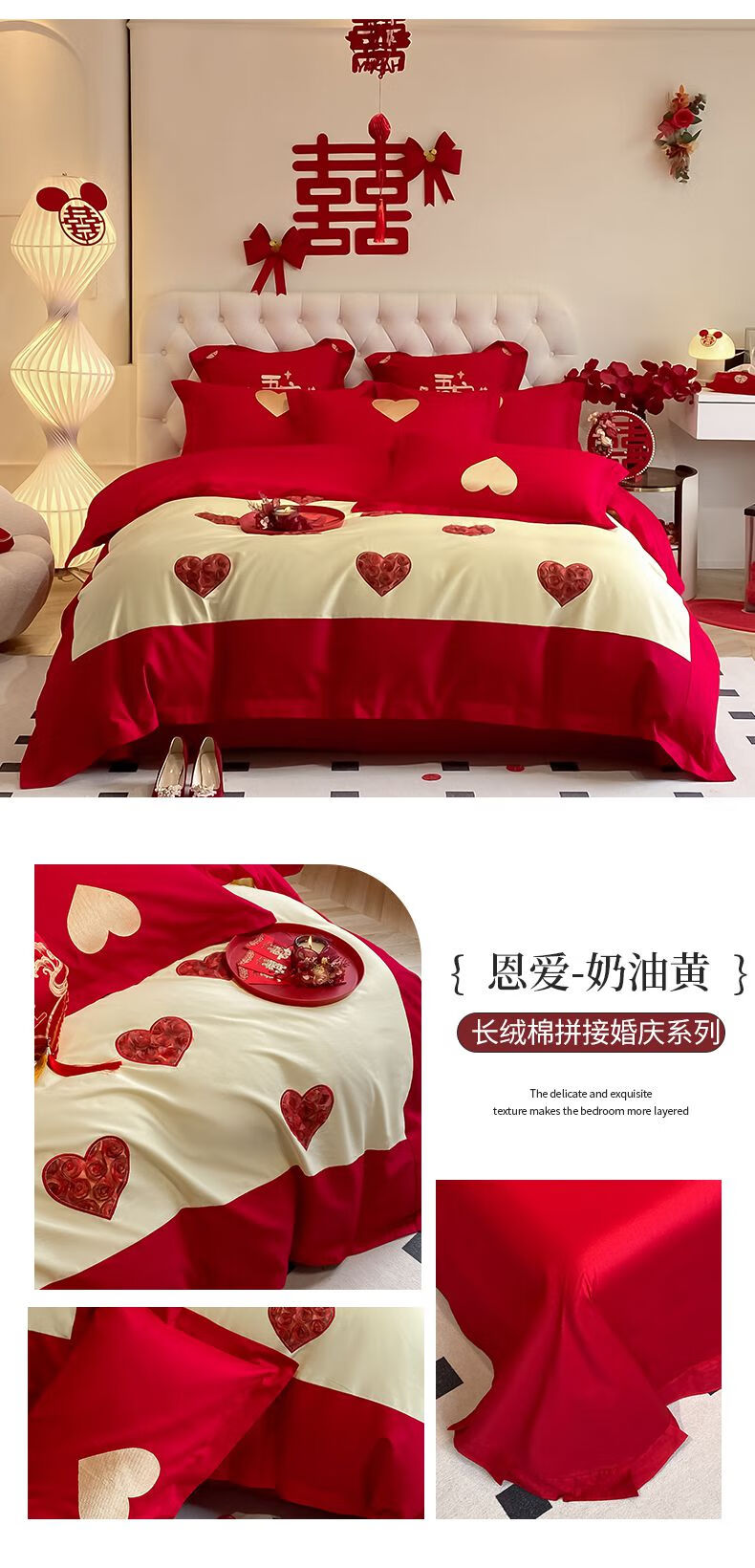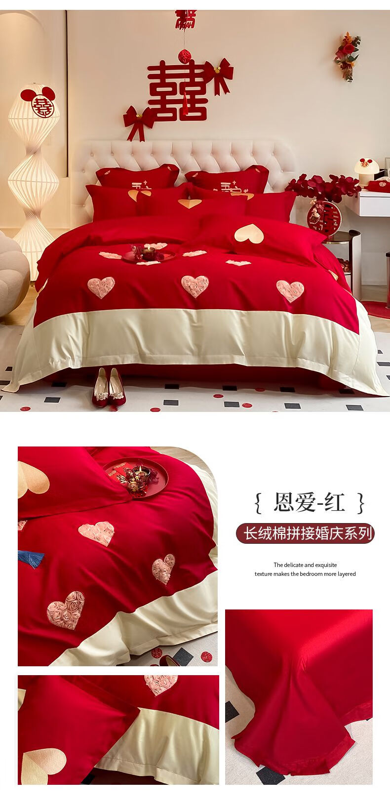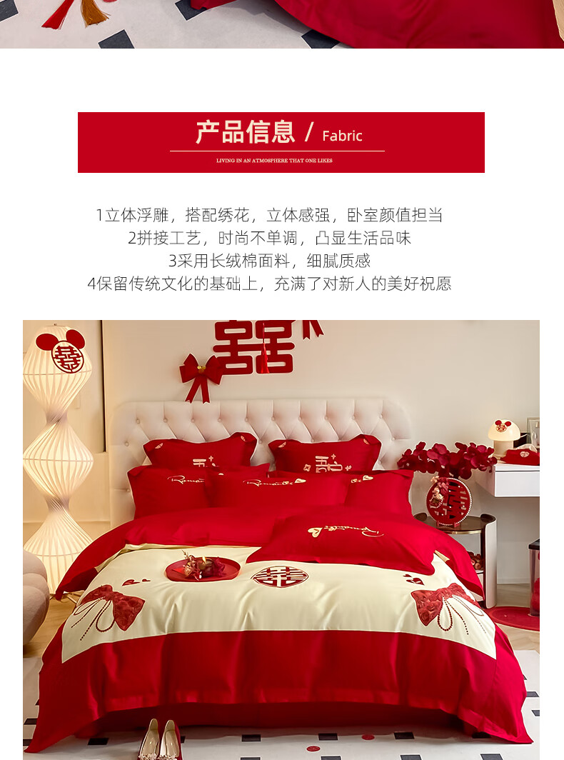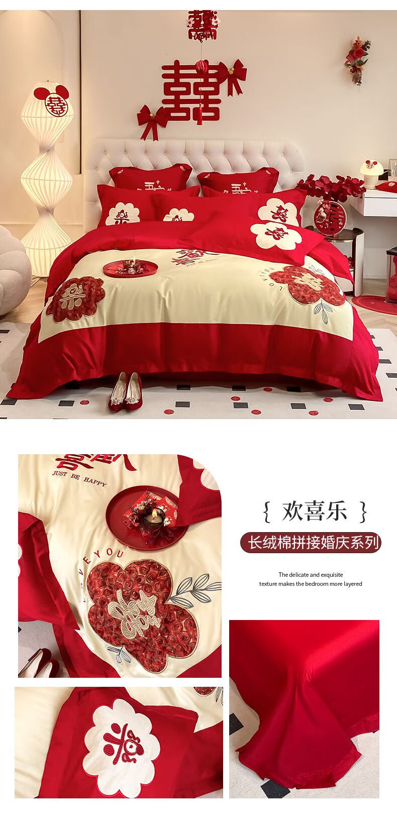 Mercury series home textiles red pure cotton wedding four-piece set long-staple cotton wedding cotton embroidered bed sheet quilt cover newlywed bedding Alice 2.0 bed sheet style four-piece set