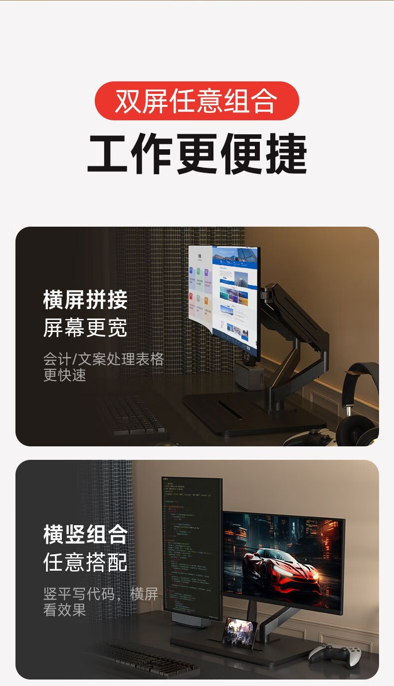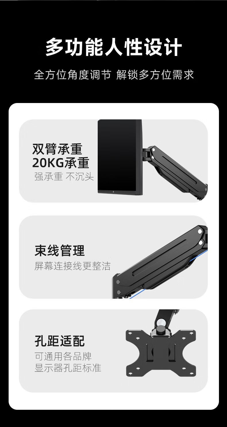 Zhiercheng desktop punch-free dual-screen computer pneumatic cantilever base monitor bracket free lifting and rotating with mobile phone slot dual-screen pneumatic arm bracket suitable for 17-32 inches, both arms load 20