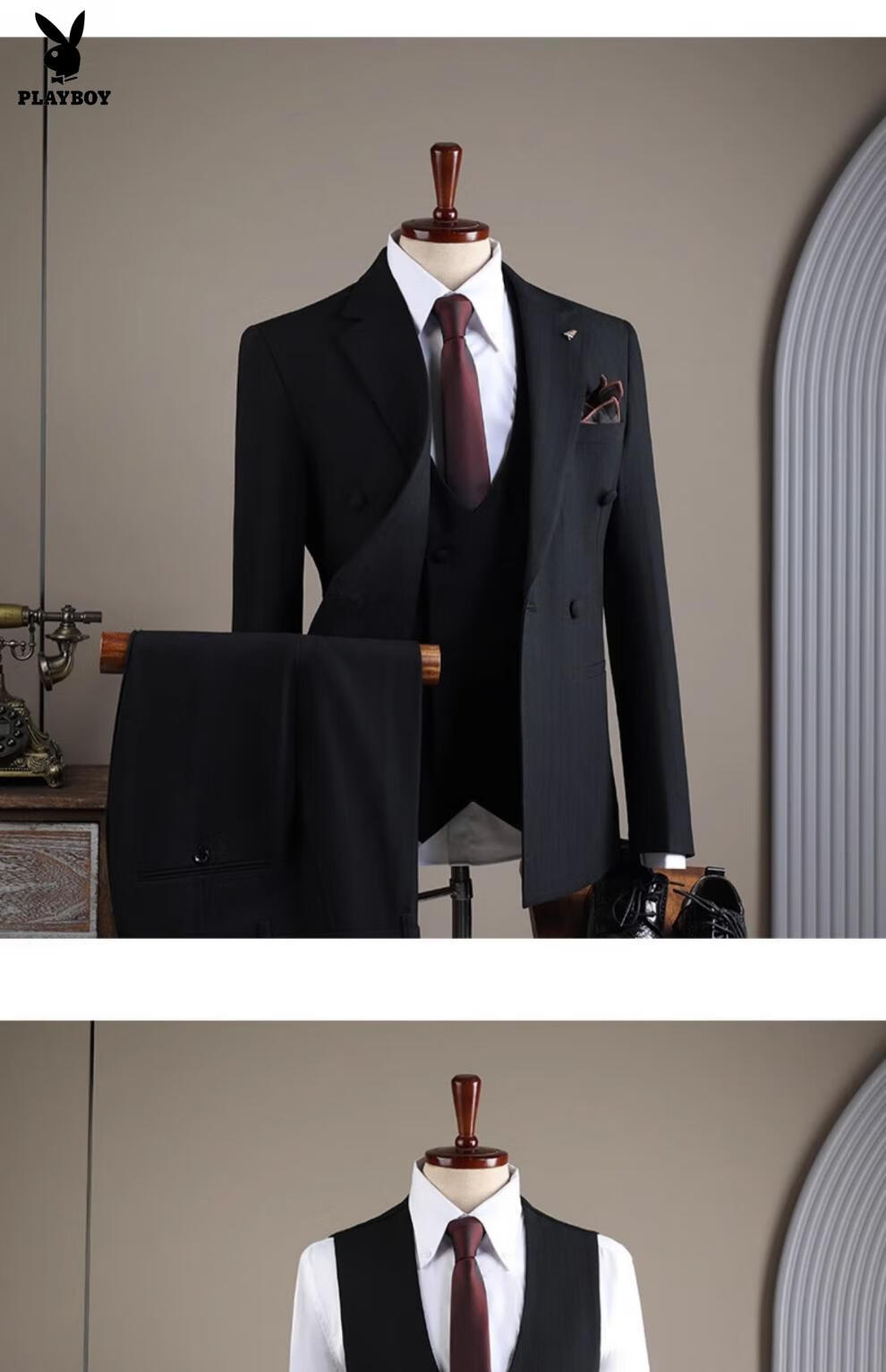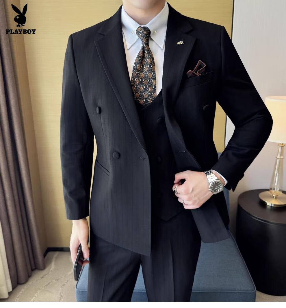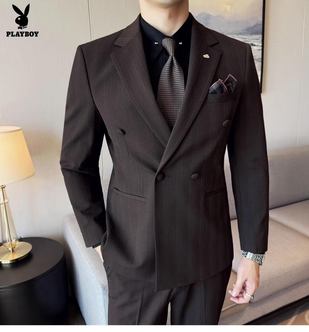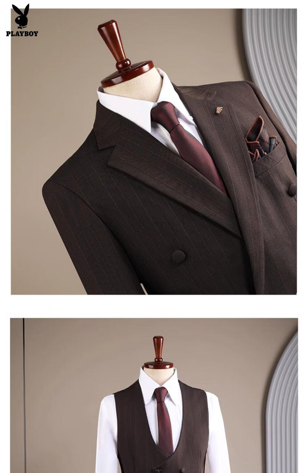 Playboy 2025 Winter Suit Men's Retro Striped High-Quality Double-breasted Suit Three-piece Formal Wedding Dress Retro Three-piece Suit XL 52