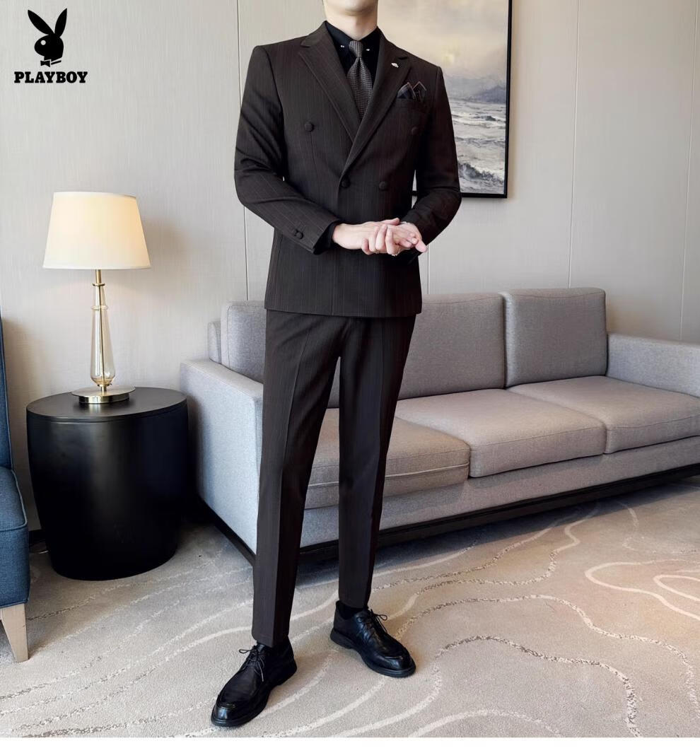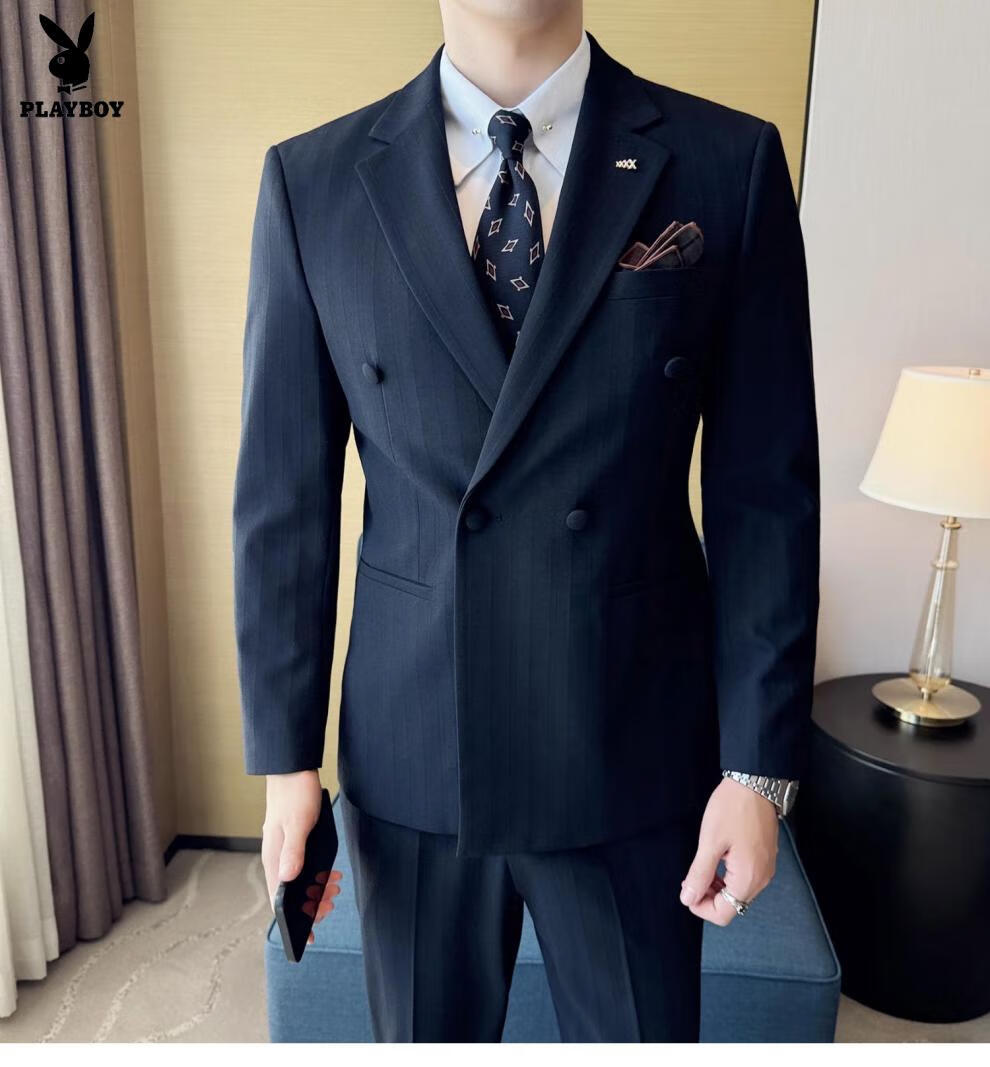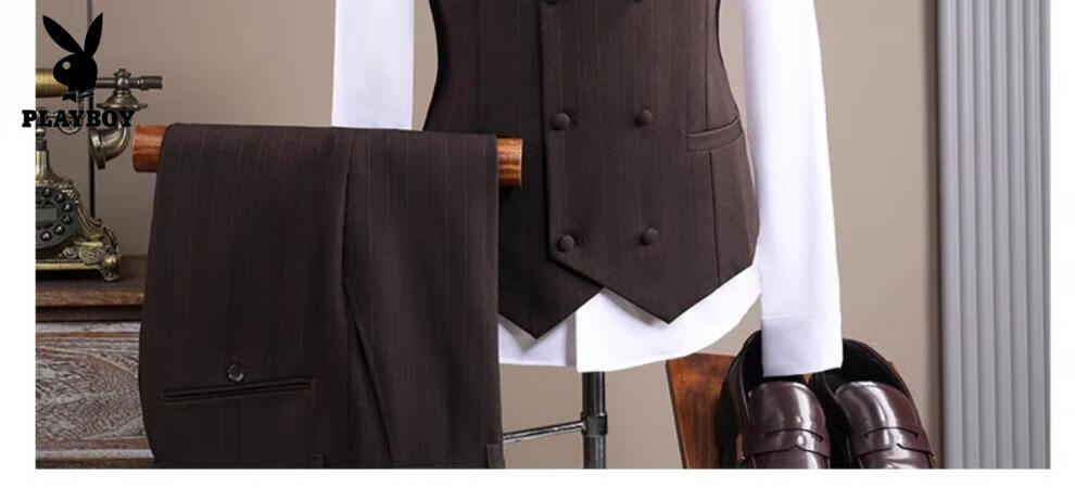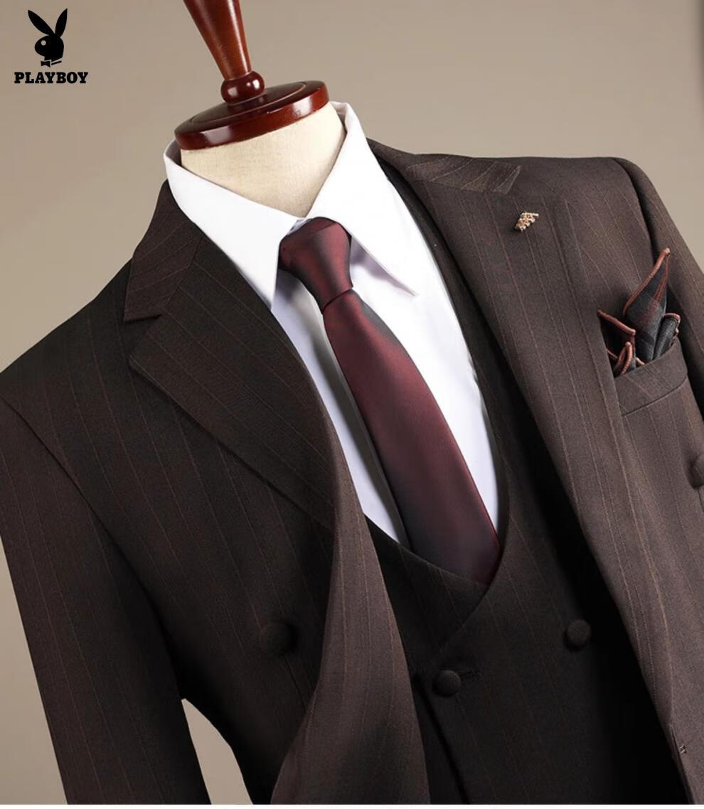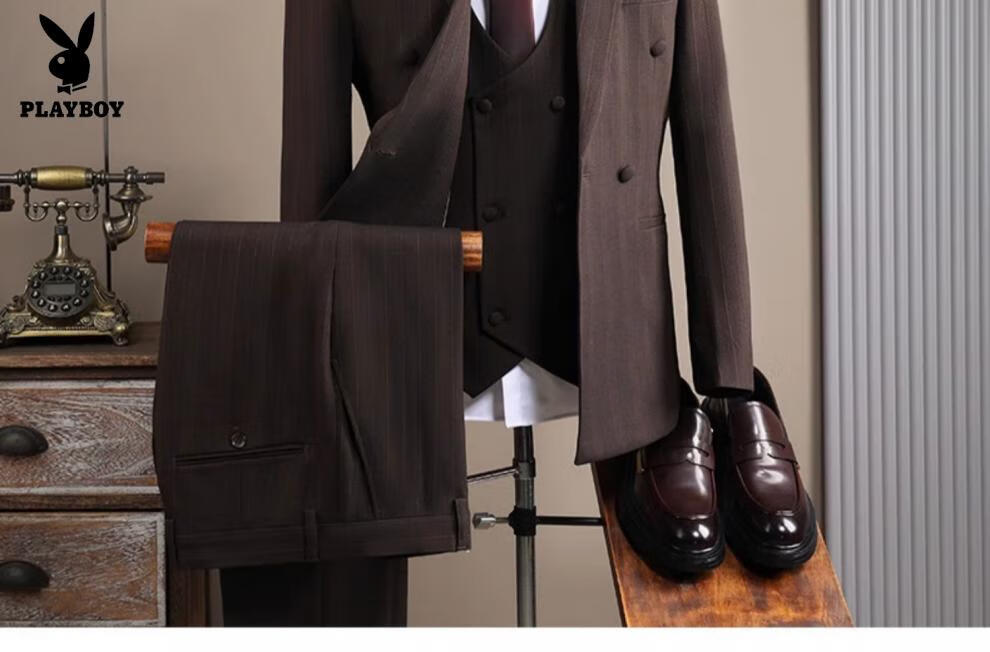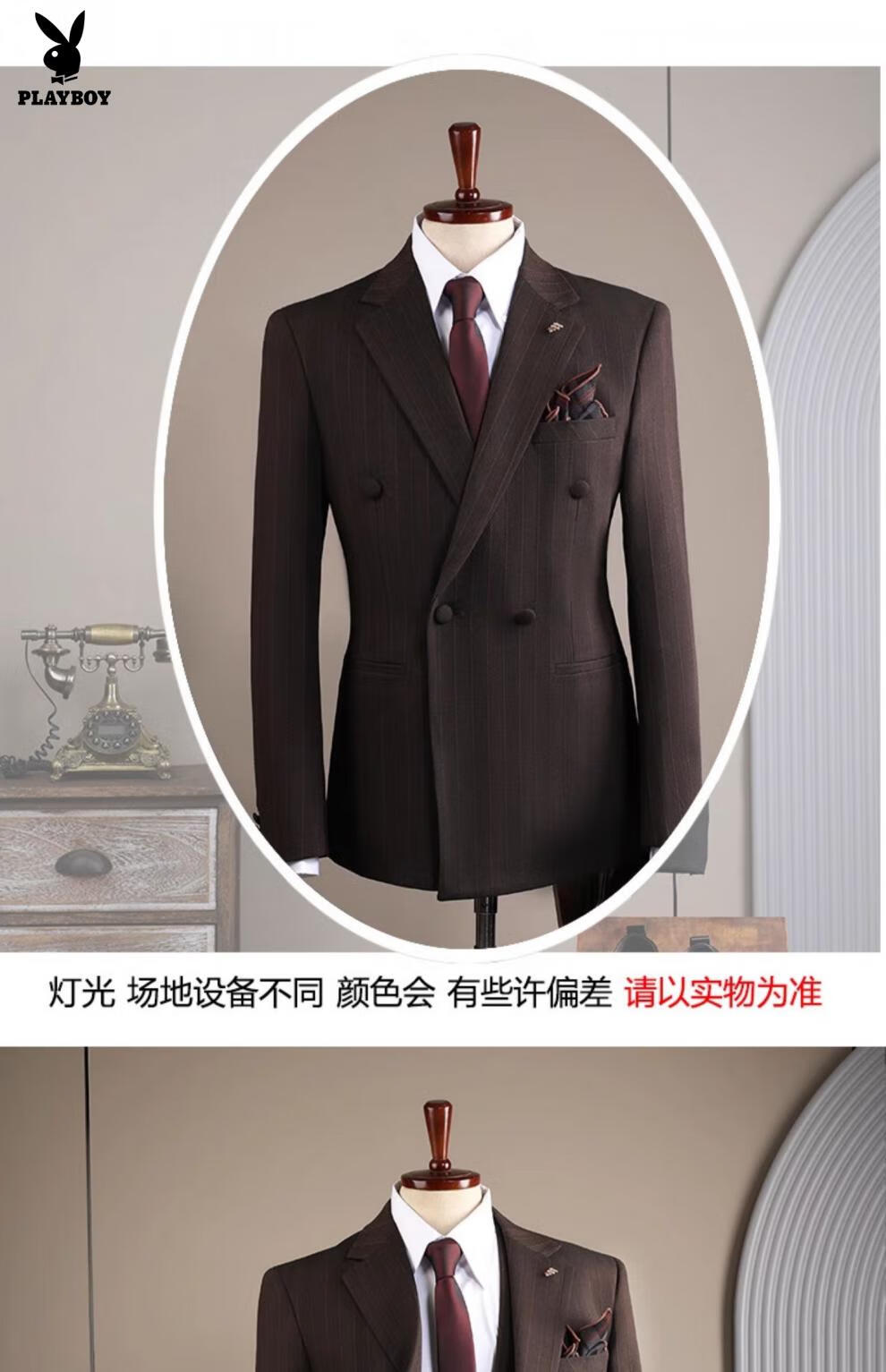 Playboy 2025 Winter Suit Men's Retro Striped High-Quality Double-breasted Suit Three-piece Formal Wedding Dress Retro Three-piece Suit XL 52