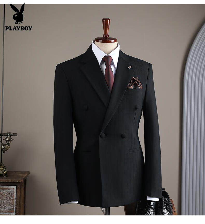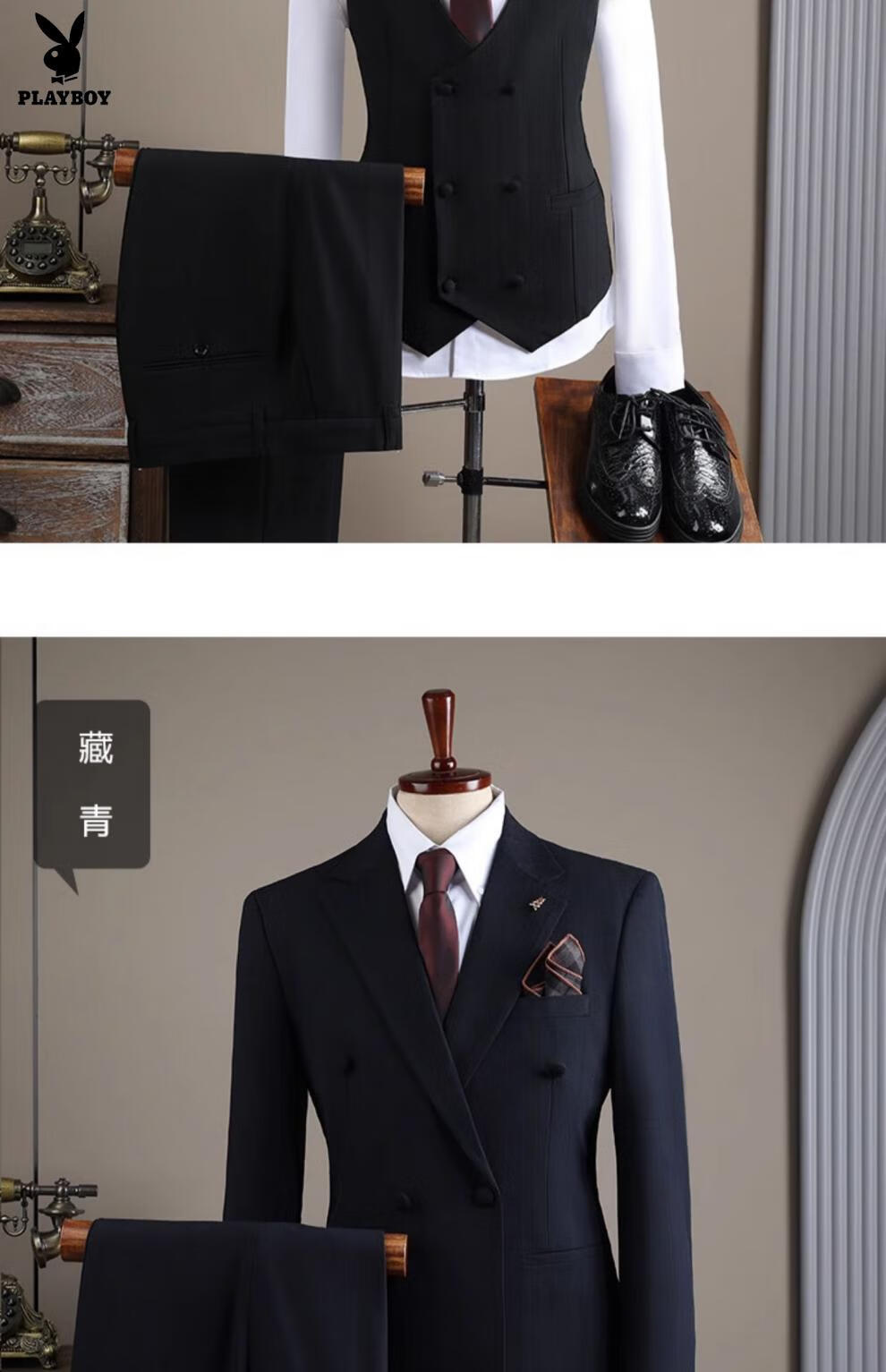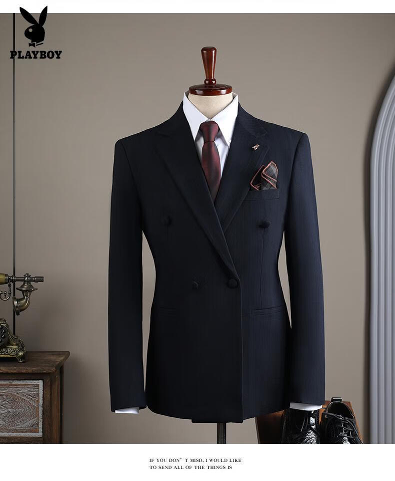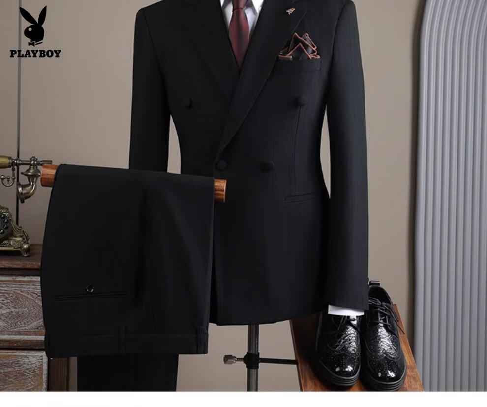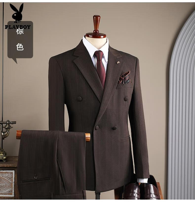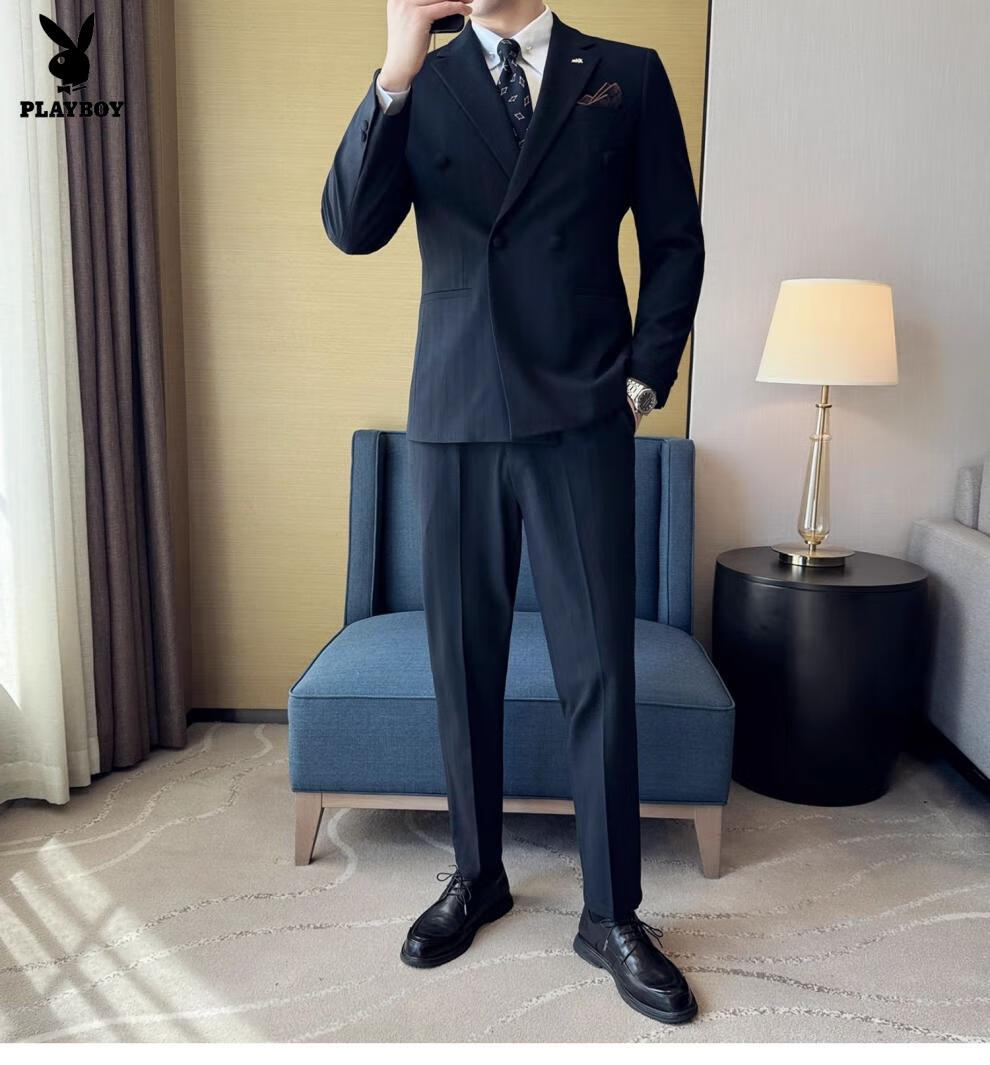 Playboy 2025 Winter Suit Men's Retro Striped High-Quality Double-breasted Suit Three-piece Formal Wedding Dress Retro Three-piece Suit XL 52