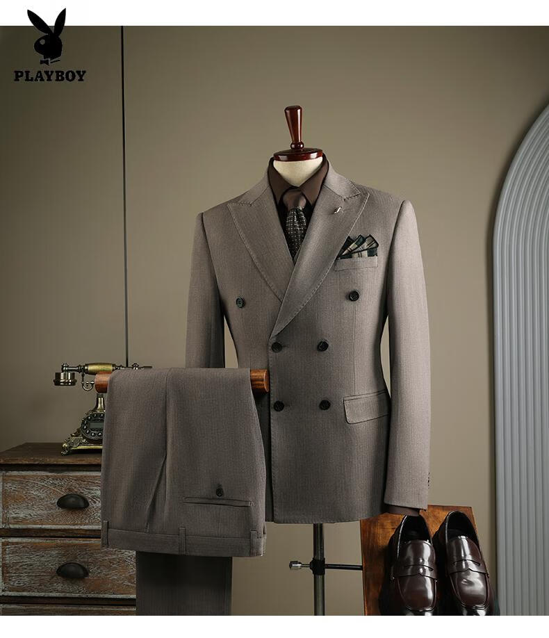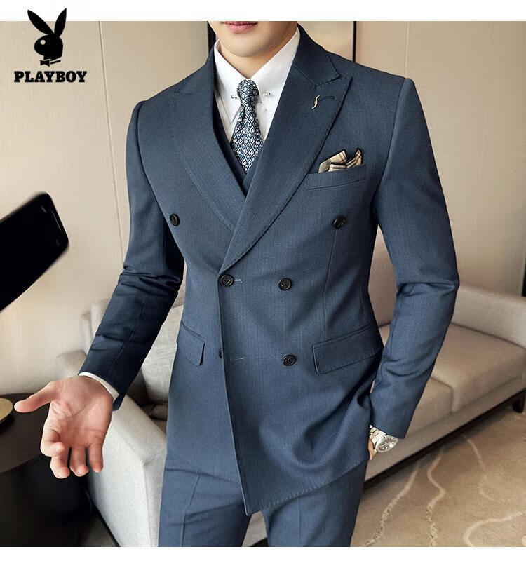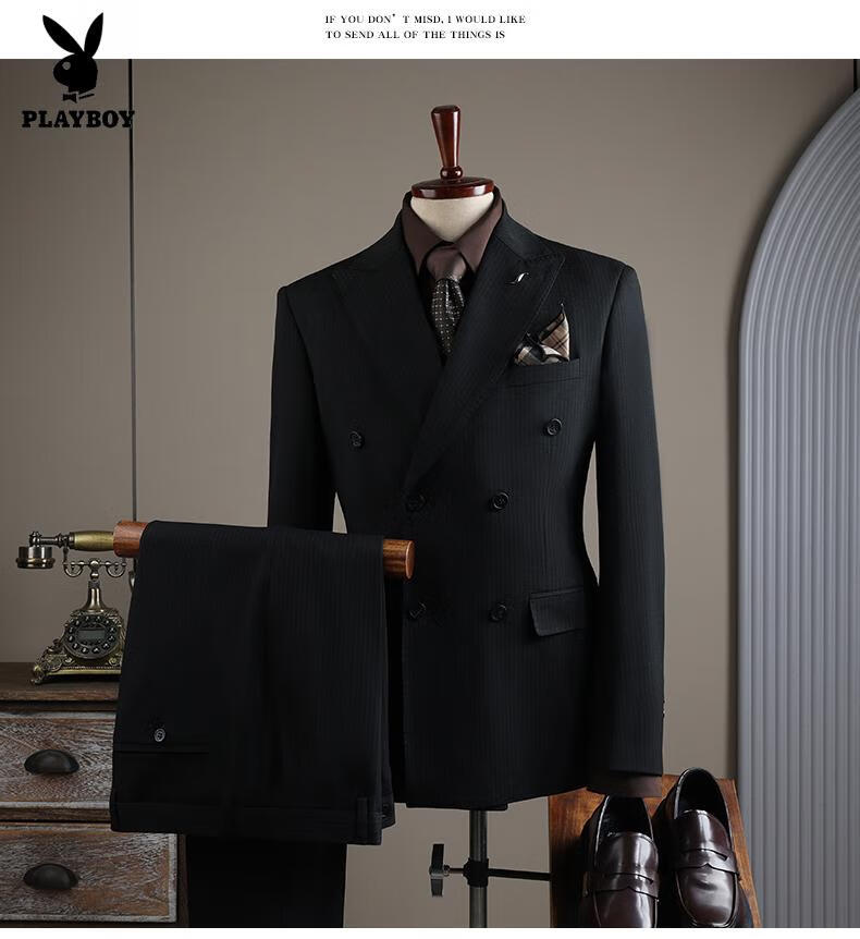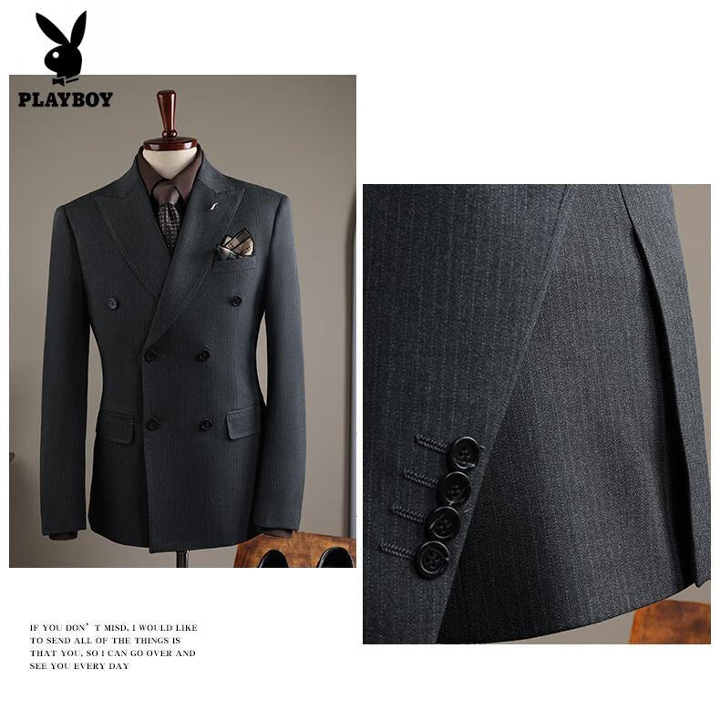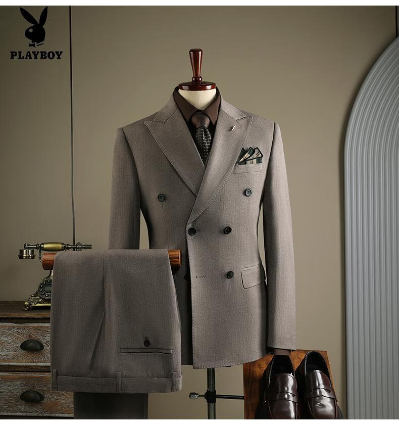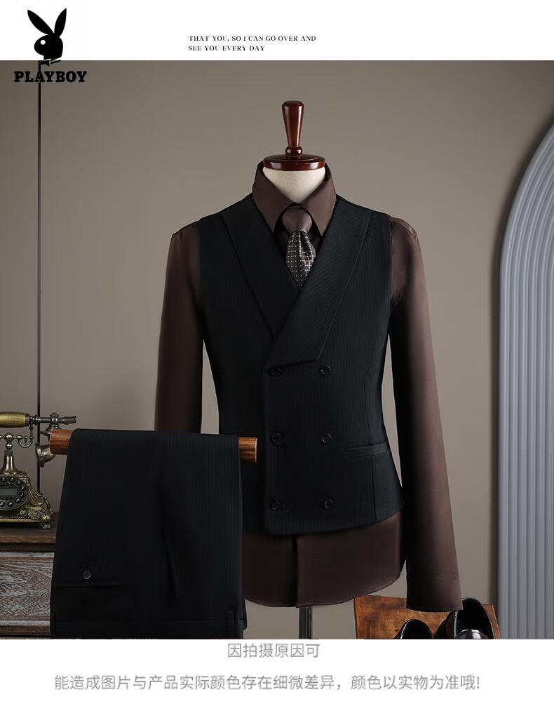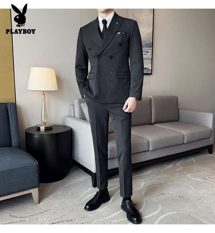 Playboy winter suit men's high-end business formal double-breasted striped suit three-piece groom's wedding dress one button-warm brown three-piece suit 7XL 64