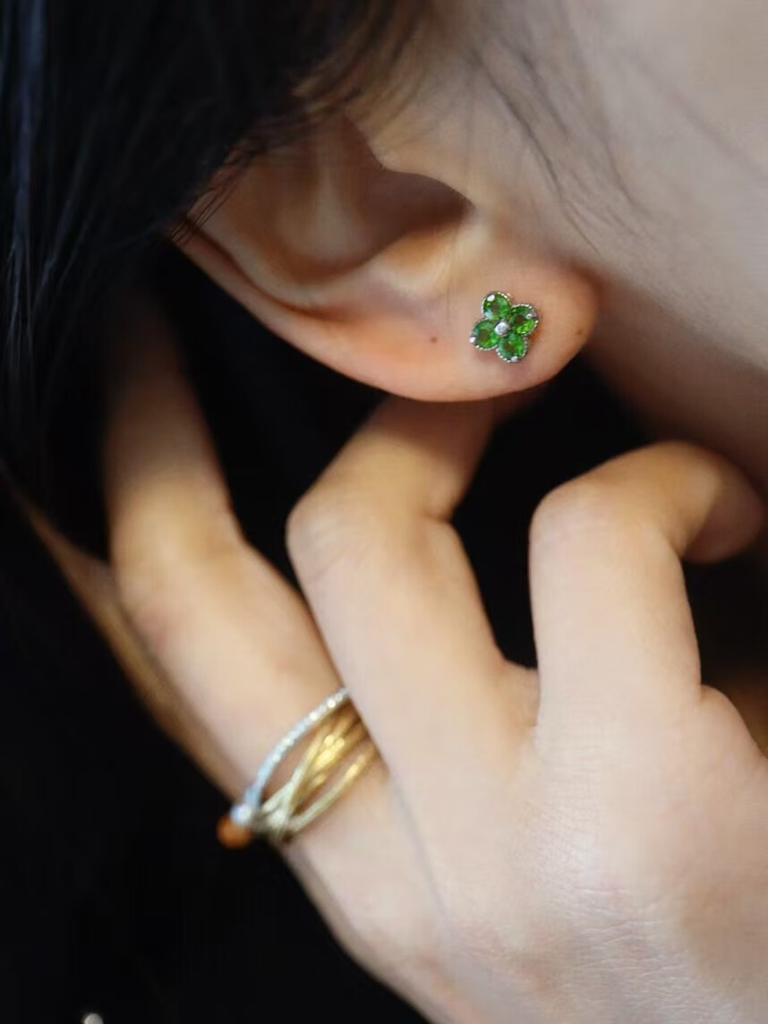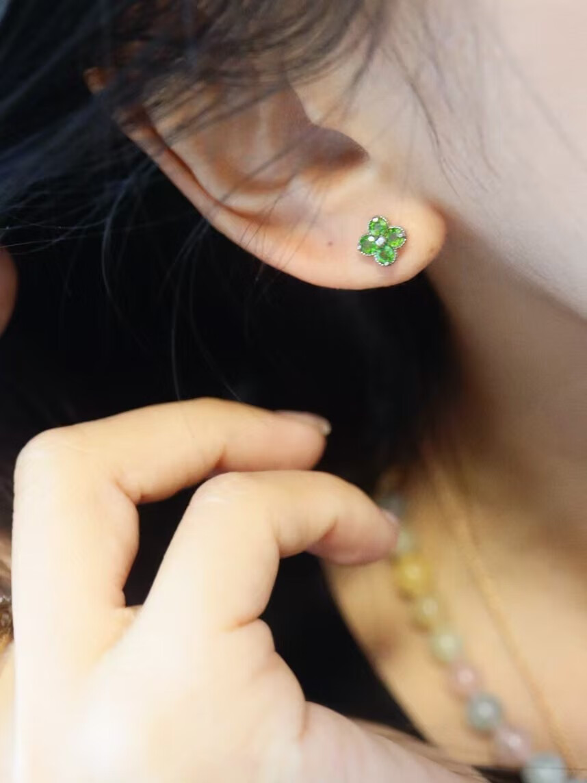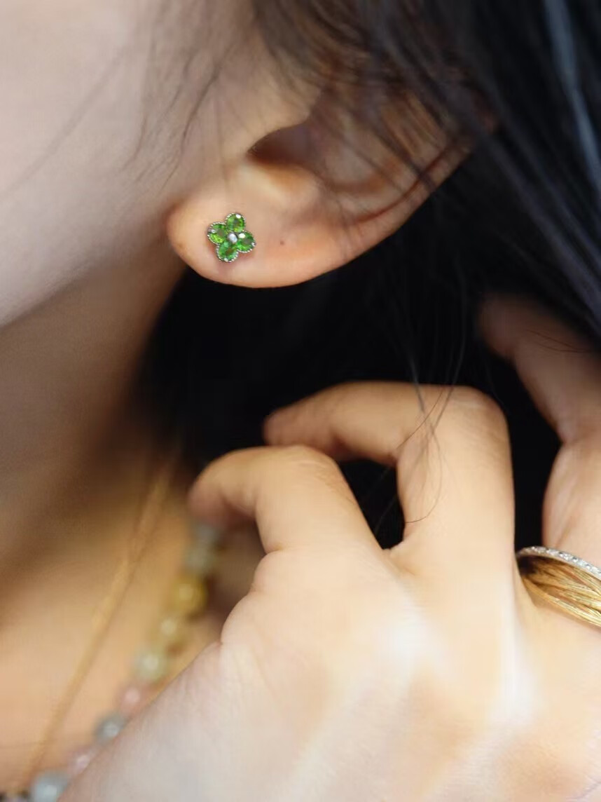 Jinwei women's summer cool style 925 sterling silver natural diopside earrings, fresh and elegant four-leaf clover shape