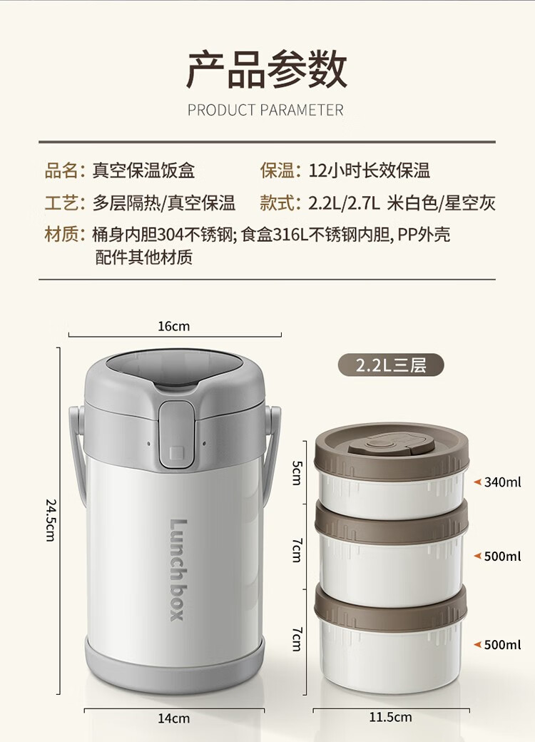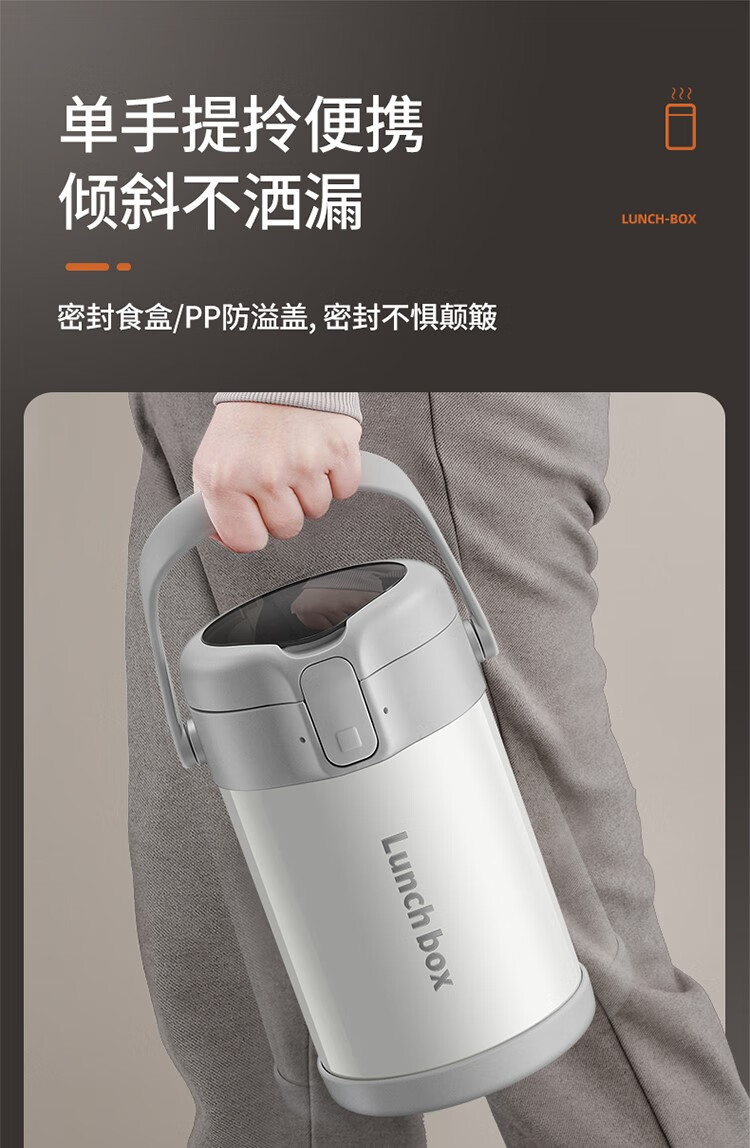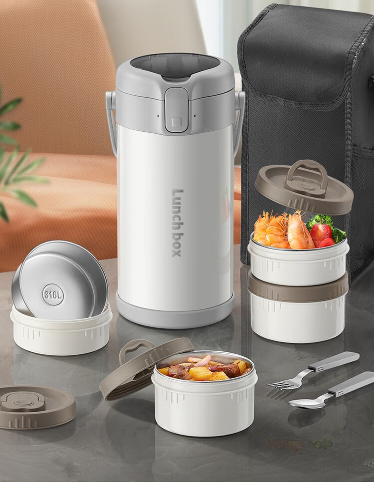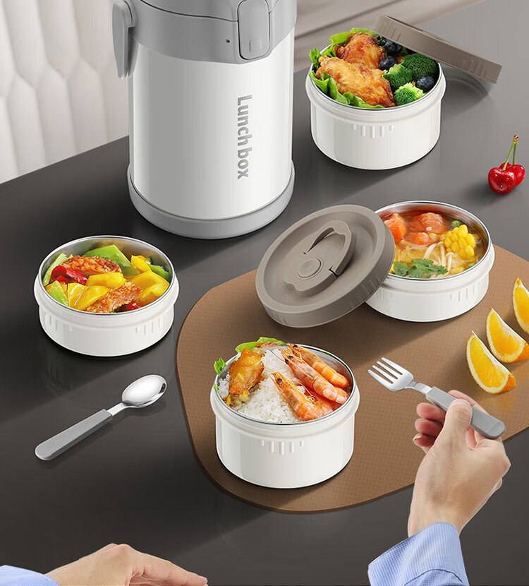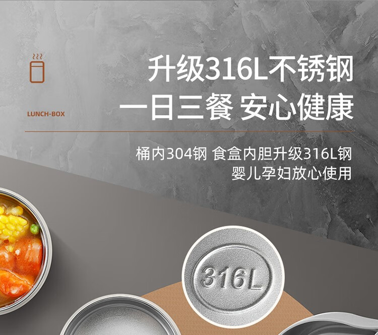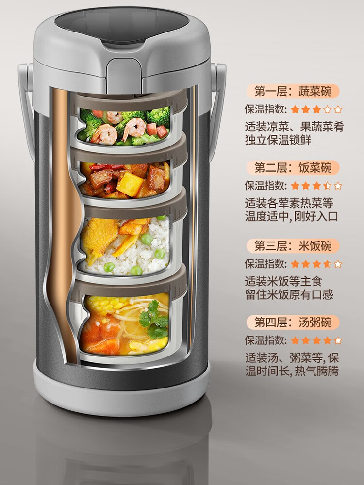 THERMOS insulated lunch box bucket for office workers and students, large-capacity stainless steel 24-hour ultra-long portable multi-layered lunch box, gun ash 2.2L-3 layers-insulated double layer anti-scalding 316