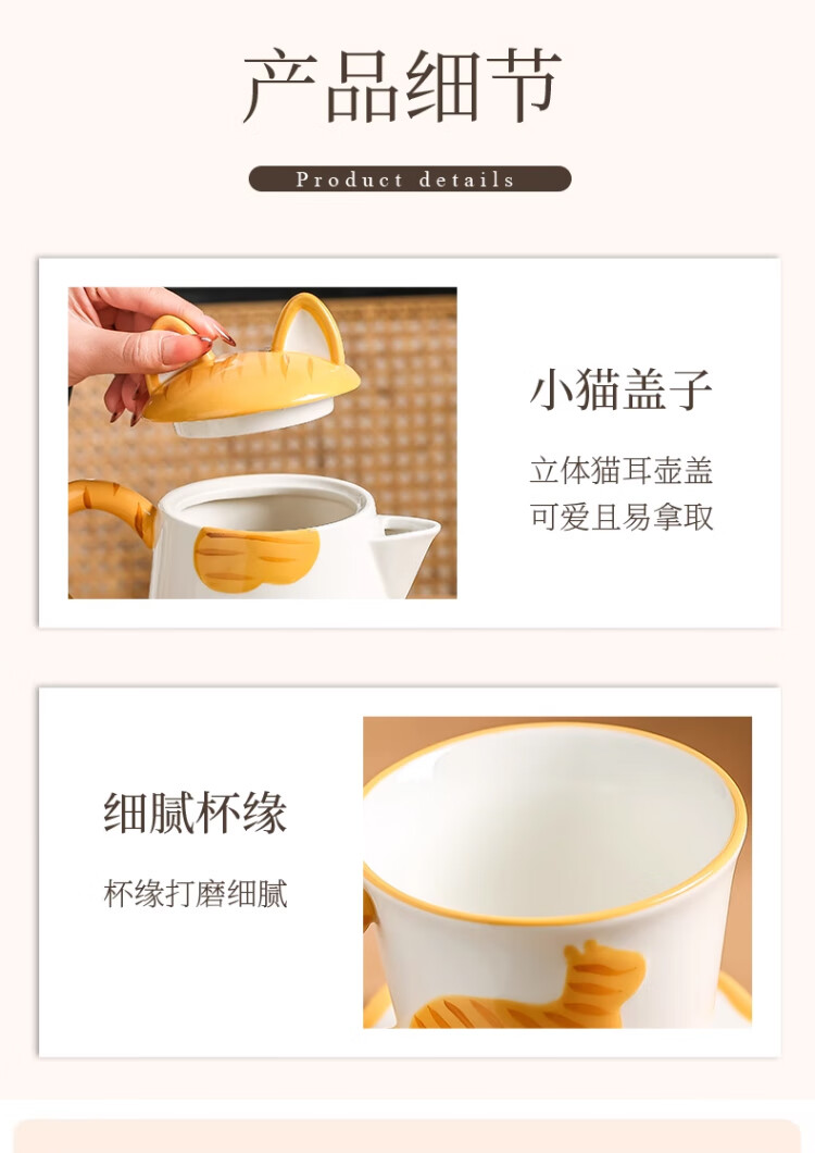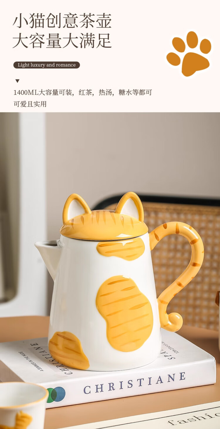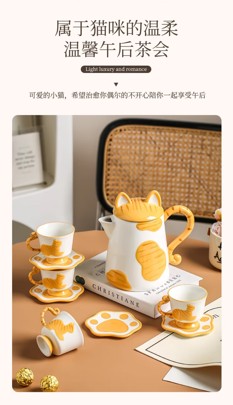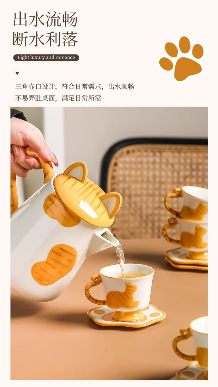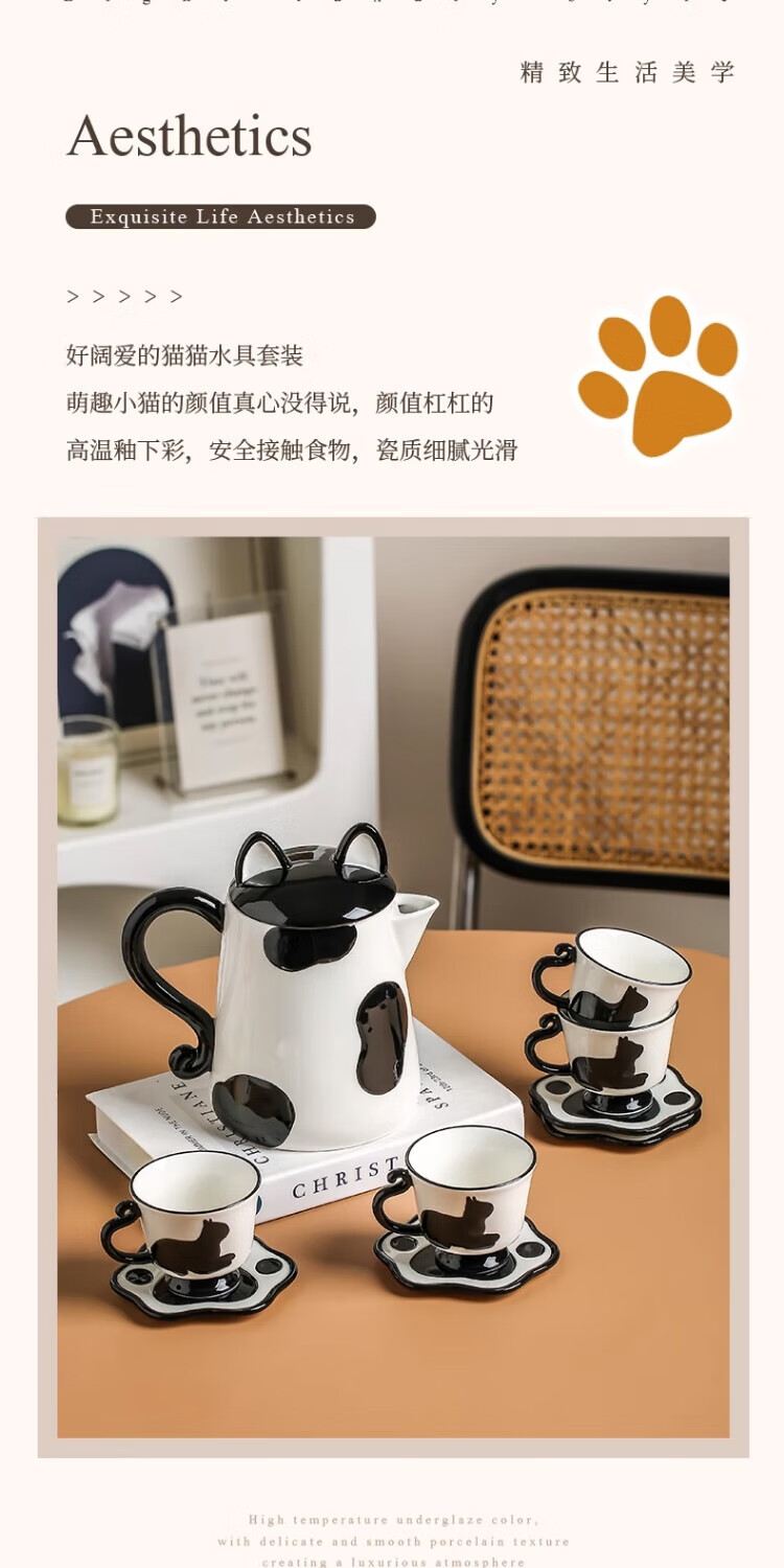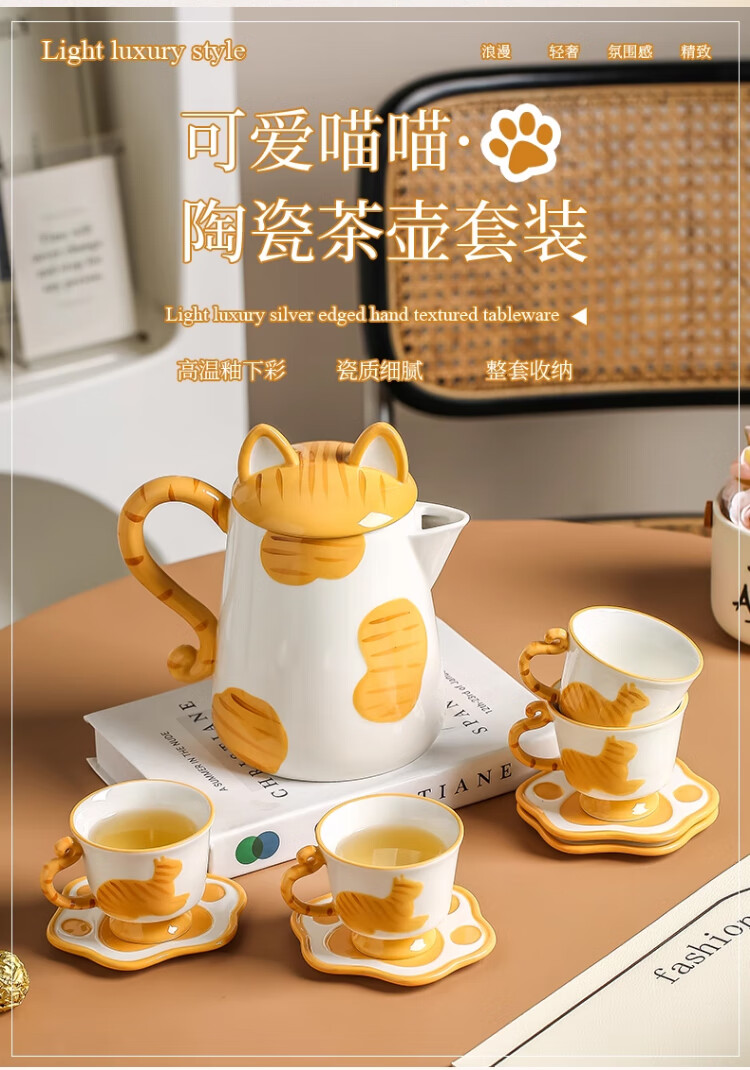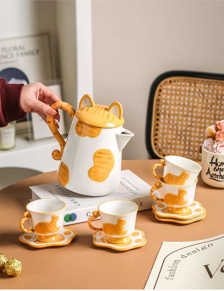 Qingbilin moves into a new home tea set ceramic cup kettle water set teapot afternoon tea wedding engagement gift for the newlyweds cat brown and white 5 pieces one pot two cups two saucers