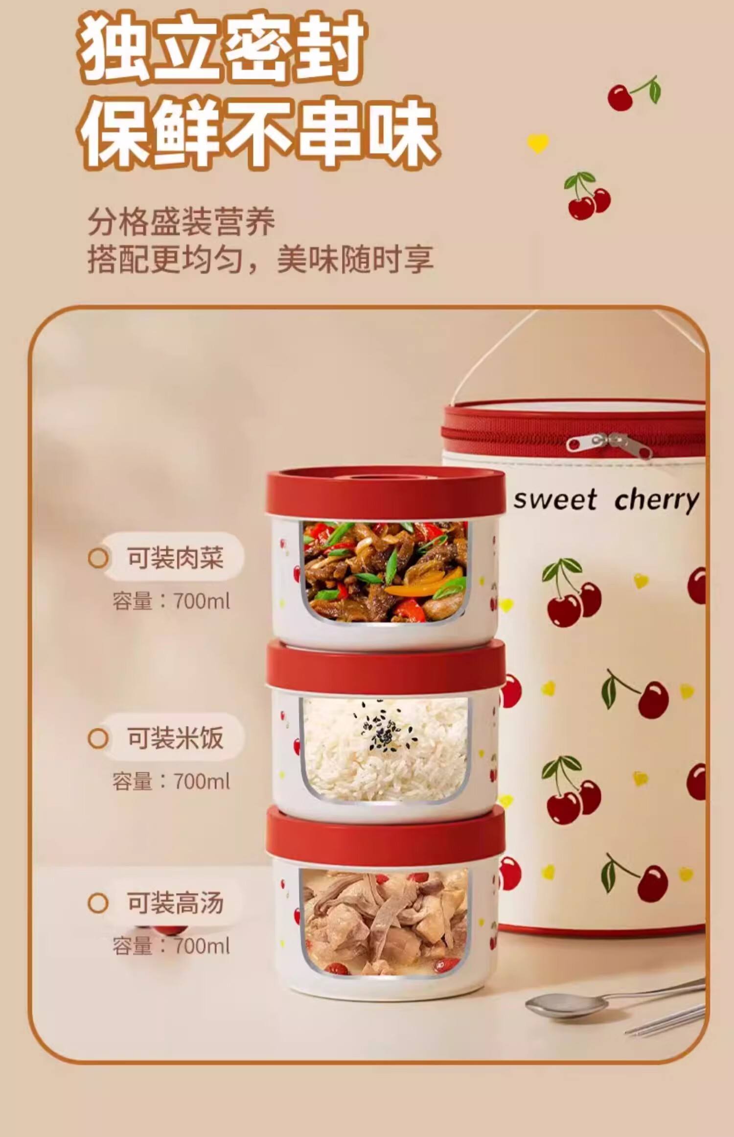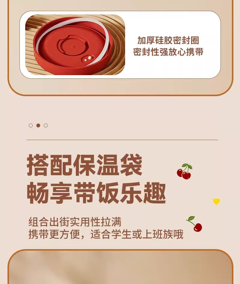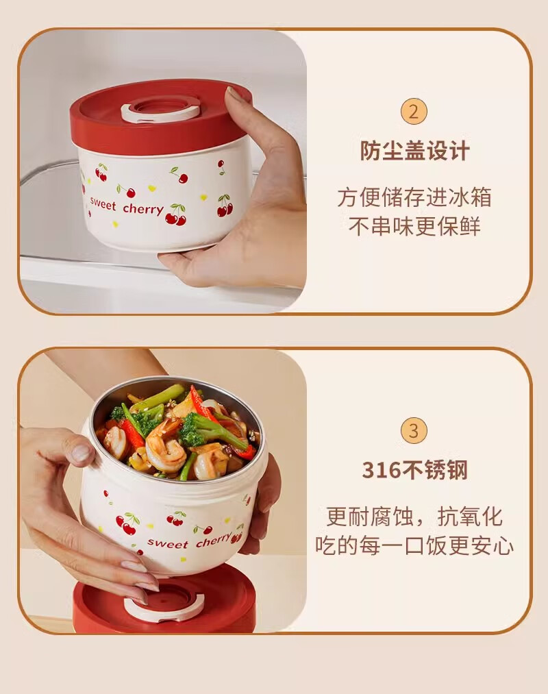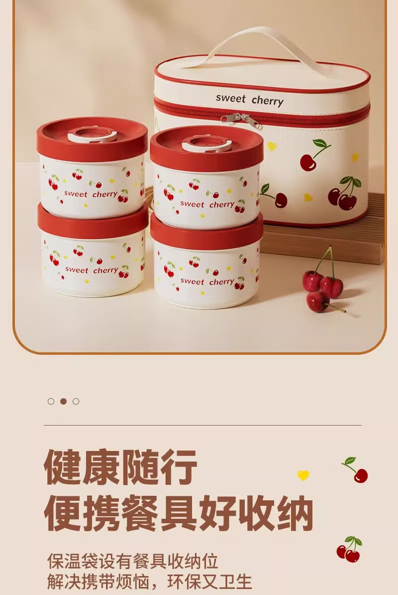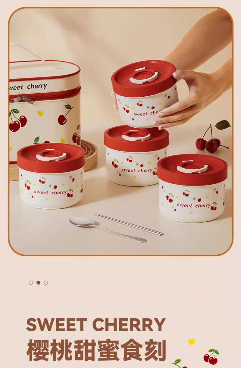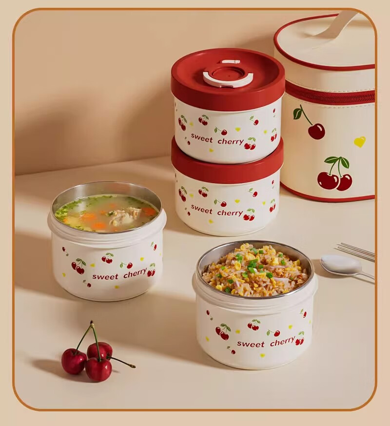 THERMOS Insulated Lunch Box Microwave Heated Office Lunch Box 2025 New Student Special Packed Lunch Box Bowl Three-Layer Cherry 2100ml + Insulation Bag